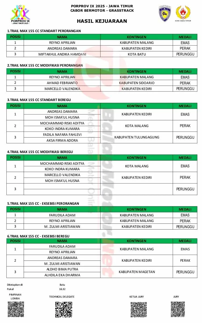 BalapMotor.Net – Berikut merupakan hasil juara gelaran Porprov IX – Jawa Timur Cabor bermotor (Grasstrack) yang berlangsung di Batu pada 20 Juni 2025. (**)