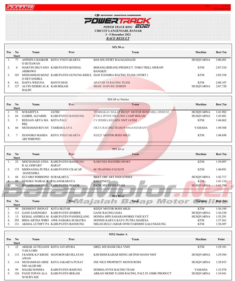 BalapMotor.Net – Berikut merupakan hasil juara dari gelaran Powertrack 2021 ronde kedua yang berlangsung di sirkuit Sport Center Langensari, Banjar-Jawa Barat pada 3-5 Desember 2021.