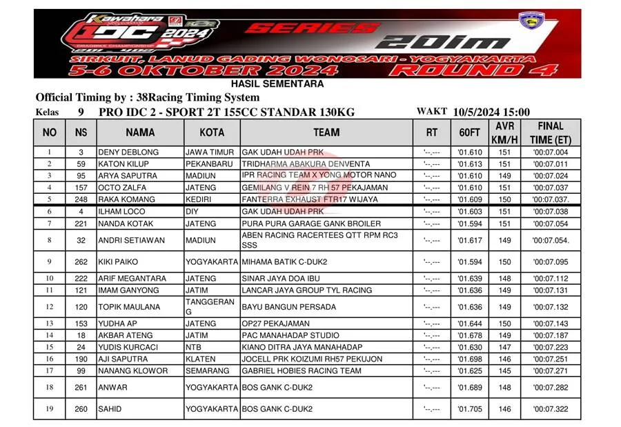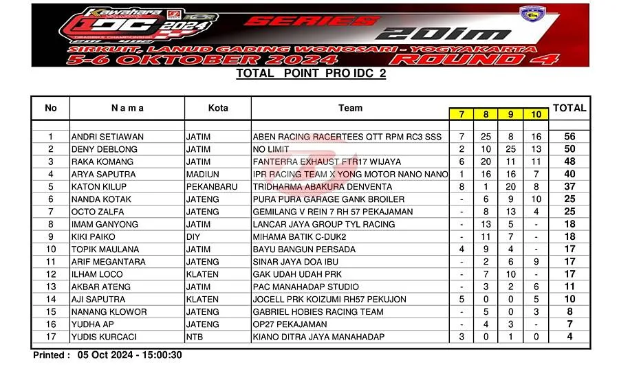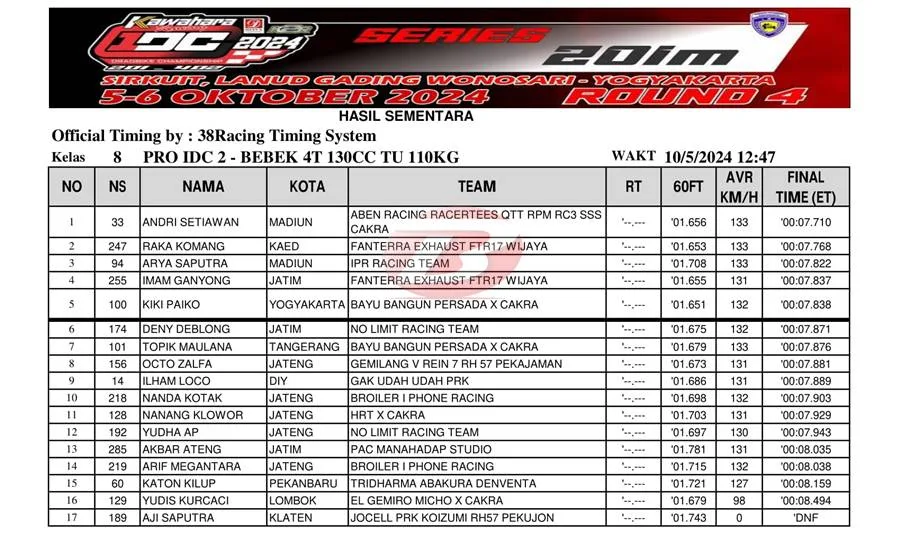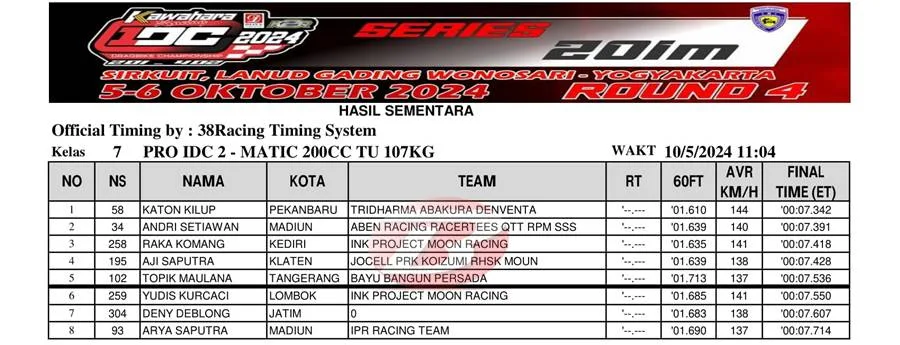 BalapMotor.Net – Berikut merupakan hasil final kategori kelas poin Pro IDC 2 ajang balap lurus Kawahara Djava K2R IDC Drag Bike Championship 2024 putaran keempat yang berlangsung di sirkuit NP. Lanud Gading Wonosari, Yogyakarta pada Sabtu 5 Oktober 2024. (***)