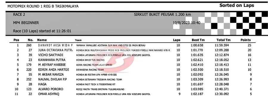 BalapMotor.Net – Berikut merupakan hasil Race 2 Kejurnas Motoprix Region B putaran 1 yang berlangsung di sirkuit Bukit Peusar, Tasikmalaya, Jawa Barat pada Minggu 8 Oktober 2023. (***)