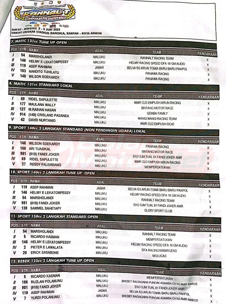 BalapMotor.Net – Berikut merupakan hasil juara dari gelaran Rannalt Racing Championship Kejurda Balap Motor IMI Maluku yang digelar di sirkuit NP Lingkar Stadion Mandala, Karpan-Kota Ambon, Maluku pada 2-4 Juni 2023. (Dwi)