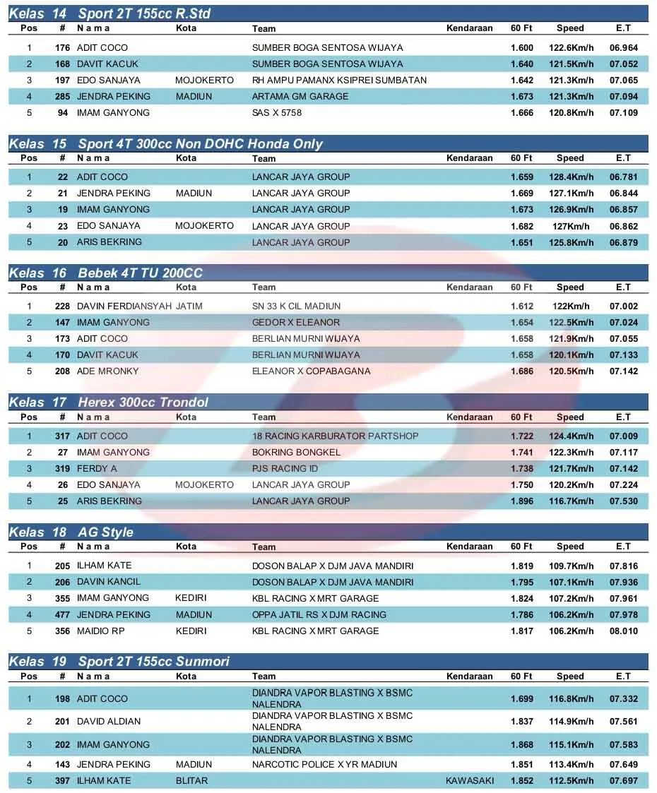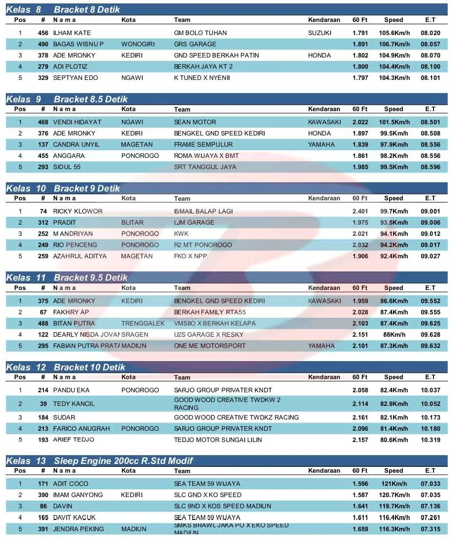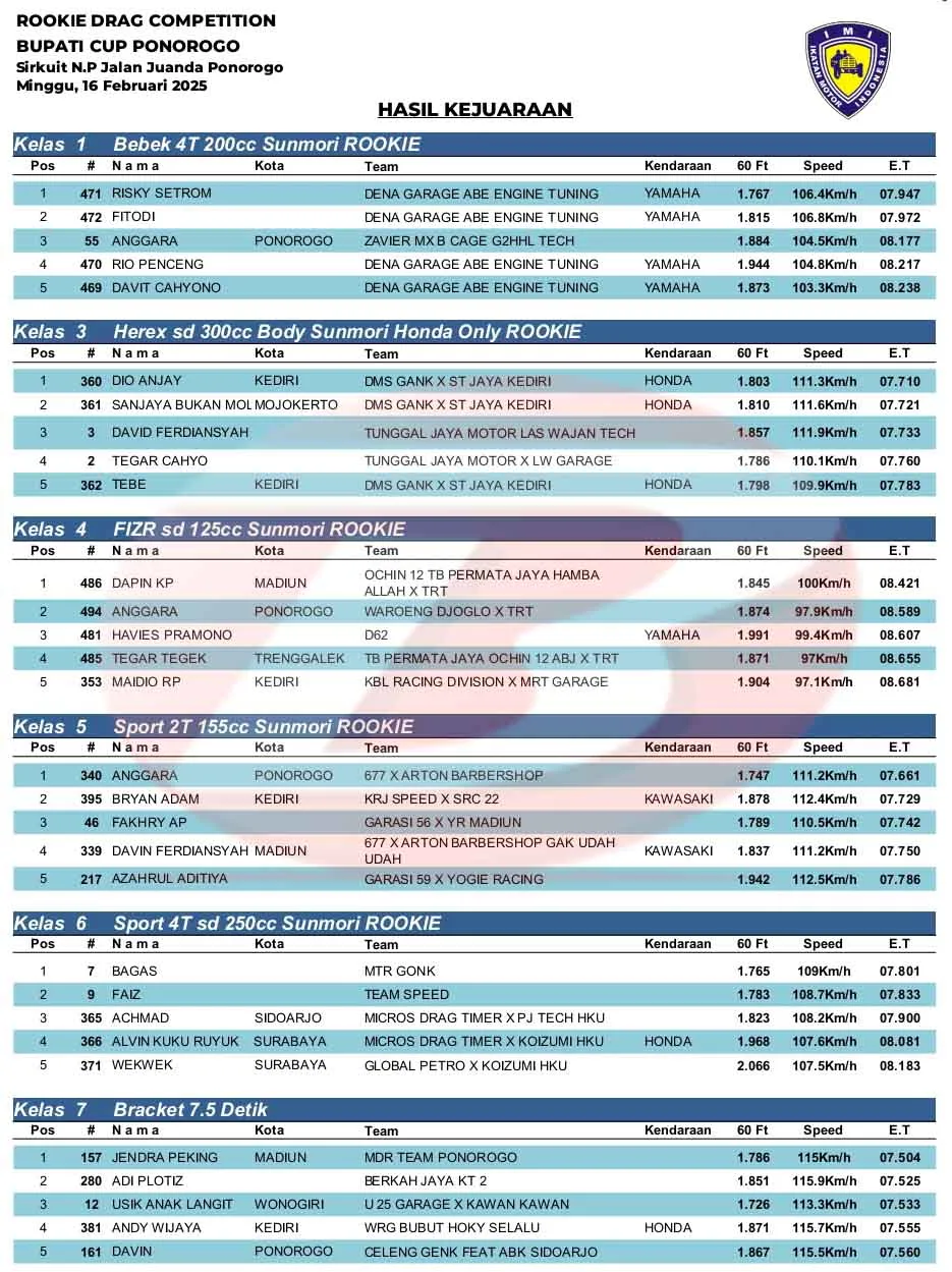BalapMotor.Net – Berikut merupakan hasil kejuaraan Rookie Drag Competition (RDC) Bupati Cup Ponorogo yang berlangsung di sirkuit NP. Jl. Juanda Ponorogo, Jawa Timur pada Minggu 16 Februari 2025. (**)