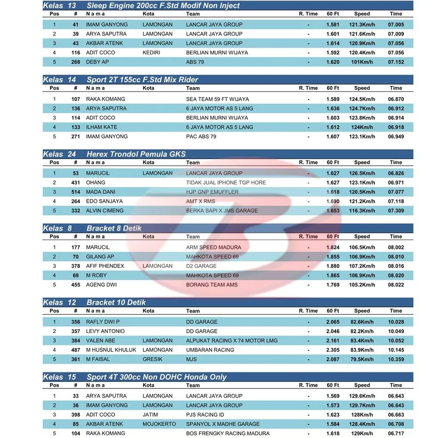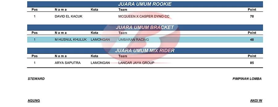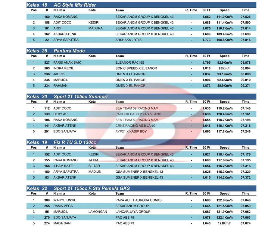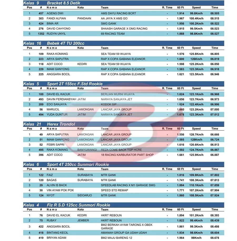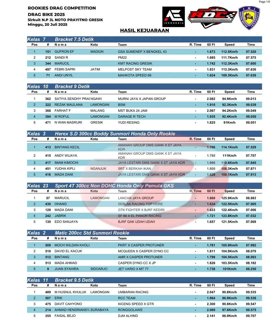 BalapMotor.Net – Berikut merupakan hasil kejuaraan balap lurus Rookies Drag Competition (RDC) Drag Bike yang berlangsung di sirkuit NP. Jl. Noto Prayitno Gresik, Jawa Timur pada 20 Juli 2025. (**)