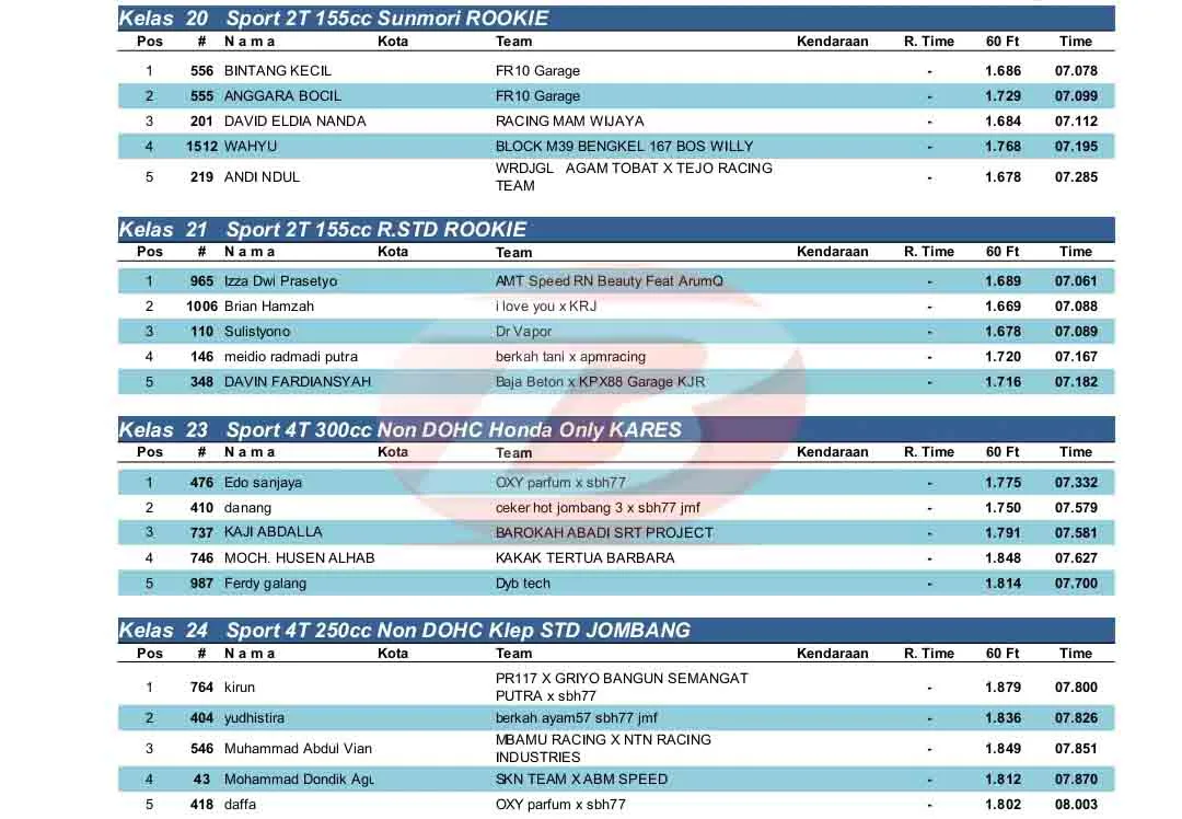 BalapMotor.Net – Berikut merupakan hasil kejuaraan balap lurus RDC Kapolres Jombang Cup Drag Bike Championship yang berlangsung di sirkuit NP. Jl. Dr. Sutomo, Jombang, Jawa Timur pada Minggu 18 Januari 2026. (**)