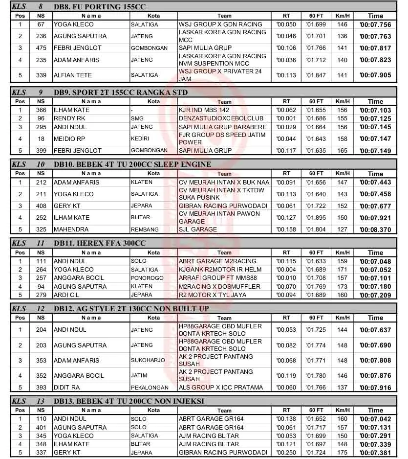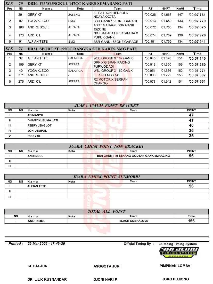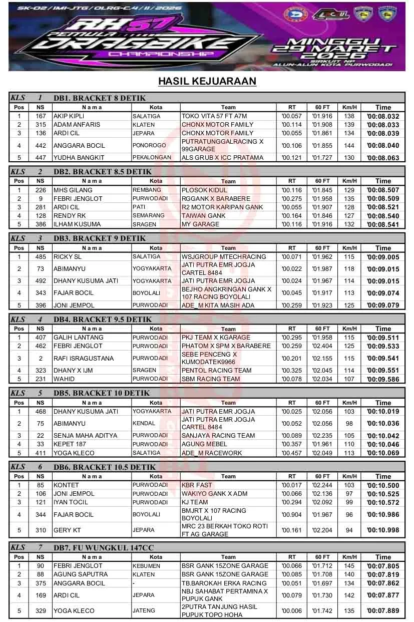 BalapMotor.Net – Berikut merupakan hasil kejuaraan balap lurus bertajuk RH57 Pemula Drag Bike Championship yang berlangsung di sirkuit NP. Alun-alun Purwodadi, Grobogan, Jawa Tengah pada Minggu 29 Maret 2026. (**)
