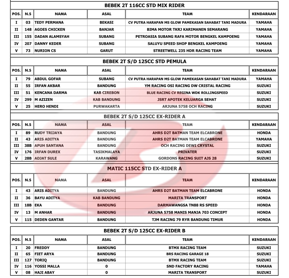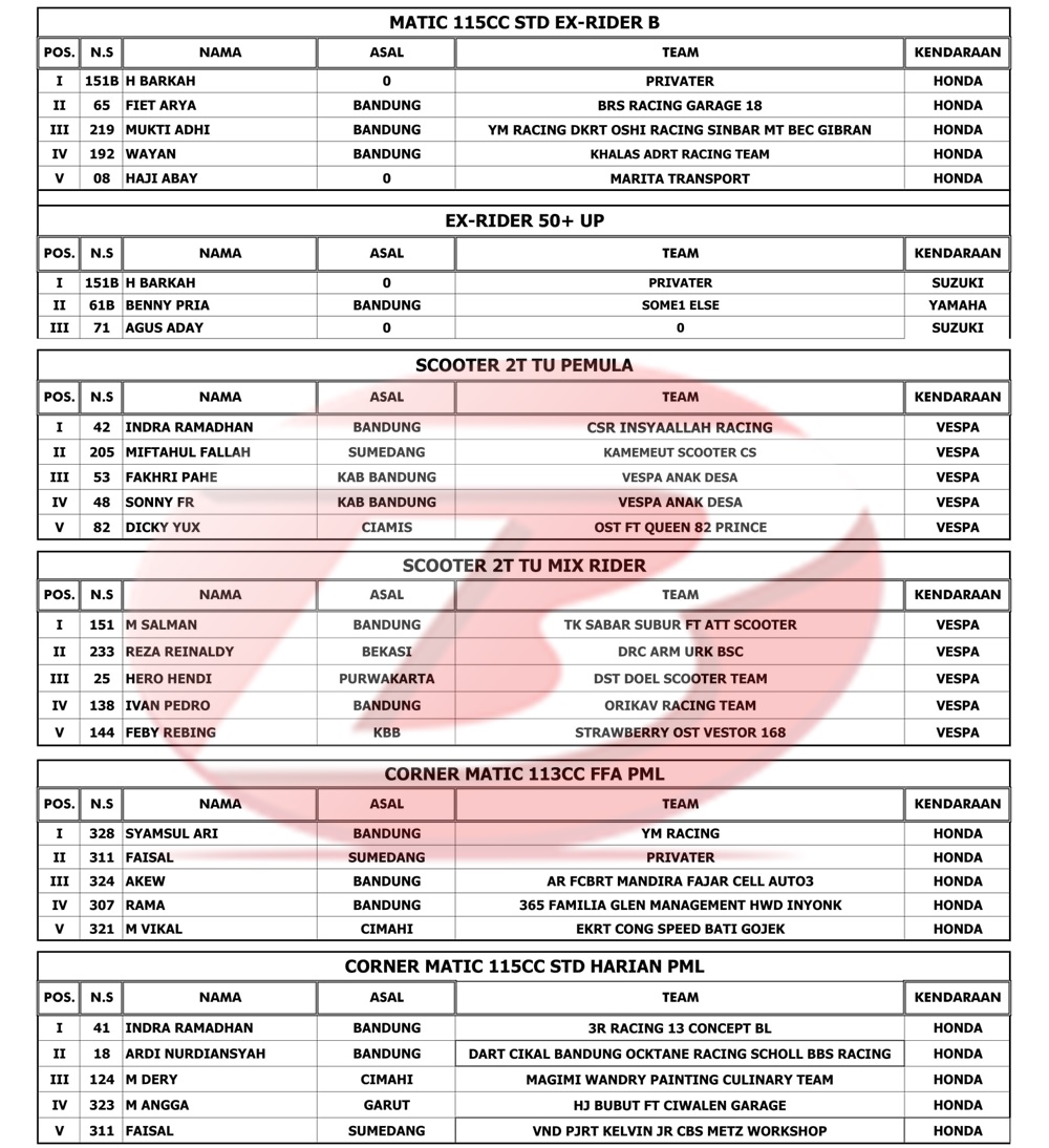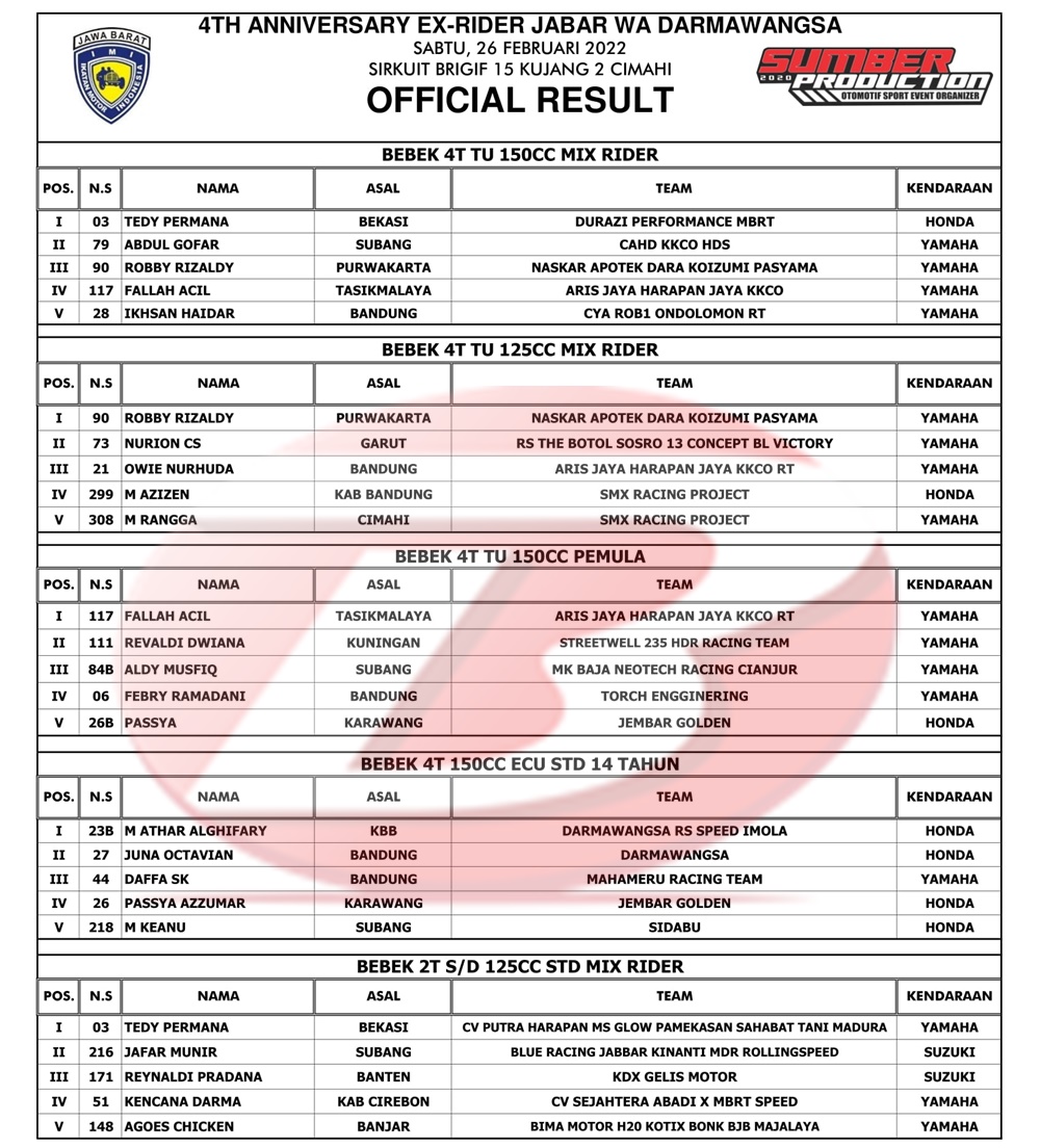 BalapMotor.Net – Berikut kami paparkan hasil lengkap kejuaraan 4Th Anniversary Ex-Rider Jabar yang berlangsung di sirkuit Brigif 15 Kujang II, Cimahi, Jawa Barat pada 25-26 Februari 2022.