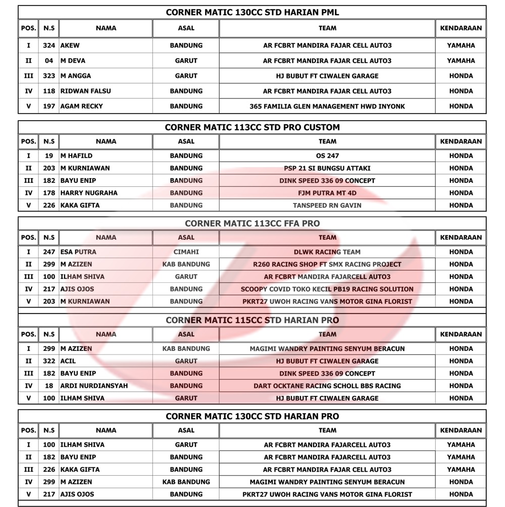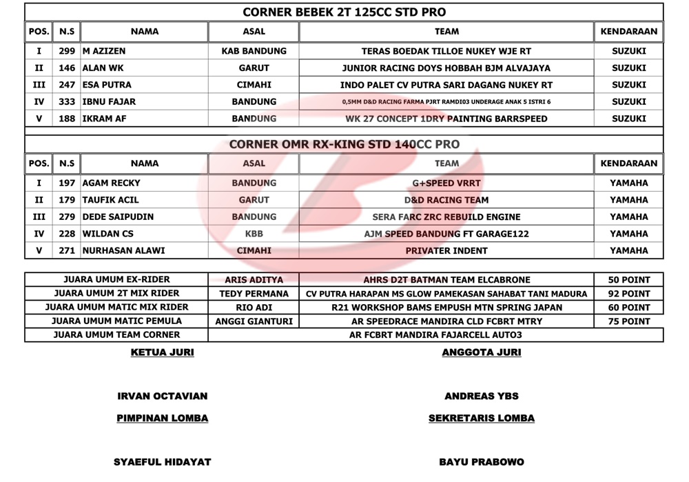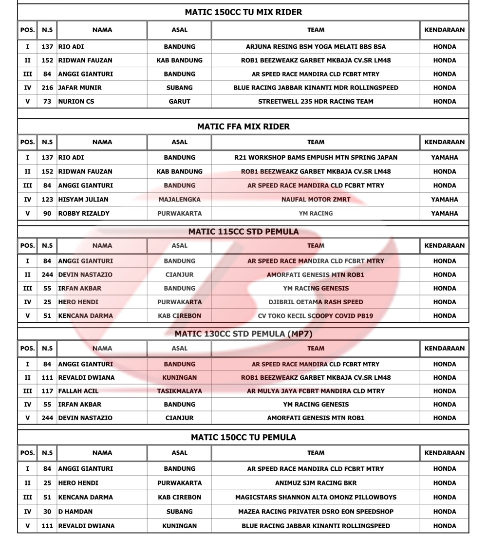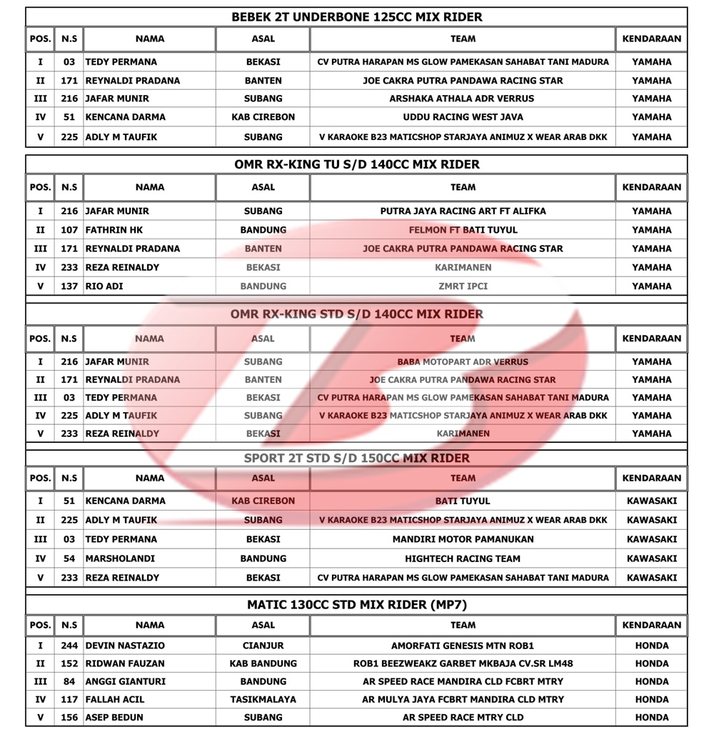 BalapMotor.Net – Berikut kami paparkan hasil lengkap kejuaraan 4Th Anniversary Ex-Rider Jabar yang berlangsung di sirkuit Brigif 15 Kujang II, Cimahi, Jawa Barat pada 25-26 Februari 2022.