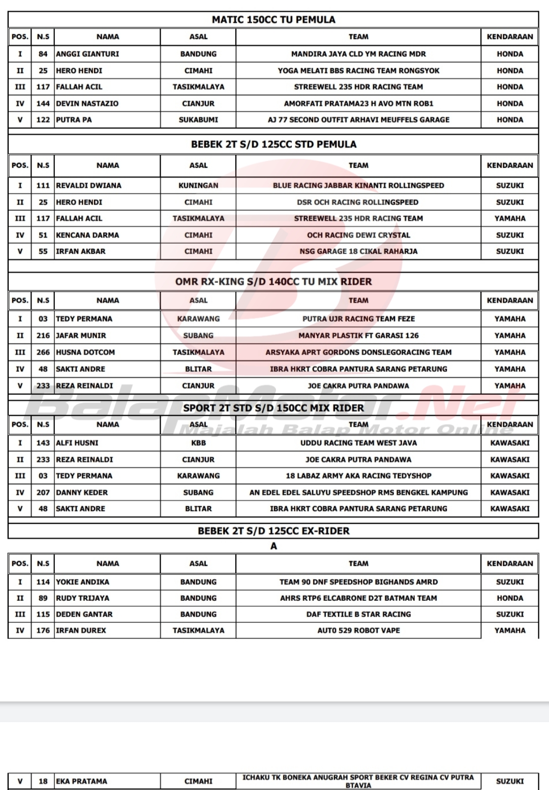 Hasil Juara Road Race Corner Race Sumber Production Cimahi 1-2 Oktober 2021