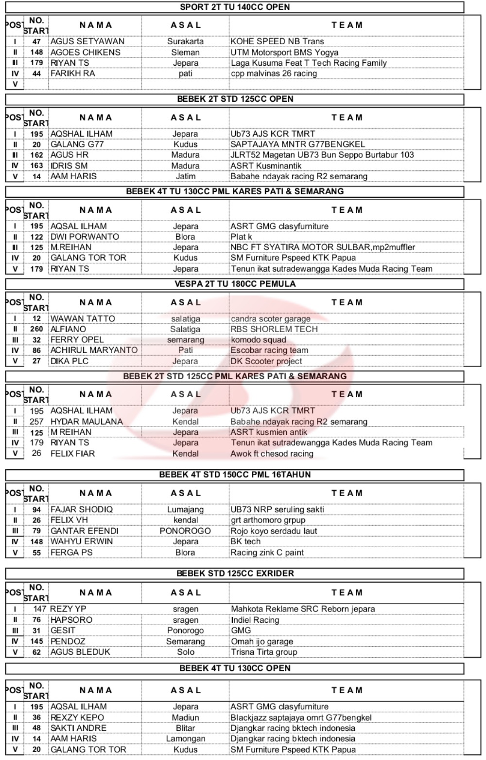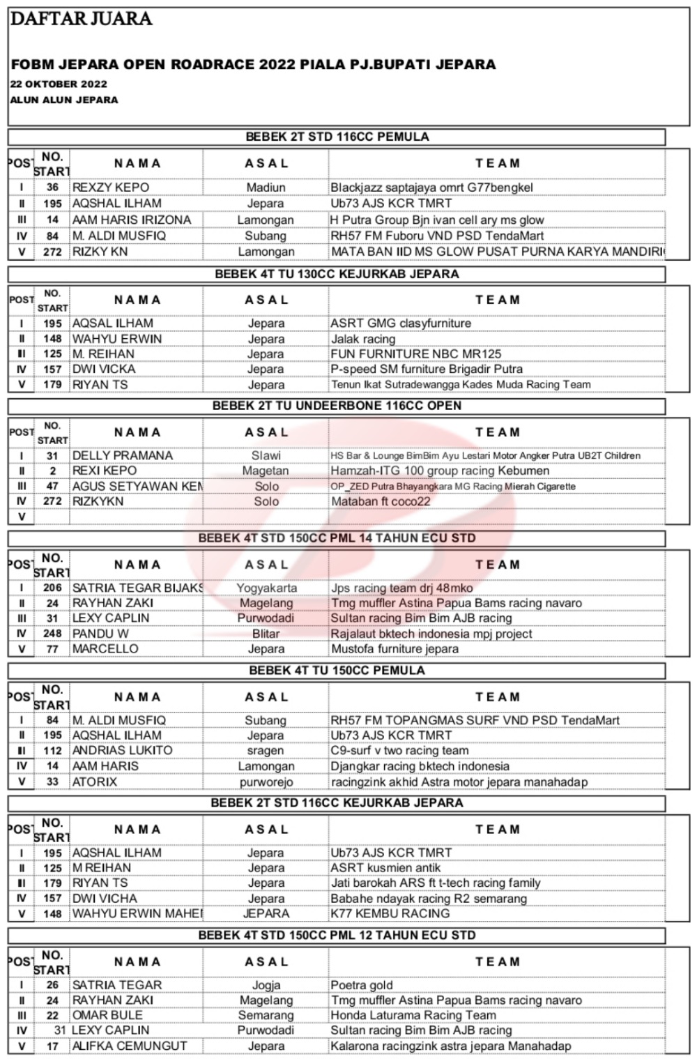 Hasil Juara Road Race Jepara 22 Oktober 2022Penulis Yugo Aol - 22/10/2022 BalapMotor.Net – Berikut merupakan hasil kejuaraan Piala PJ. Bupati Jepara FOBM Jepara Open Road Race 2022 yang berlangsung di sirkuit NP. Alun-alun Jepara, Jawa Tengah pada Sabtu 22 Oktober 2022.