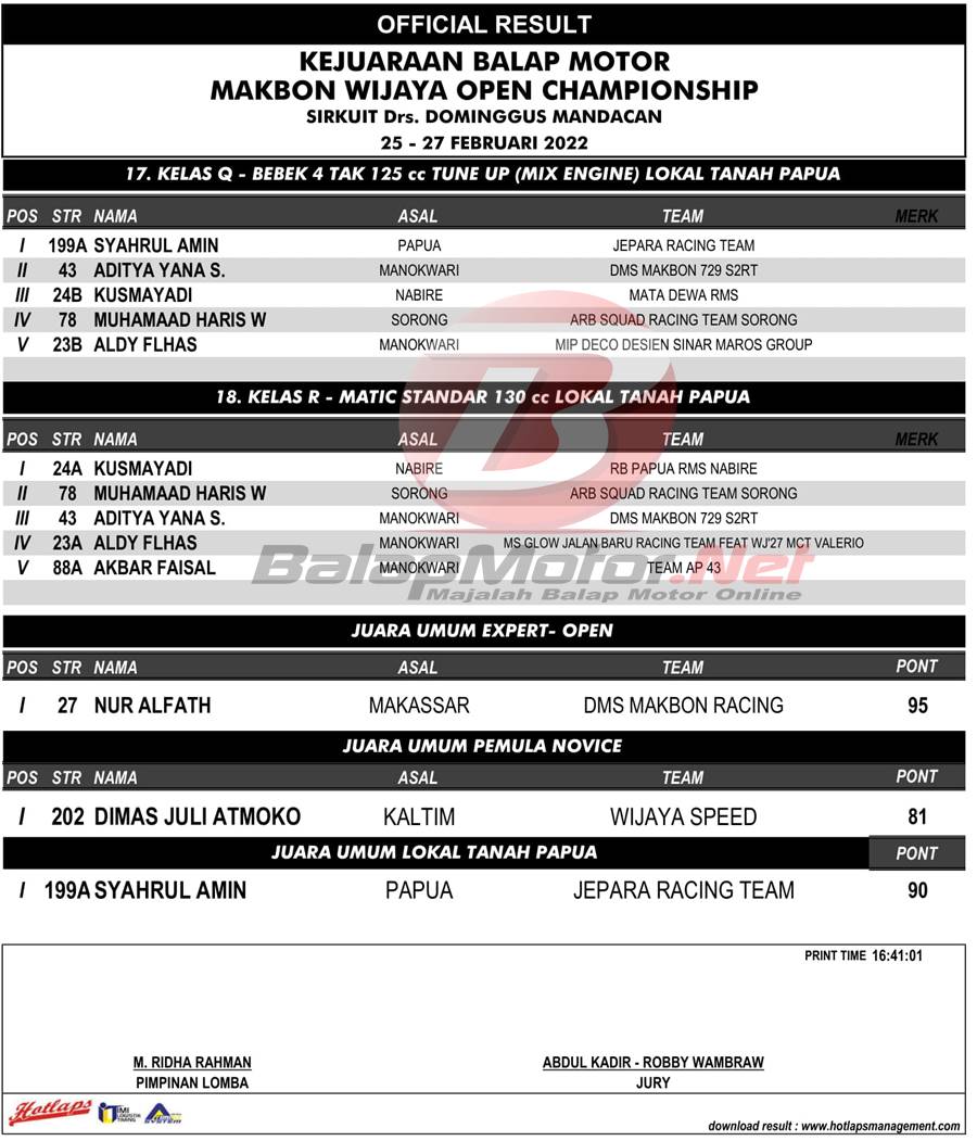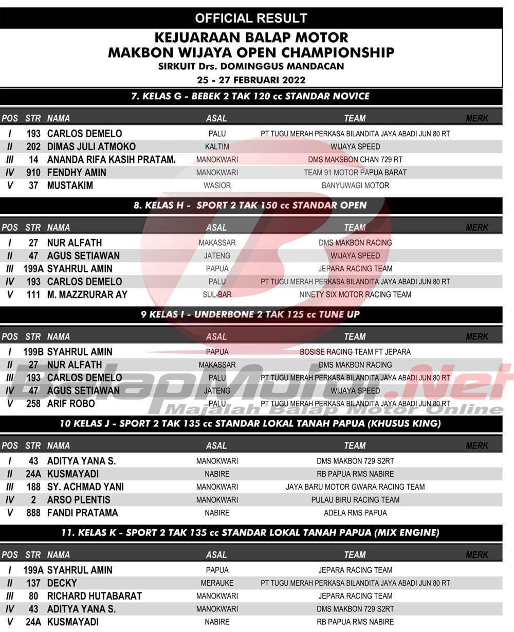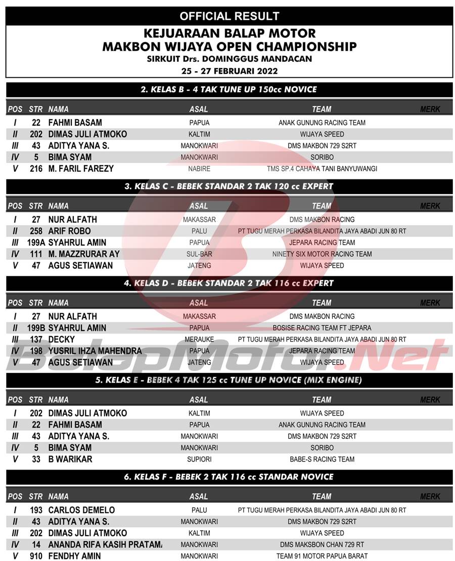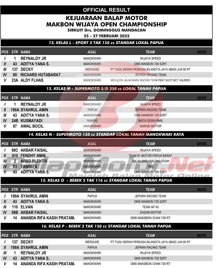BalapMotor.Net – Berikut merupakan hasil official dari gelaran Balap Motor Makbon Wijaya Open Championship yang berlangsung di sirkuit Drs. Dominggus Mandacan, Manokwari, Papua Barat pada 25-27 Februari 2022. | Pace