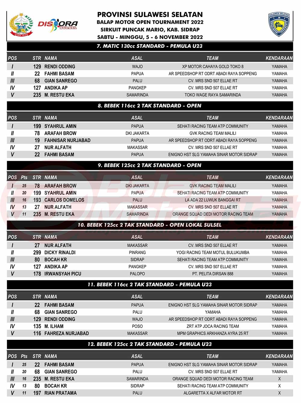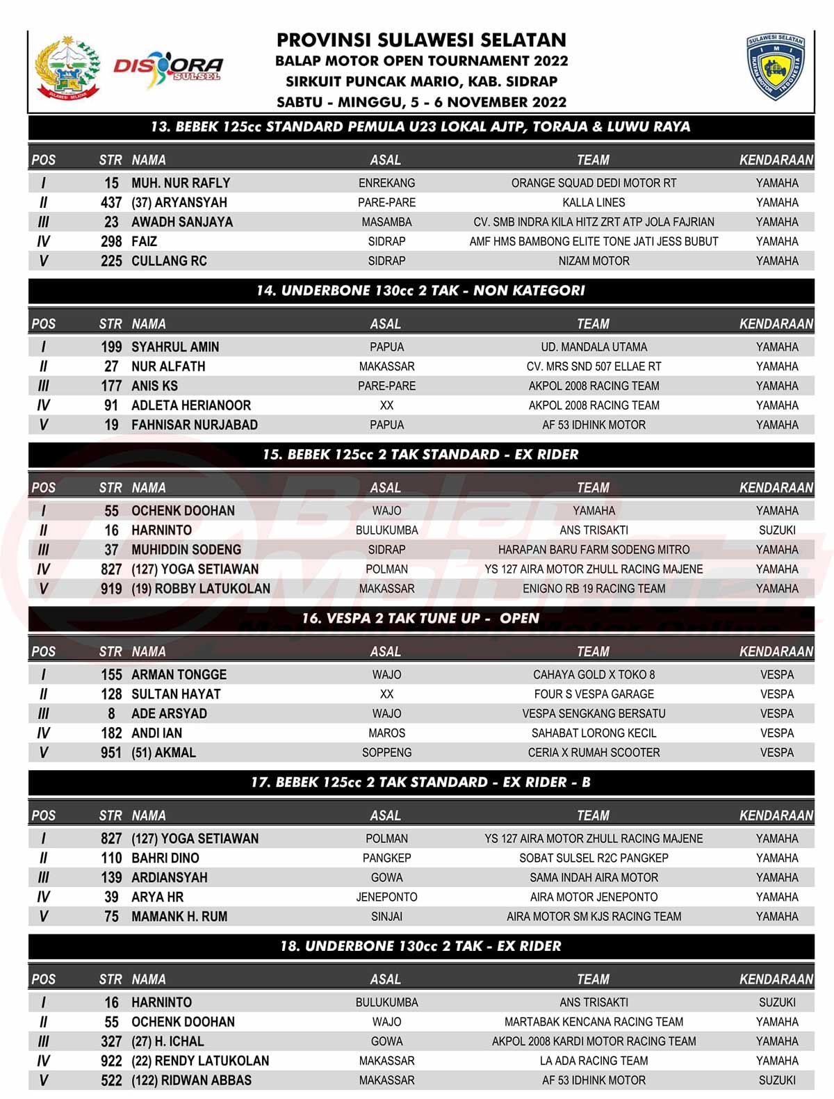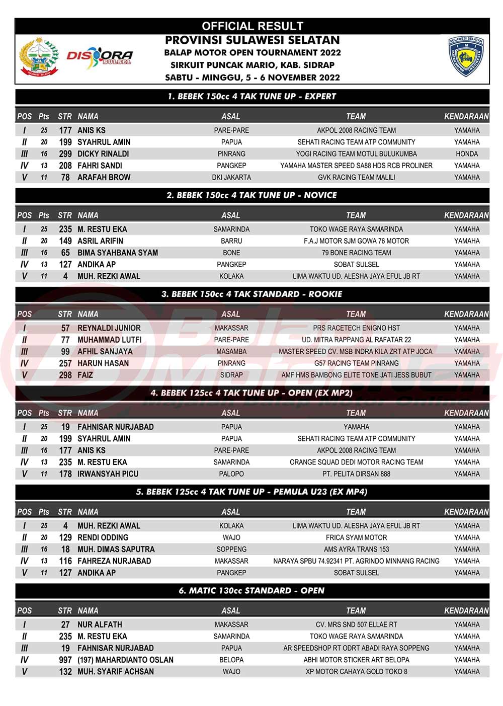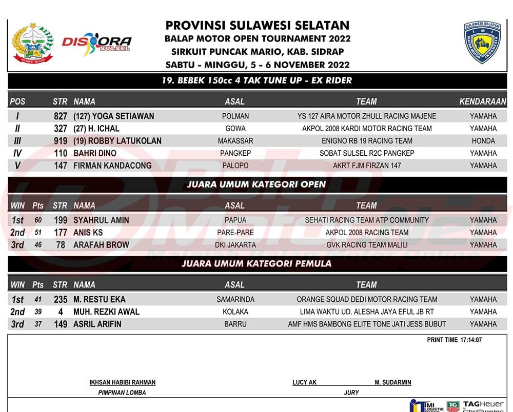 BalapMotor.Net – Berikut merupakan hasil juara resmi dari gelaran Provinsi Sulawesi Selatan Balap Motor Open Tournament 2022 yang berlangsung di sirkuit Puncak Mario, Kabupaten Sidrap pada 5-6 November 2022. |MMudianto