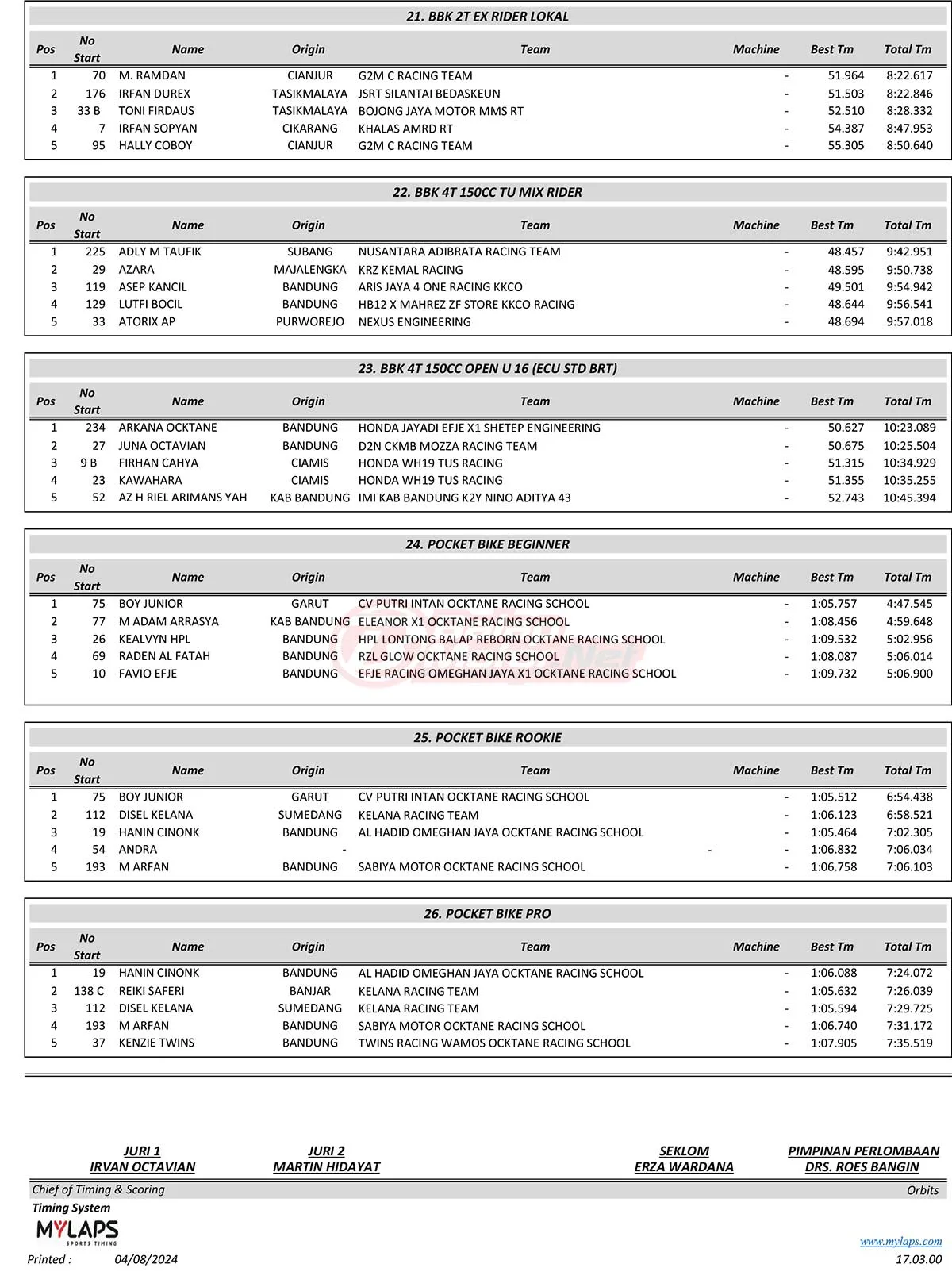BalapMotor.Net – Berikut merupakan hasil juara dari gelaran Motul YM Racing Matic Cup Prix Piala Bupati Championship 1 yang berlangsung di sirkuit NP Stadion Si Jalak Harupat, Soreang, Kabupaten Bandung, Jawa Barat pada hari Sabtu-Minggu 3-4 Agustus 2024. (**)