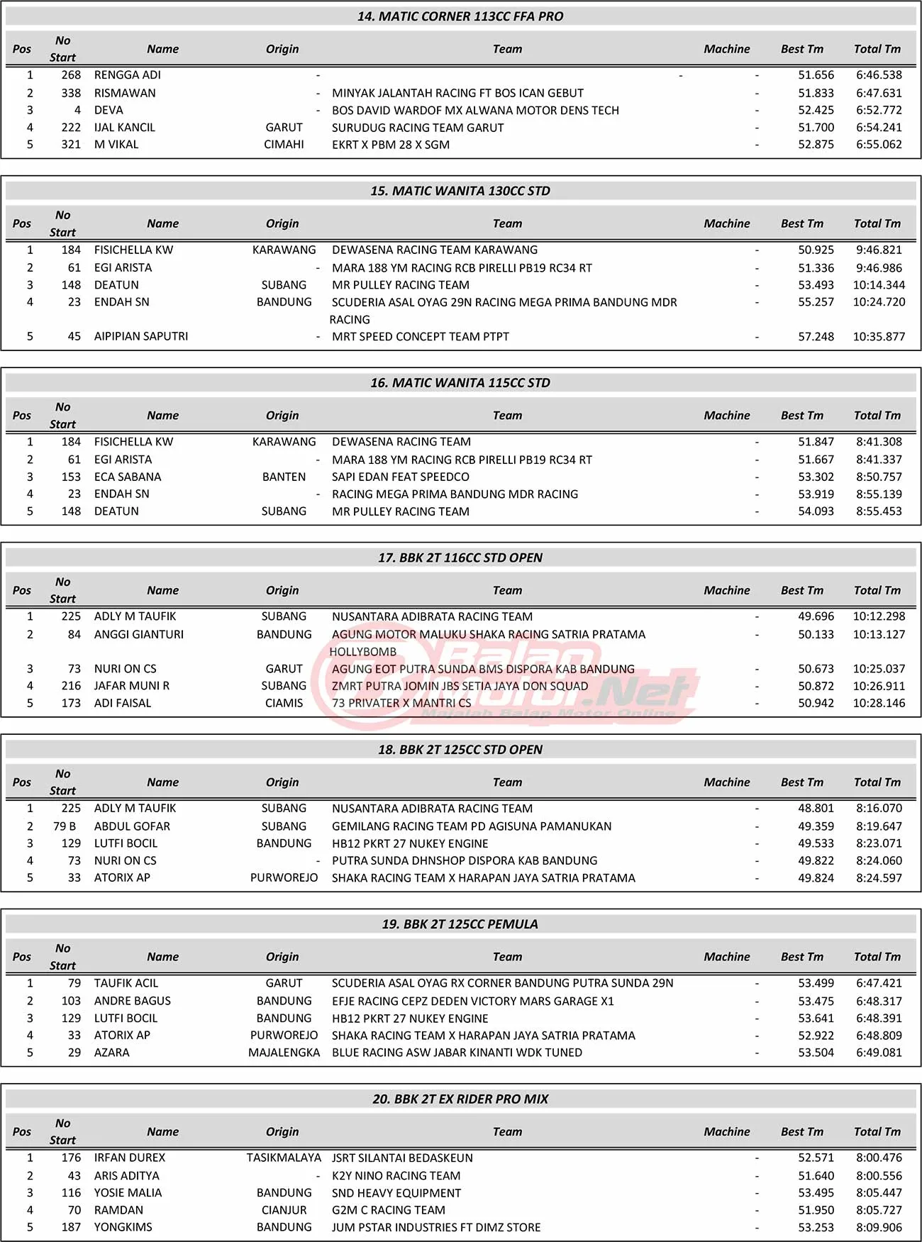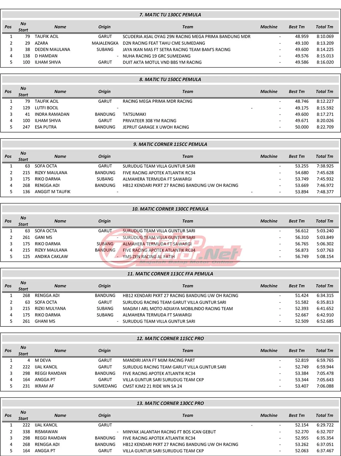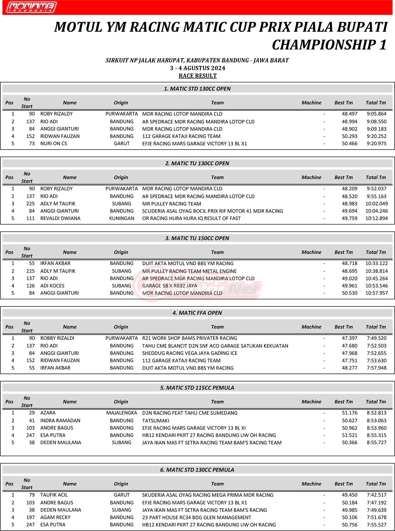 BalapMotor.Net – Berikut merupakan hasil juara dari gelaran Motul YM Racing Matic Cup Prix Piala Bupati Championship 1 yang berlangsung di sirkuit NP Stadion Si Jalak Harupat, Soreang, Kabupaten Bandung, Jawa Barat pada hari Sabtu-Minggu 3-4 Agustus 2024. (**)