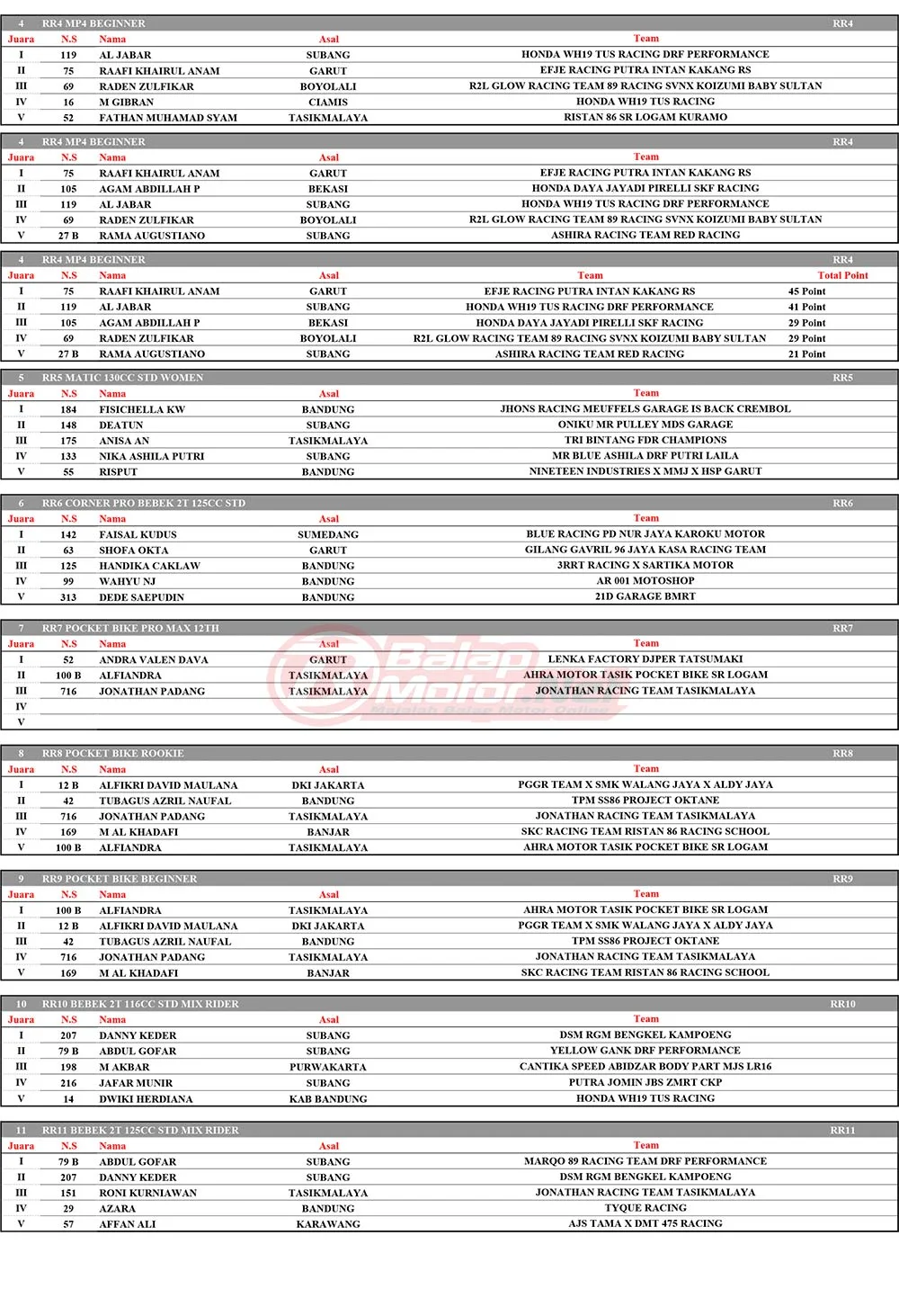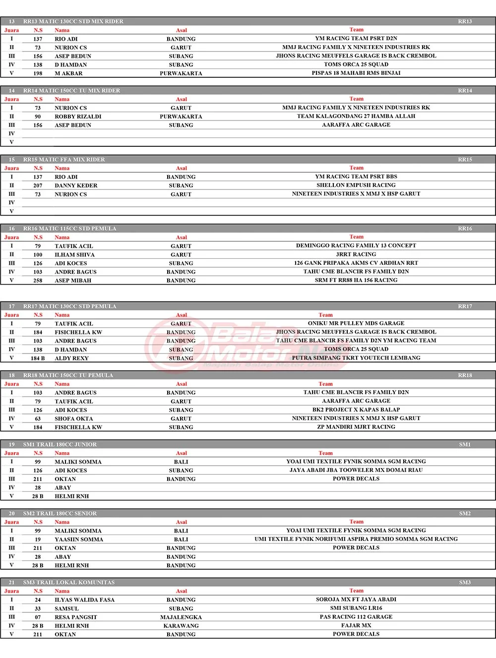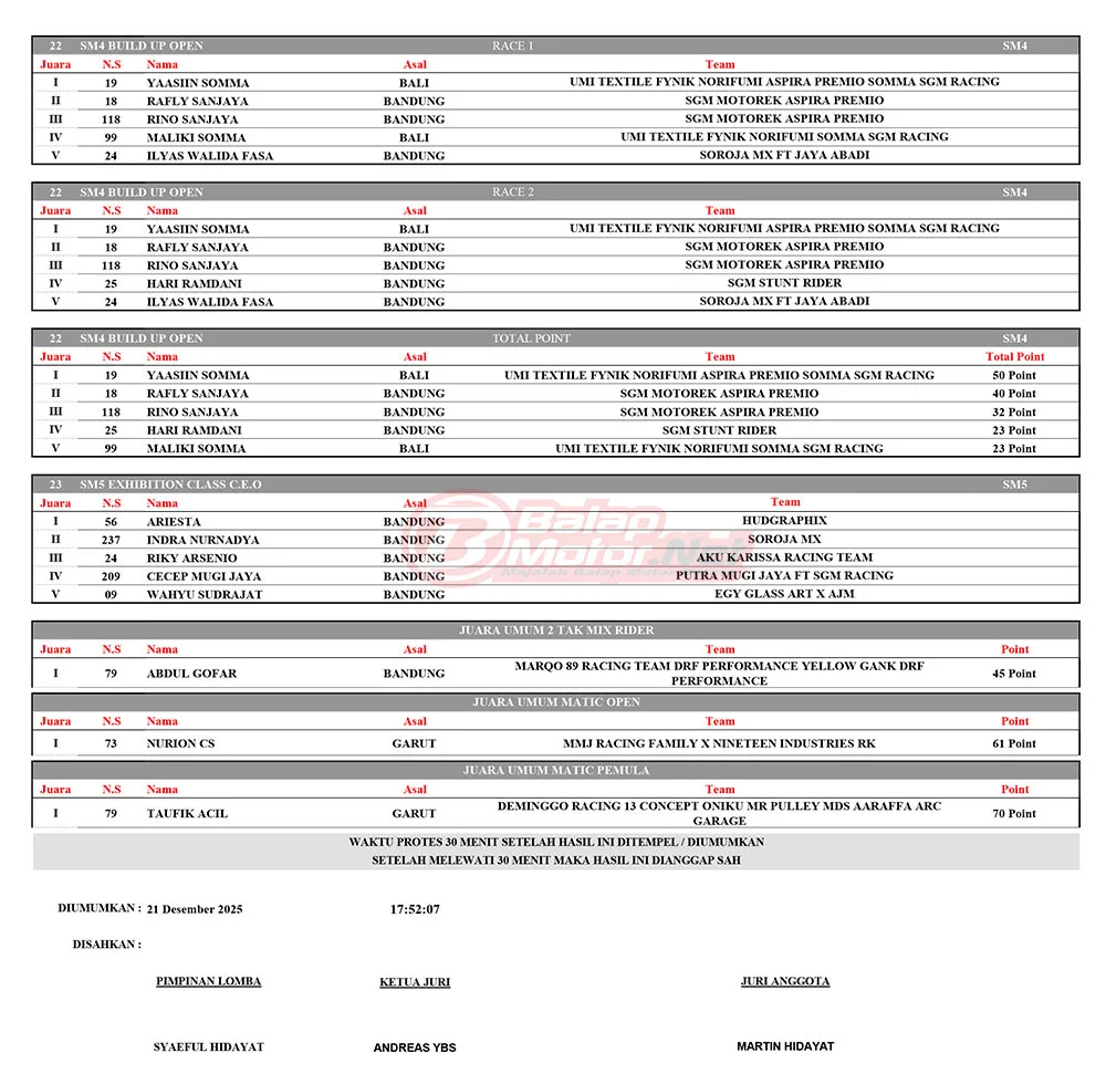 BalapMotor.Net – Berikut merupakan hasil juara dari gelaran TUS Racing ronde final Kejurda Balap Motor Jawa Barat serta ronde 2 Kejurda Supermoto 2025 yang berlangsung di sirkuit Gery Mang, Subang pada 20-21 Desember 2025. (**)