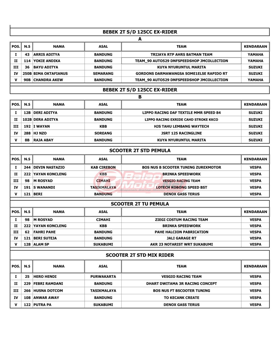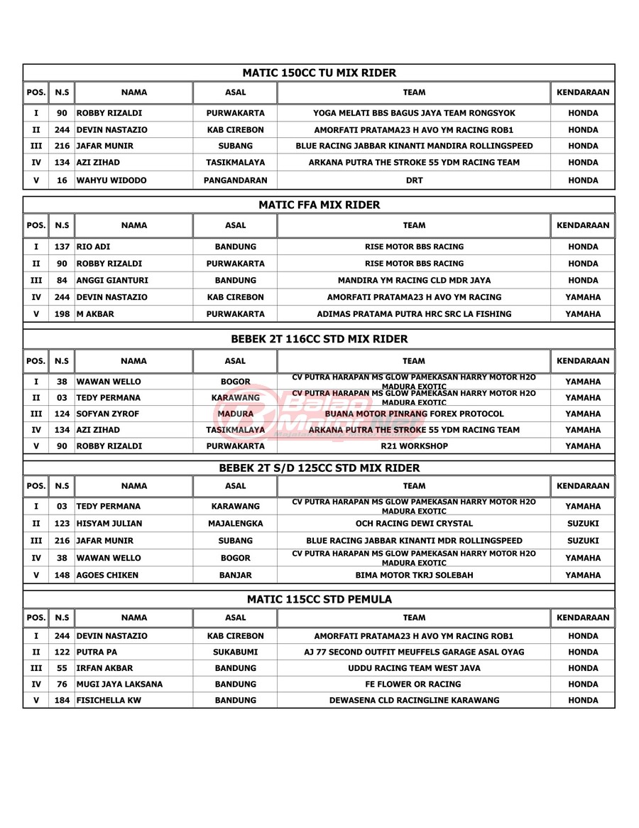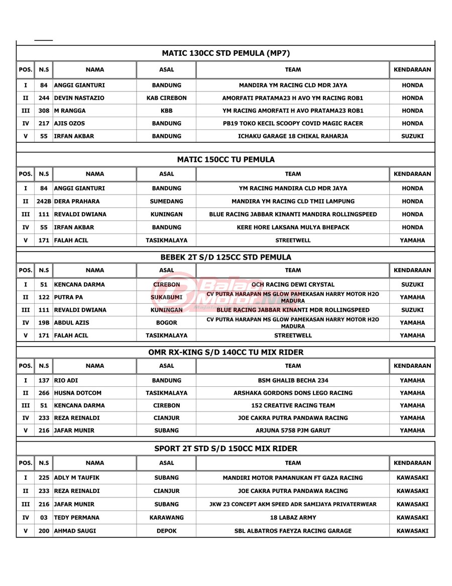 BalapMotor.Net – Berikut merupakan hasil juara dari gelaran RTP Sumber Production Championship yang berlangsung di sirkuit Brigif 15 Kujang II Cimahi, Jawa Barat pada 6 November 2021.