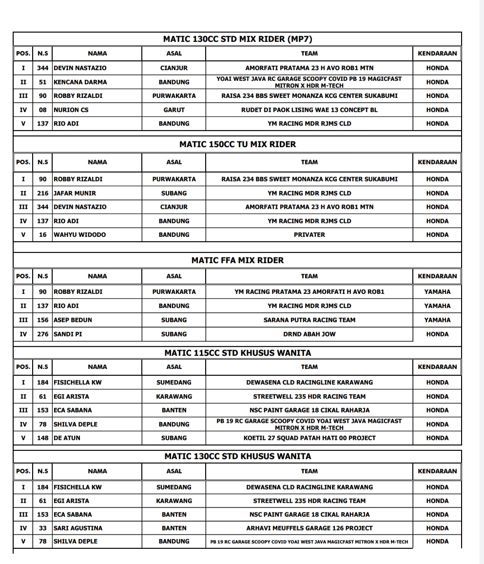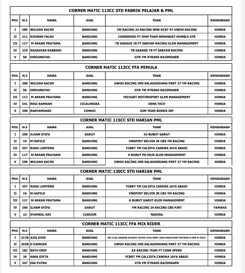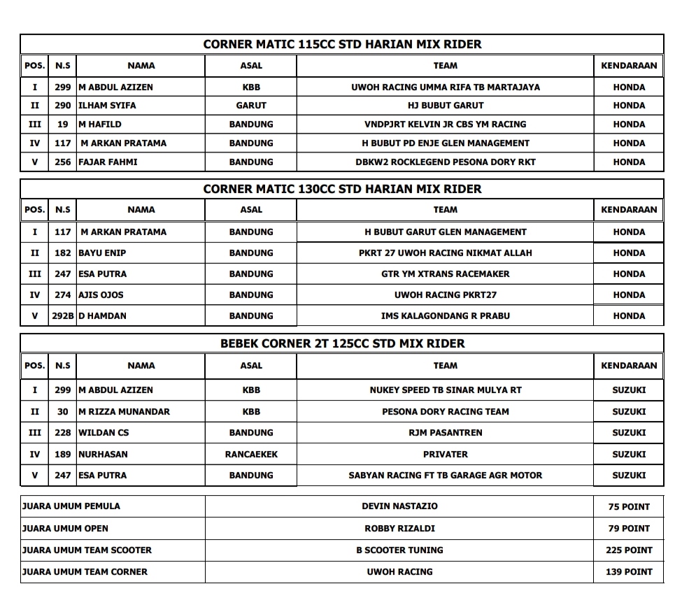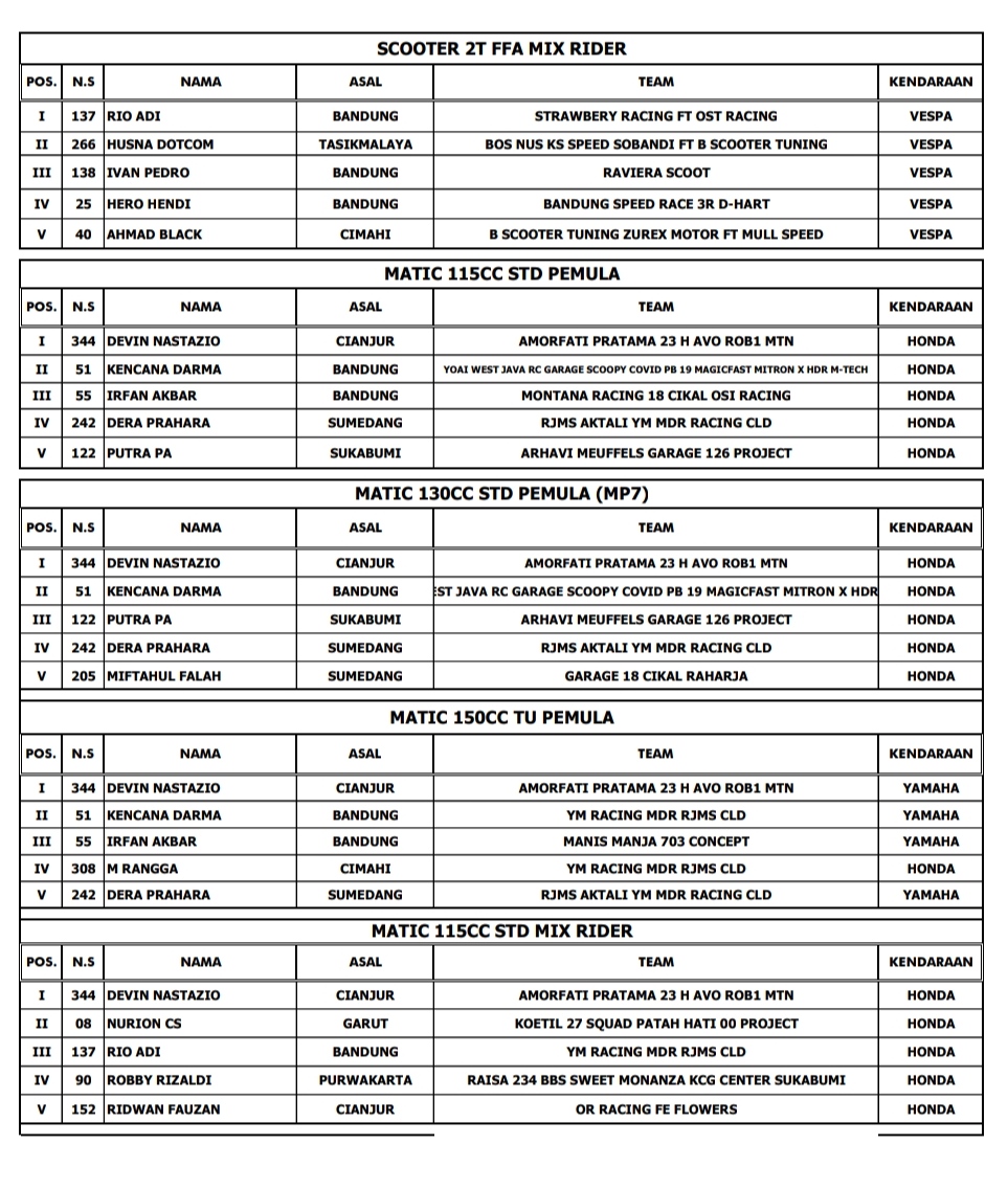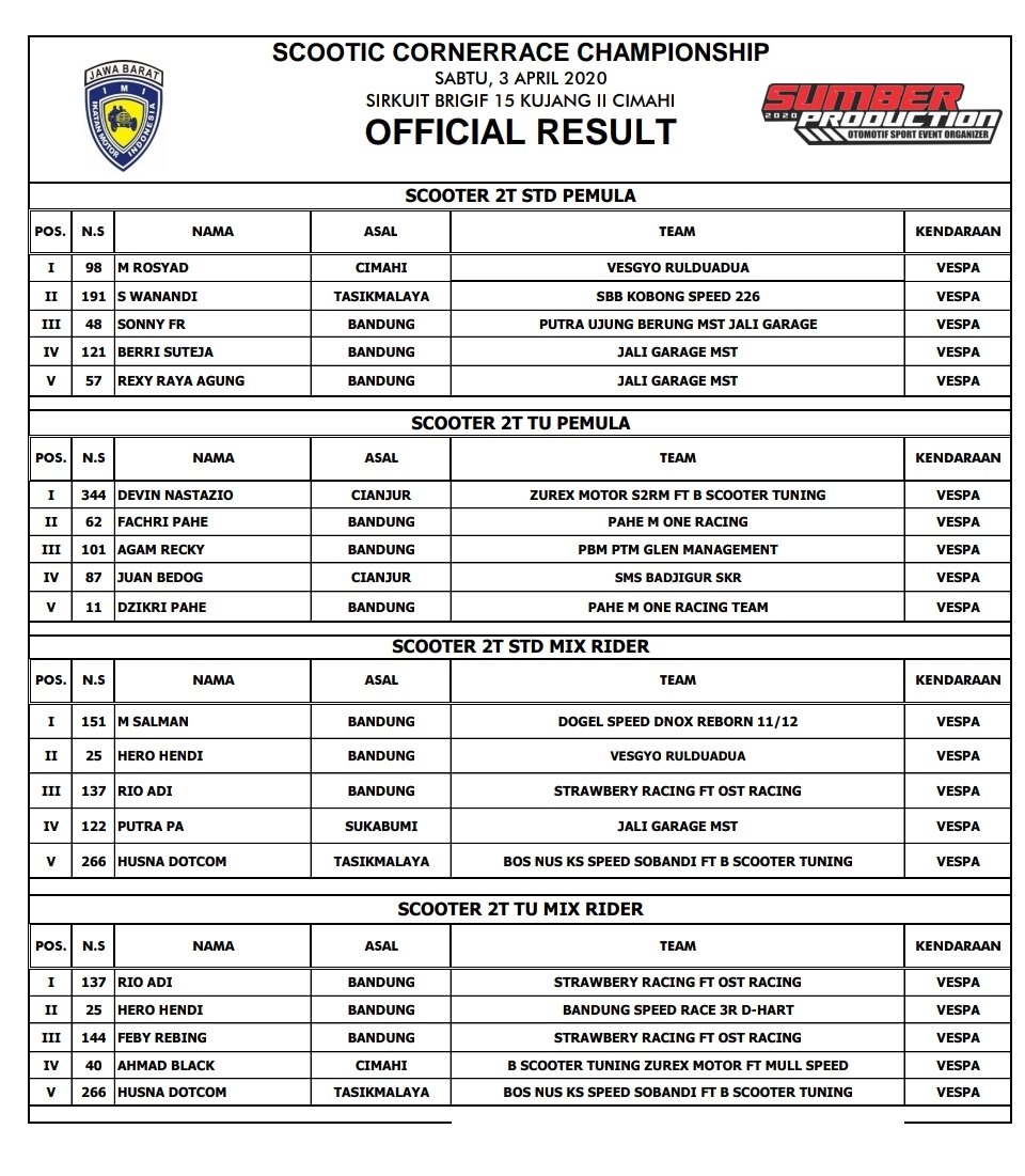 Hasil Juara Scootic Corner Race Championship Cimahi 2021Penulis BalapMotor.net - 03/04/2021Foto dok BM BalapMotor.Net – Berikut merupakan hasil juara dari gelaran Scootic Corner Race Championship 2021 yang berlangsung di sirkuit Brigif 15 Kujang II Cimahi, Jawa Barat pada 3 April 2021.