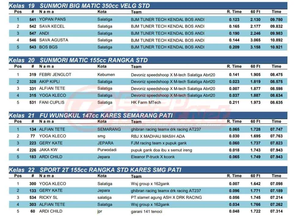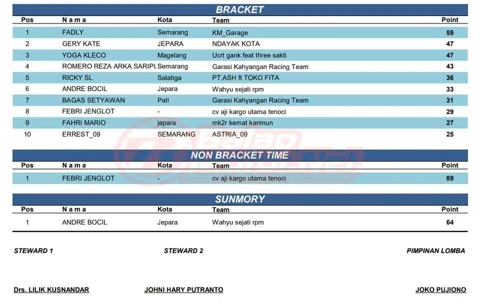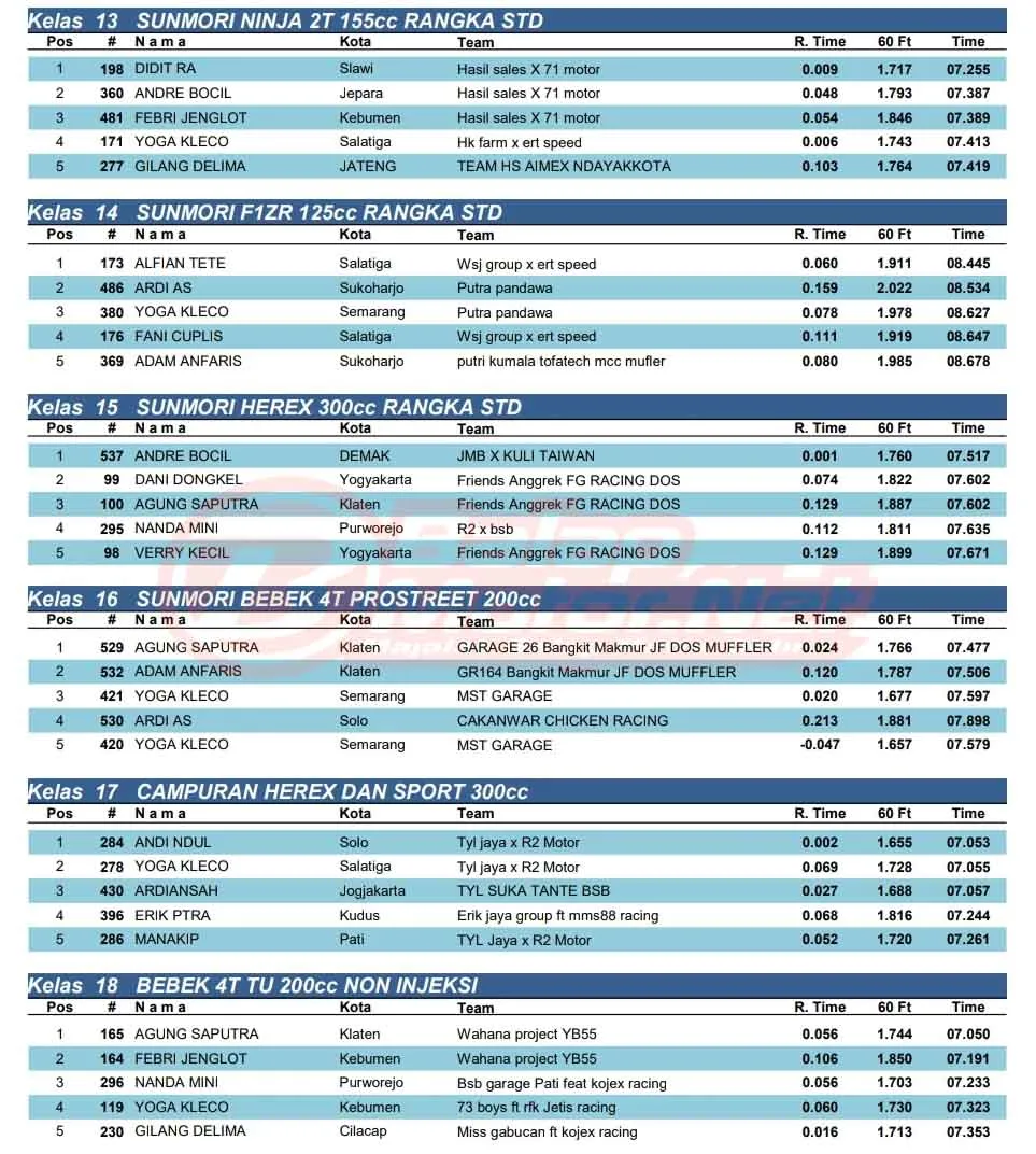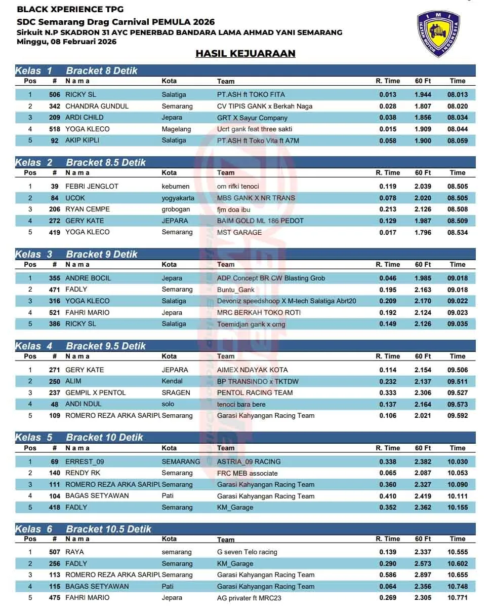 BalapMotor.Net – Berikut merupakan hasil kejuaraan balap lurus Black Xperience TPG Semarang Drag Carnival (SDC) pemula 2026 yang berlangsung di sirkuit NP. Skadron 31 AYC Bandara Lama Ahmad Yani, Semarang, Jawa Tengah pada Minggu 8 Februari 2026. (**)