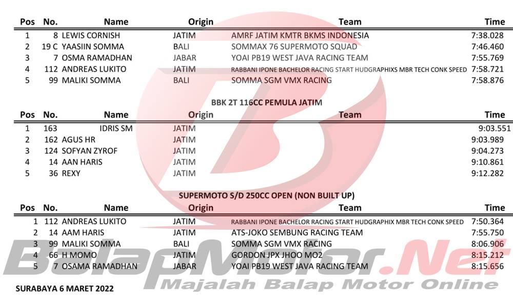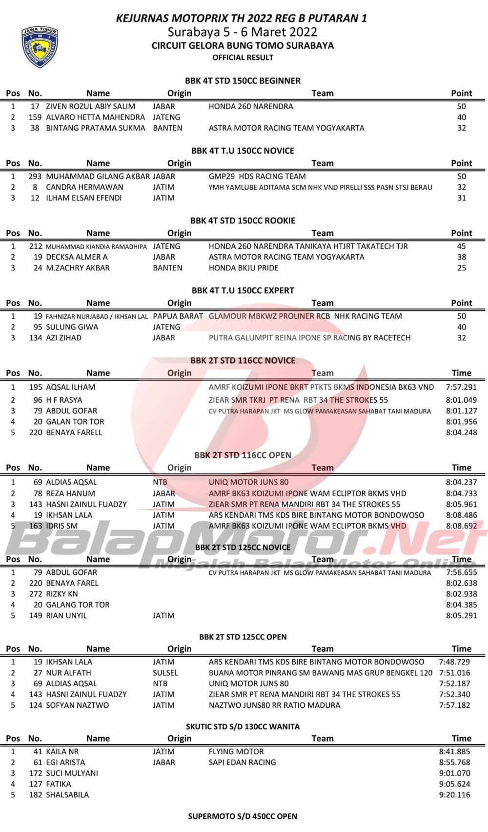 BalapMotor.Net – Berikut merupakan hasil resmi semua kelas dalam gelaran Kejurnas Motoprix Region B Jawa putaran 1 yang berlangsung di sirkuit Gelora Bung Tomo, Kota Surabaya pada 6 Maret 2022.