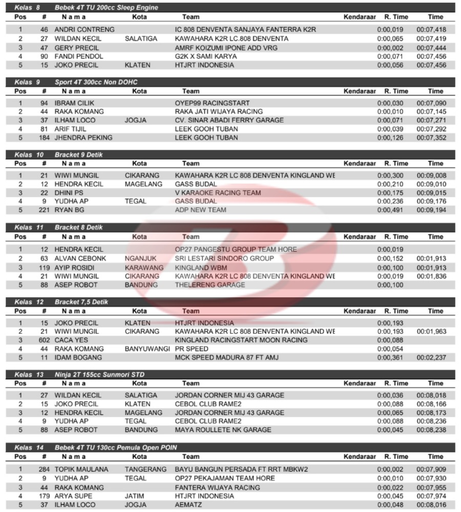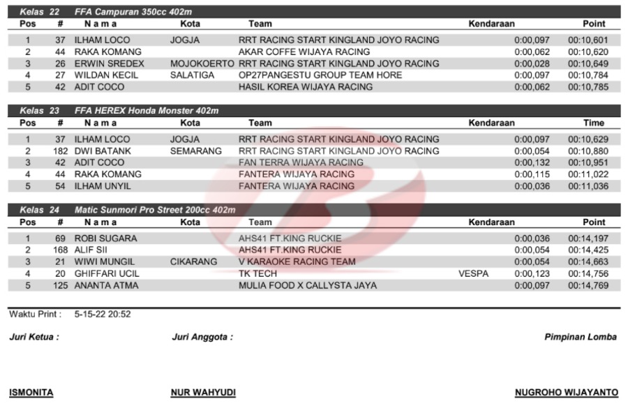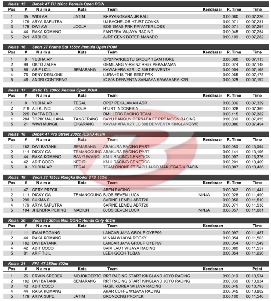 BalapMotor.Net – Berikut kami paparkan hasil lengkap kejuaraan balap lurus IDW putaran pertama yang berlangsung di sirkuit Lanud Gading, Wonosari, Yogyakarta pada 14-15 Mei 2022.