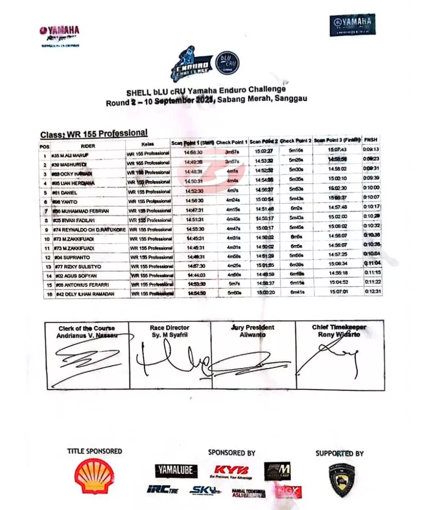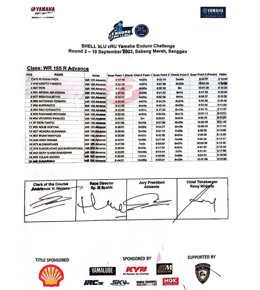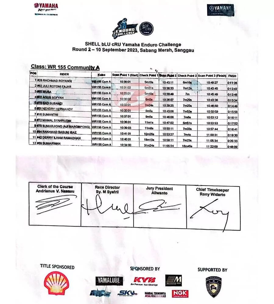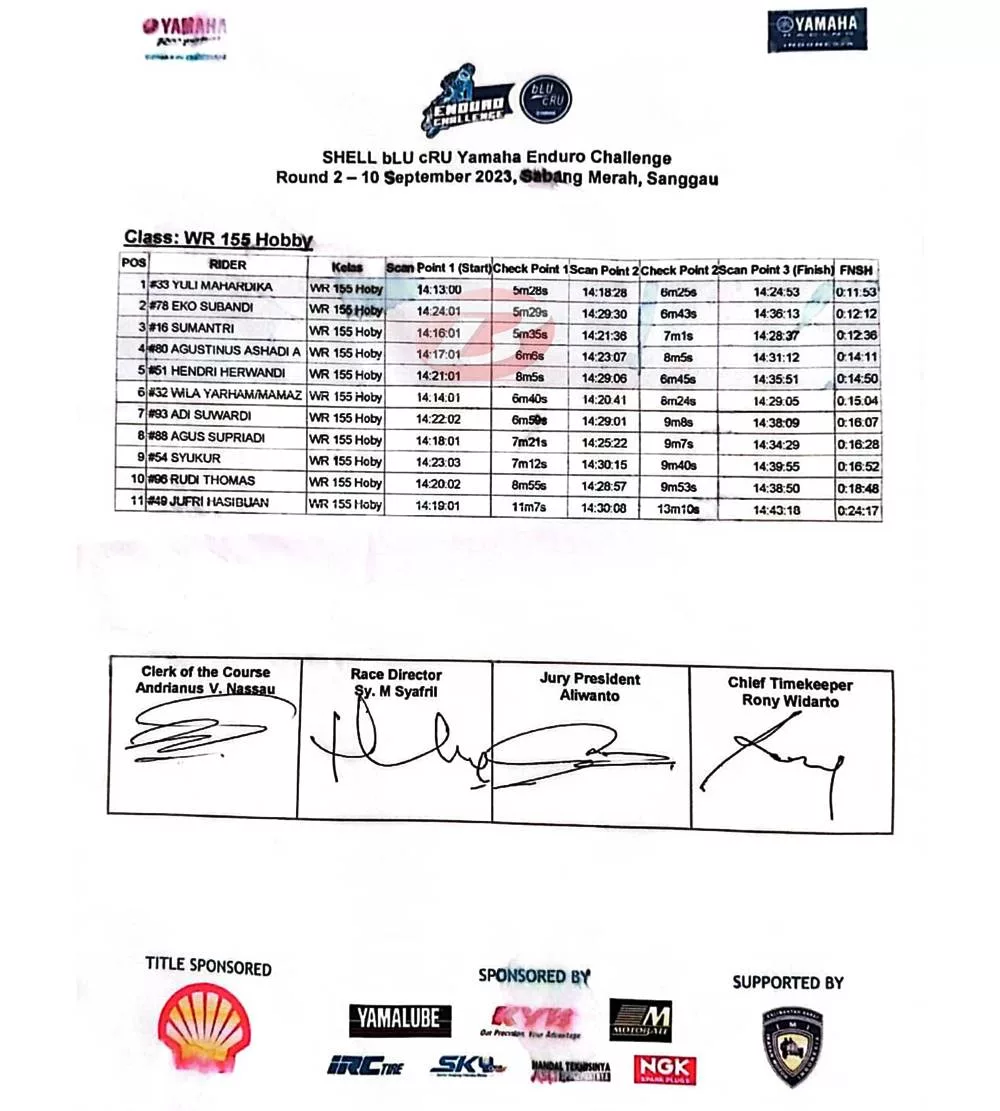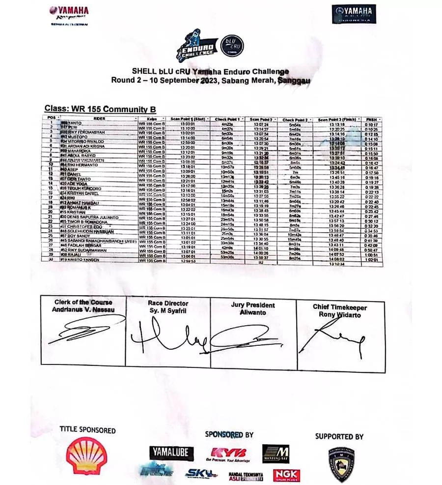 BalapMotor.Net – Berikut merupakan hasil kejuaraan Shell bLU cRU Yamaha Enduro Challenge Round 2 yang berlangsung di Sabang Merah, Kabupaten Sanggau, Kalimantan Barat pada 9-10 September 2023. (***)