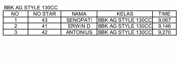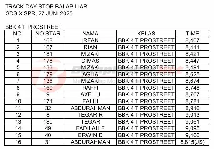 BalapMotor.Net – Berikut merupakan hasil kejuaraan PT SPR x GDS Track Day yang berlangsung di sirkuit permanen Gantiwarno Drag Strip (GDS) Klaten, Jawa Tengah pada Jumat 27 Juni 2025. (**)