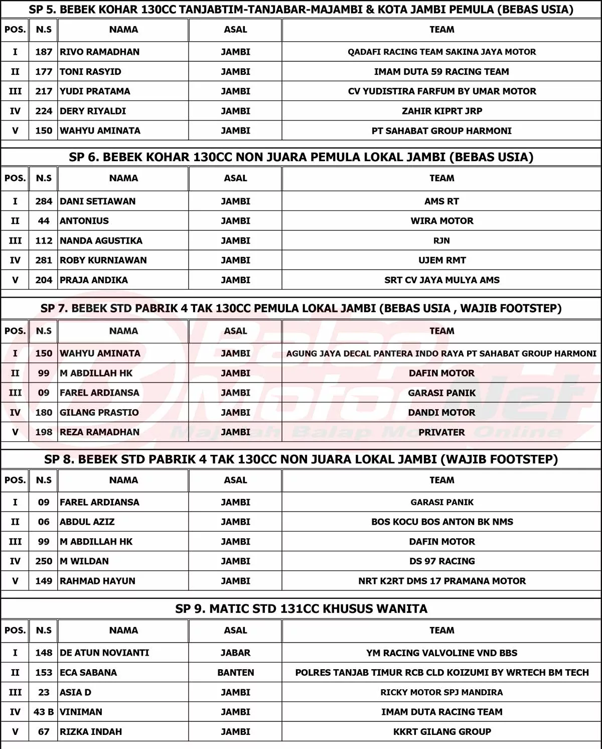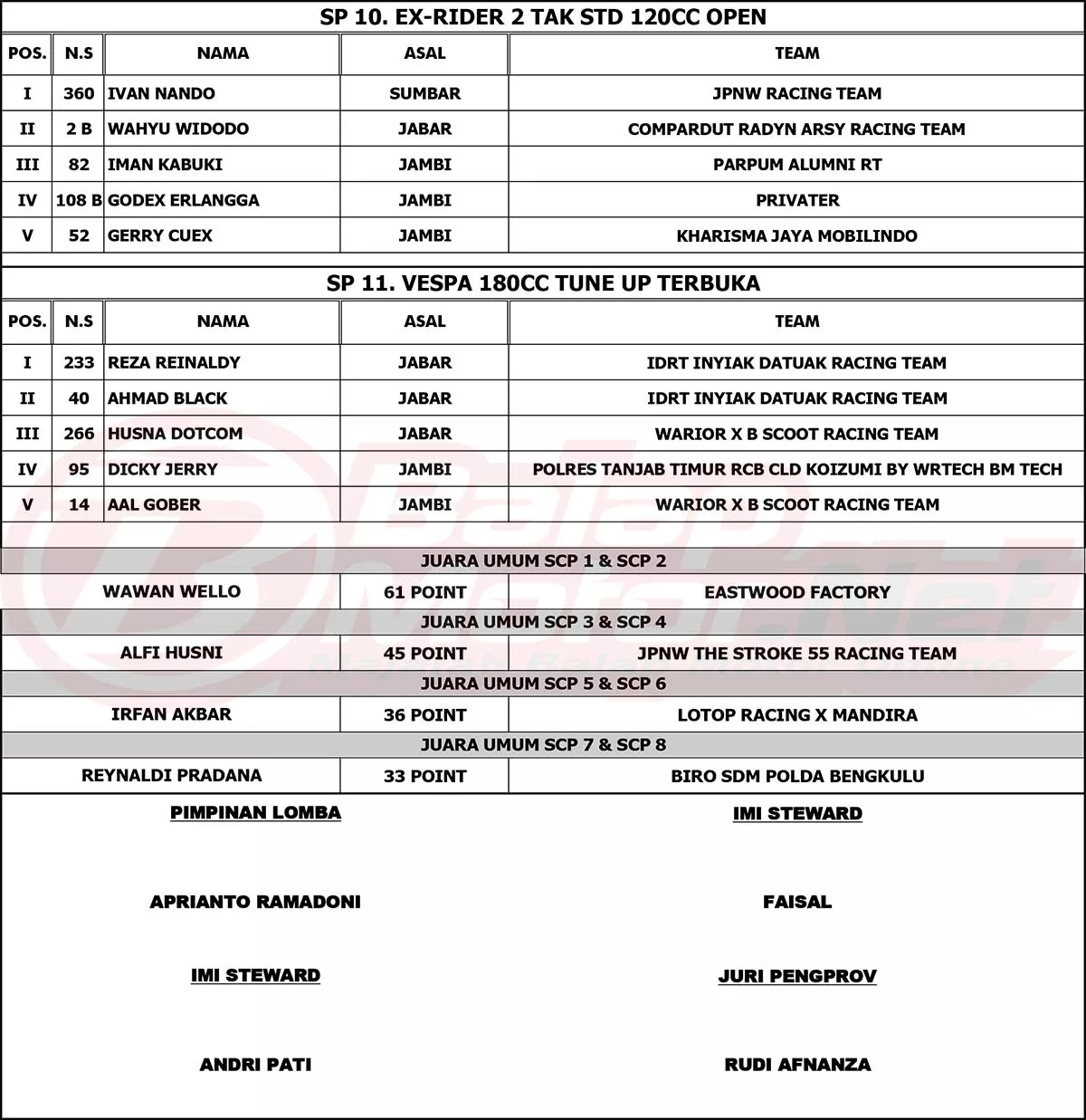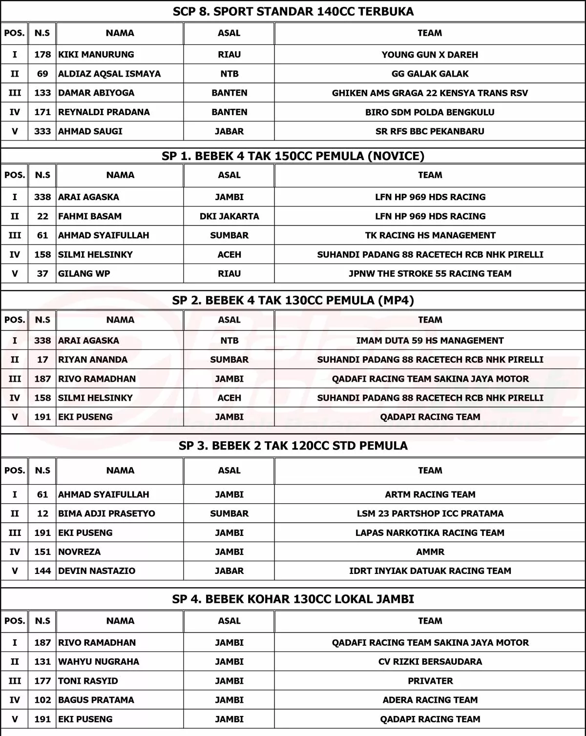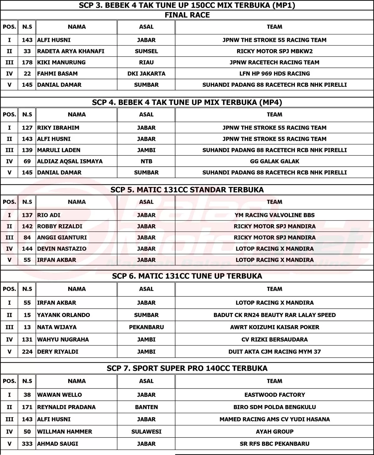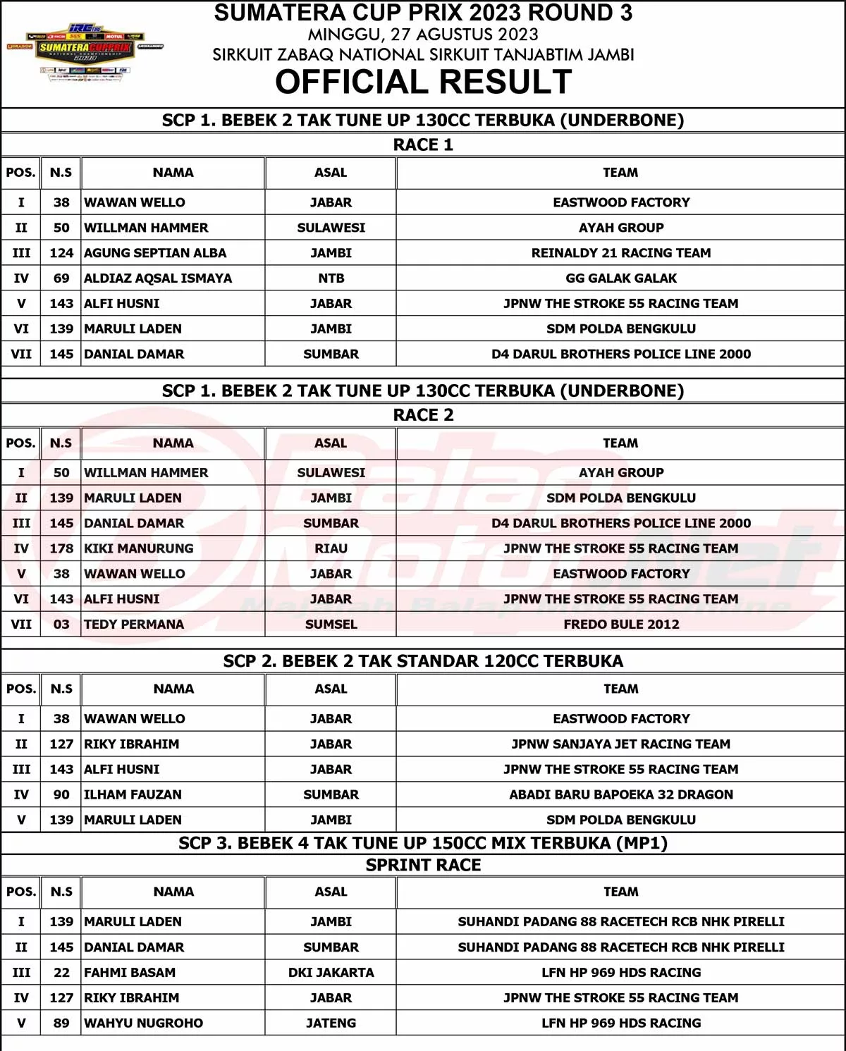 BalapMotor.Net – Berikut merupakan hasil juara dari gelaran Sumatera Cup Prix (SCP) 2023 ronde 3 yang berlangsung di Zabaq National Sirkuit, Tanjung Jabung Timur Provinsi Jambi pada 26-27 Agustus 2023. (**)