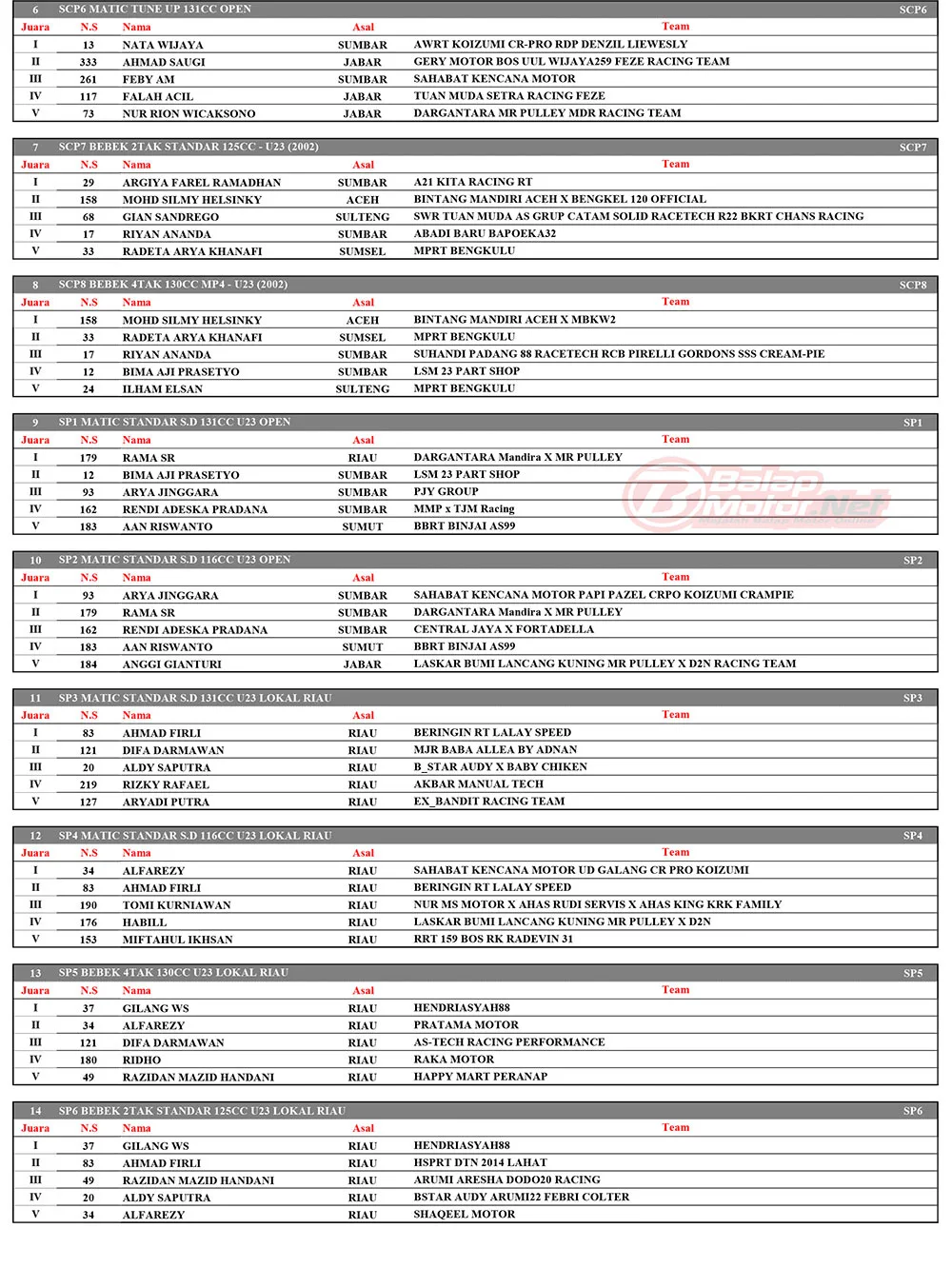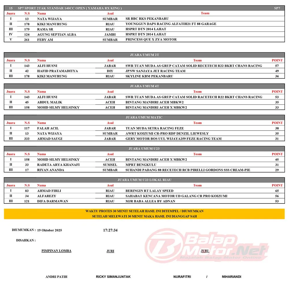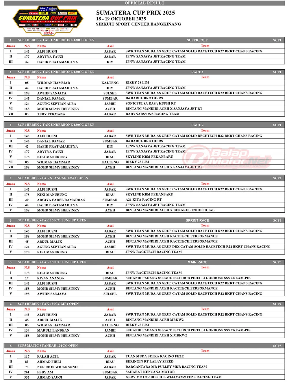 BalapMotor.Net – Berikut merupakan hasil juara dari gelaran ronde 4 Sumatera Cup Prix (SCP) 2025 yang berlangsung di sirkuit permanen Sport Center Bangkinang, Riau pada 18-19 Oktober 2025. (**)