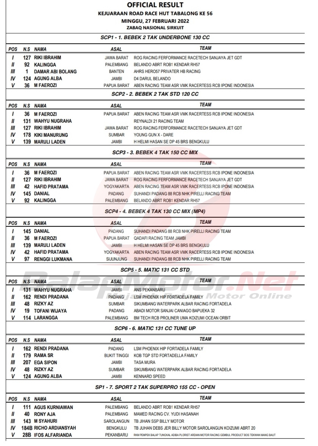 BalapMotor.Net – Berikut merupakan hasil juara dari ronde pembuka Sumatera Cup Prix (SCP) 2022 yang digelar di Zabaq Nasional Sirkuit, Tanjab Timur Jambi pada 26-27 Februari 2022.
