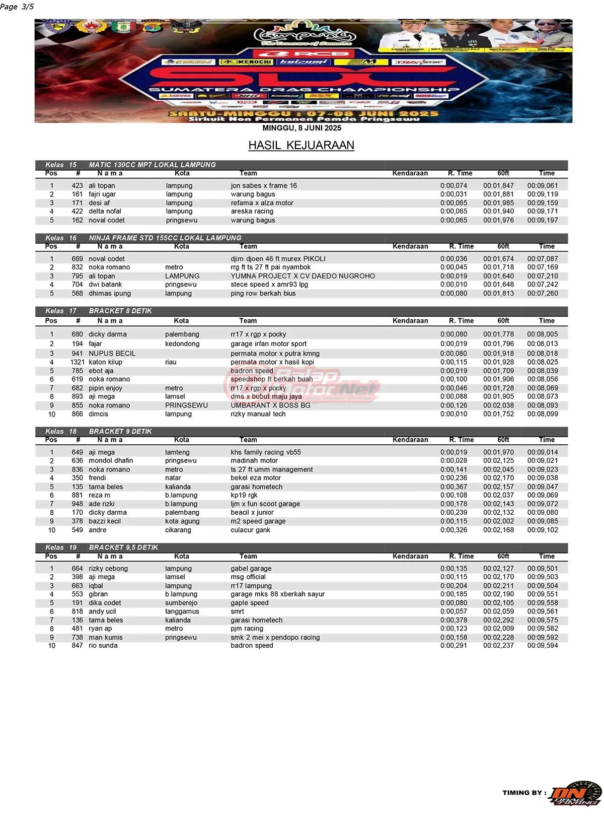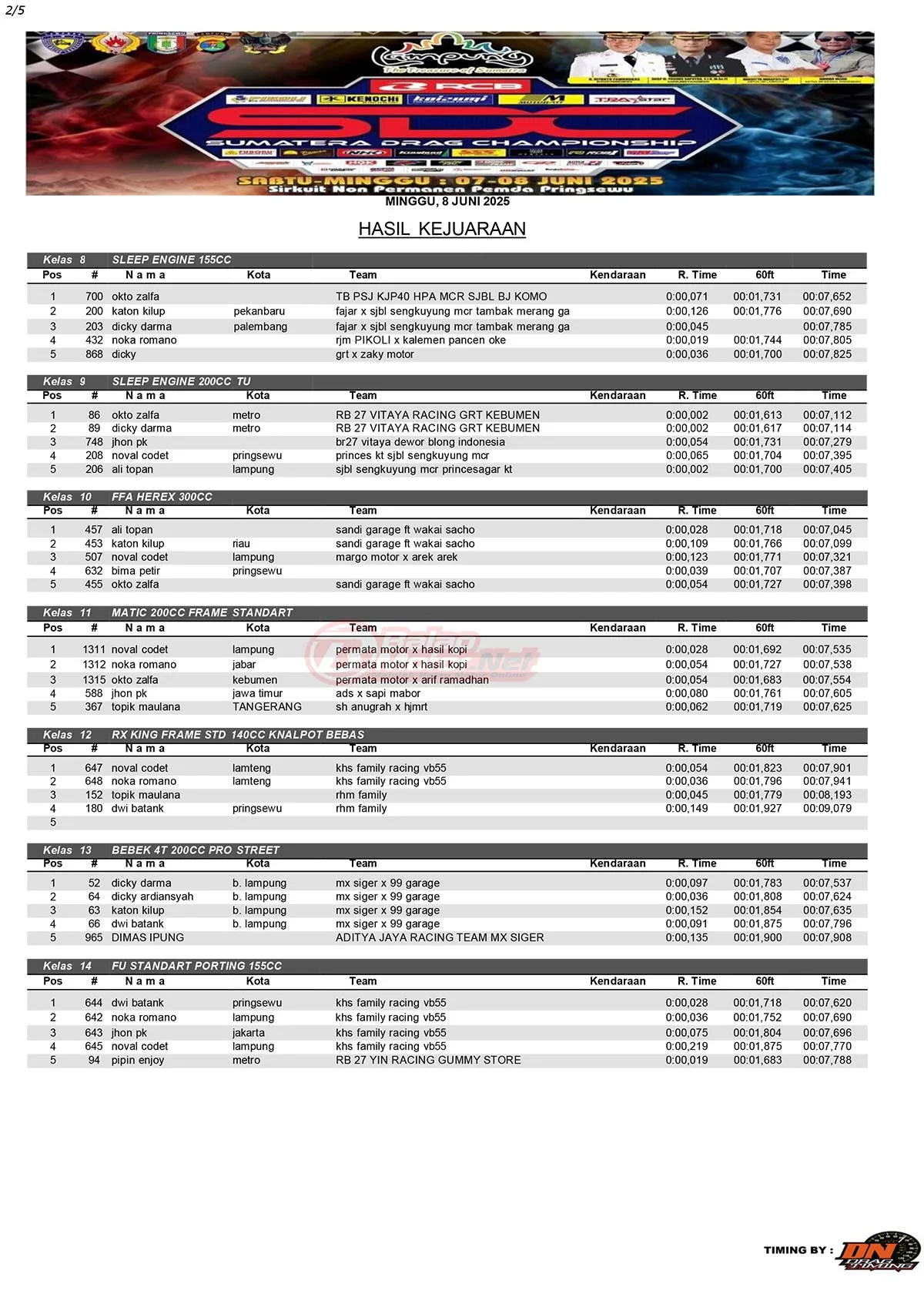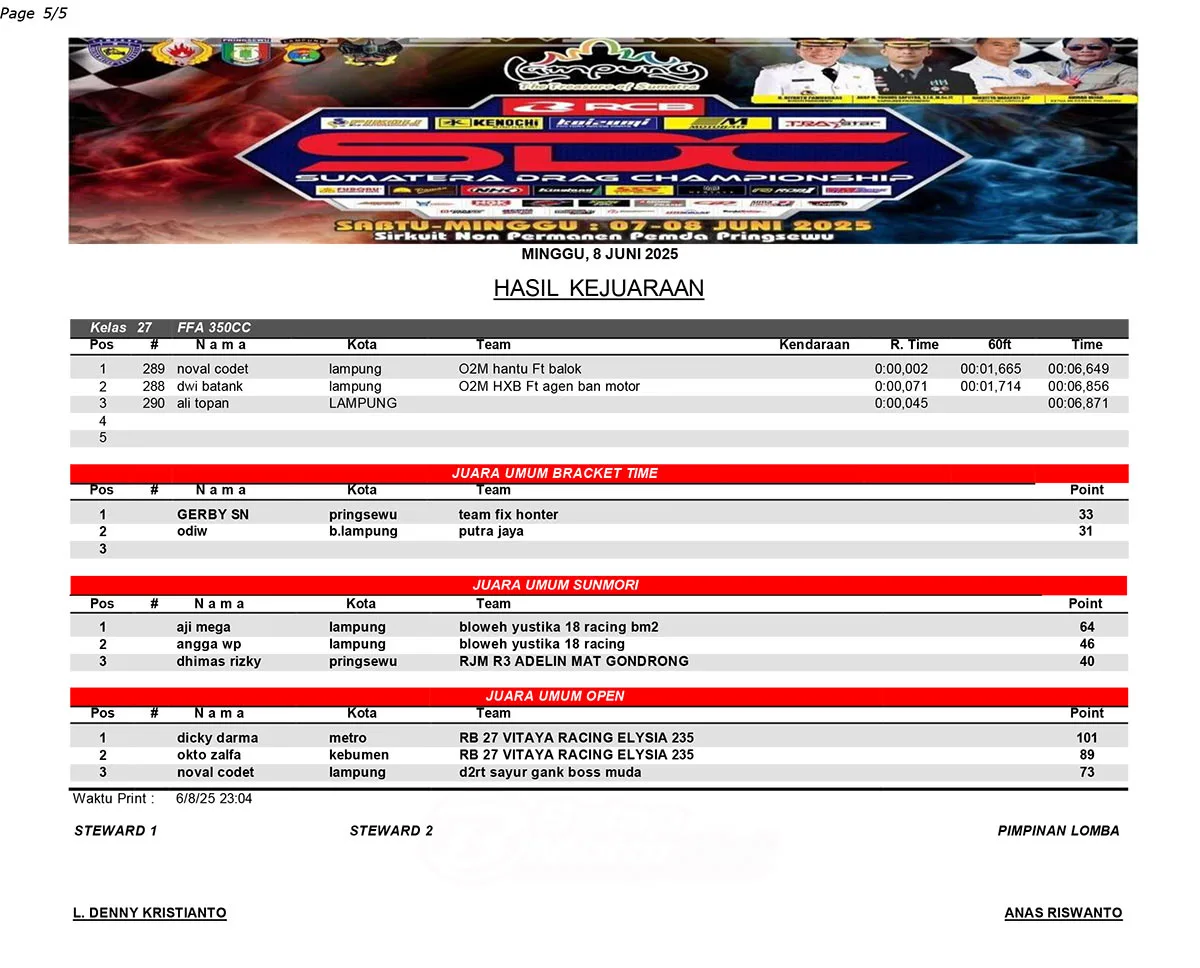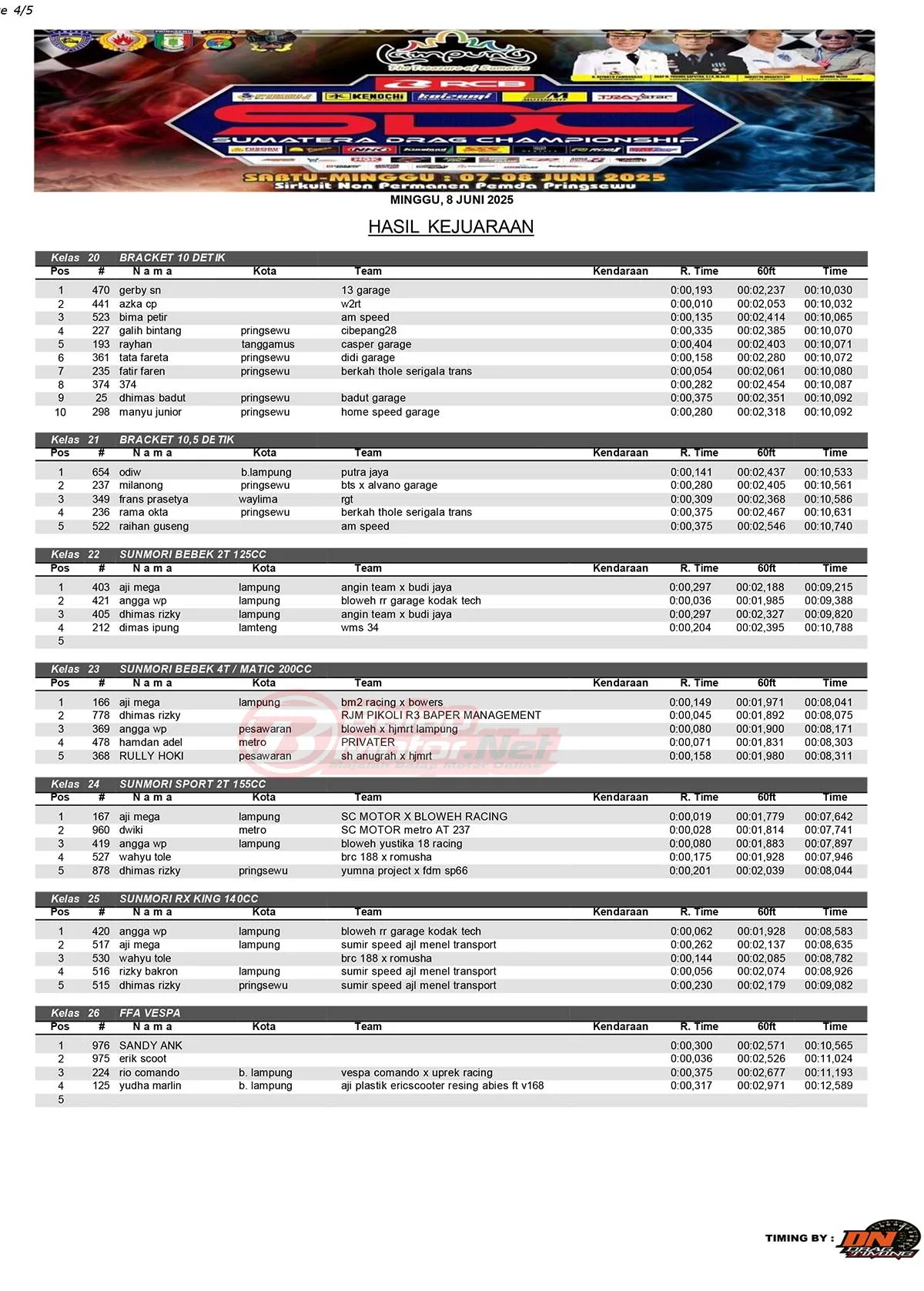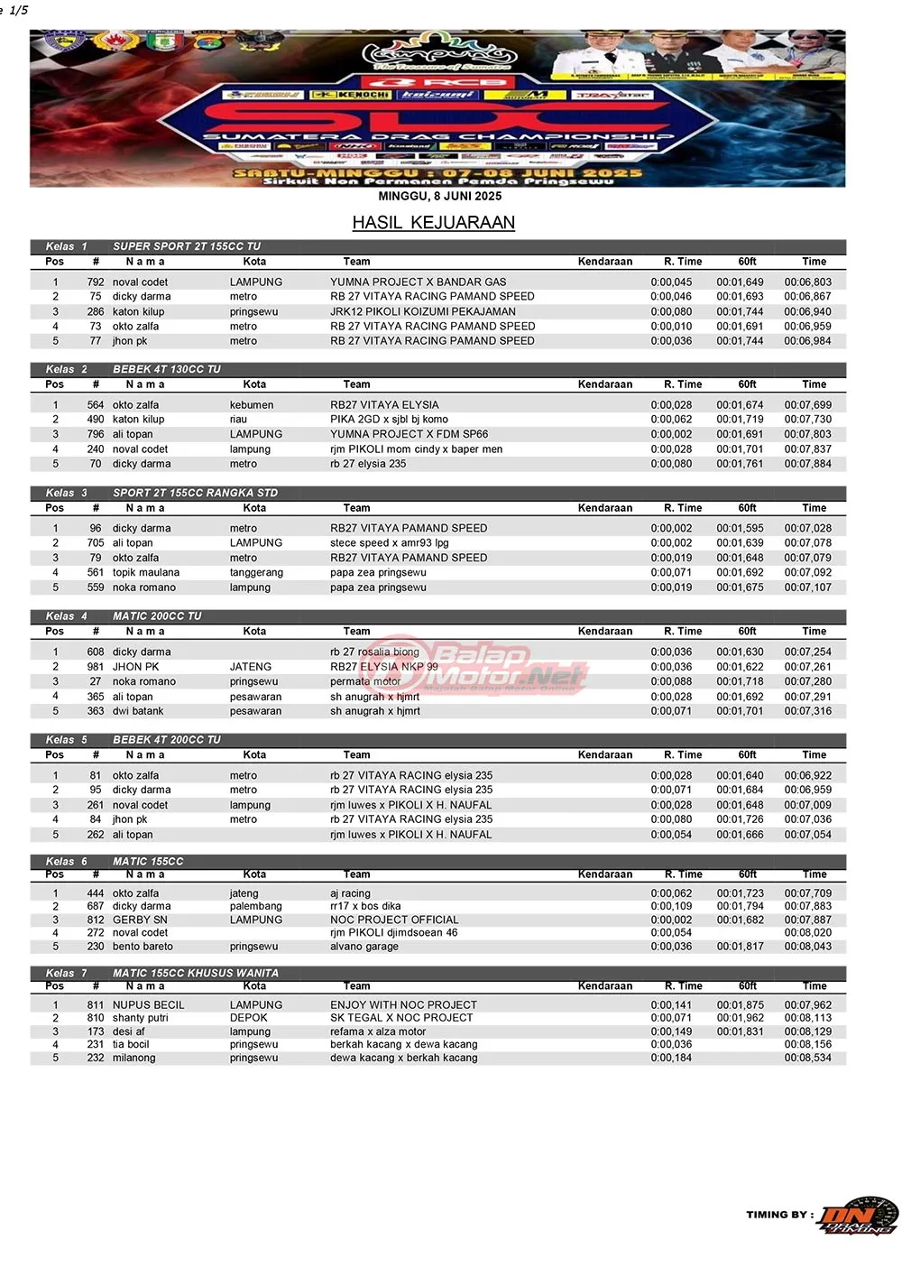 BalapMotor.Net – Berikut merupakan hasil juara dari gelaran ronde 1 Sumatera Drag Championship (SDC) 2025 yang berlangsung di sirkuit NP Pemkab Pringsewu, Lampung pada 7-8 Juni 2025. (**)