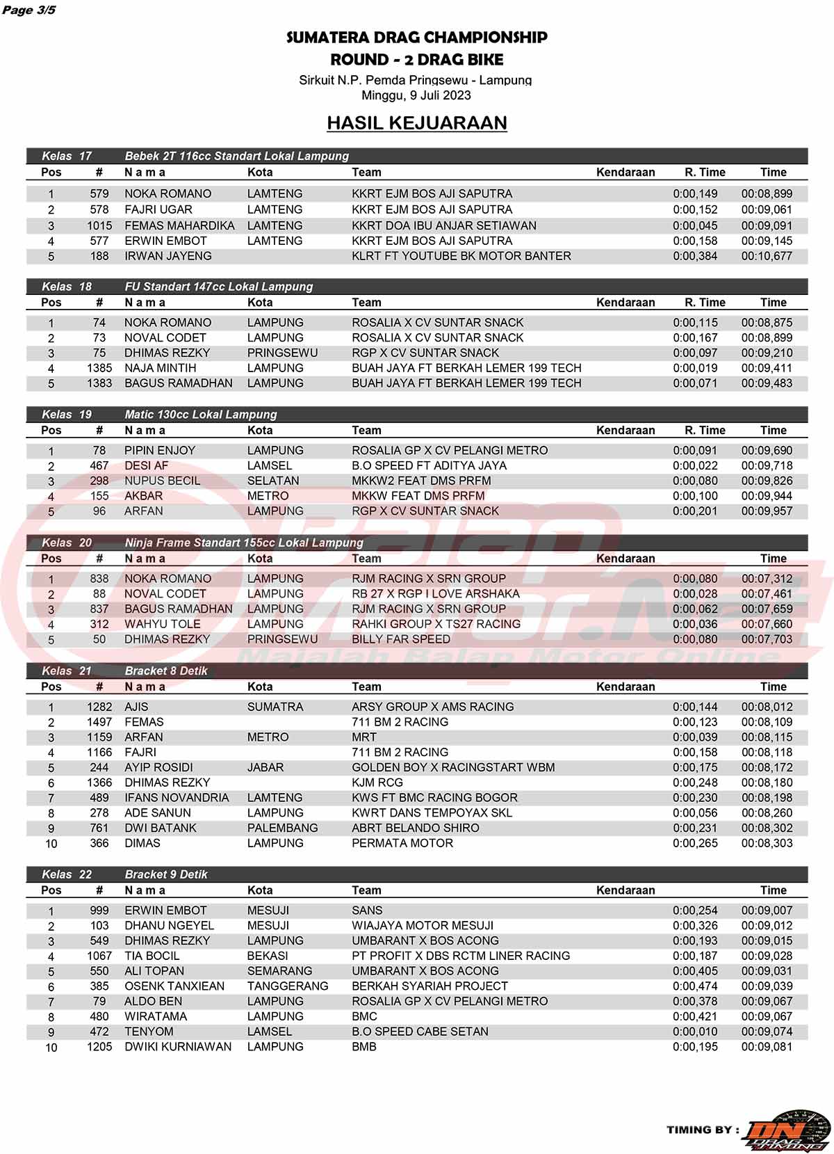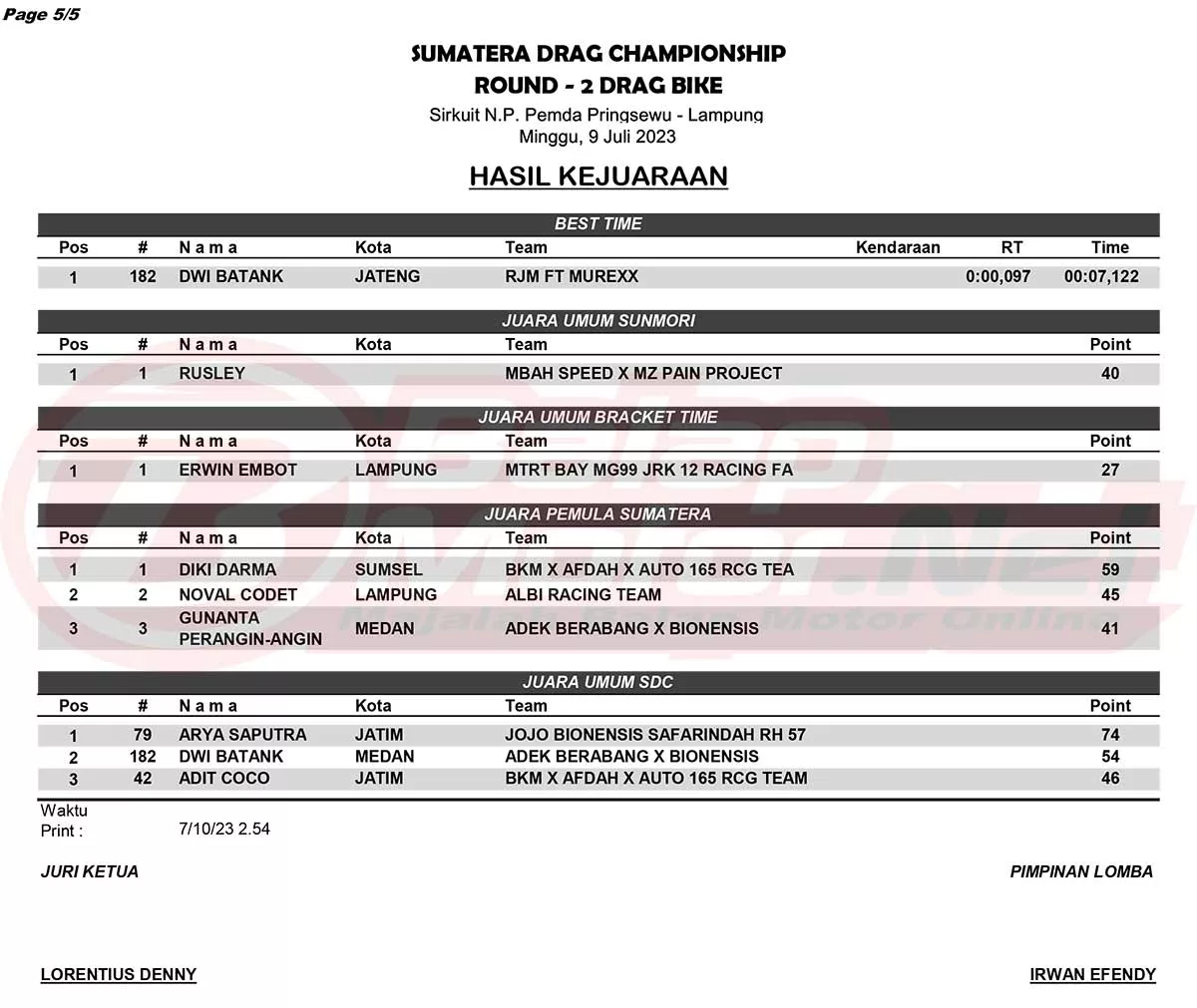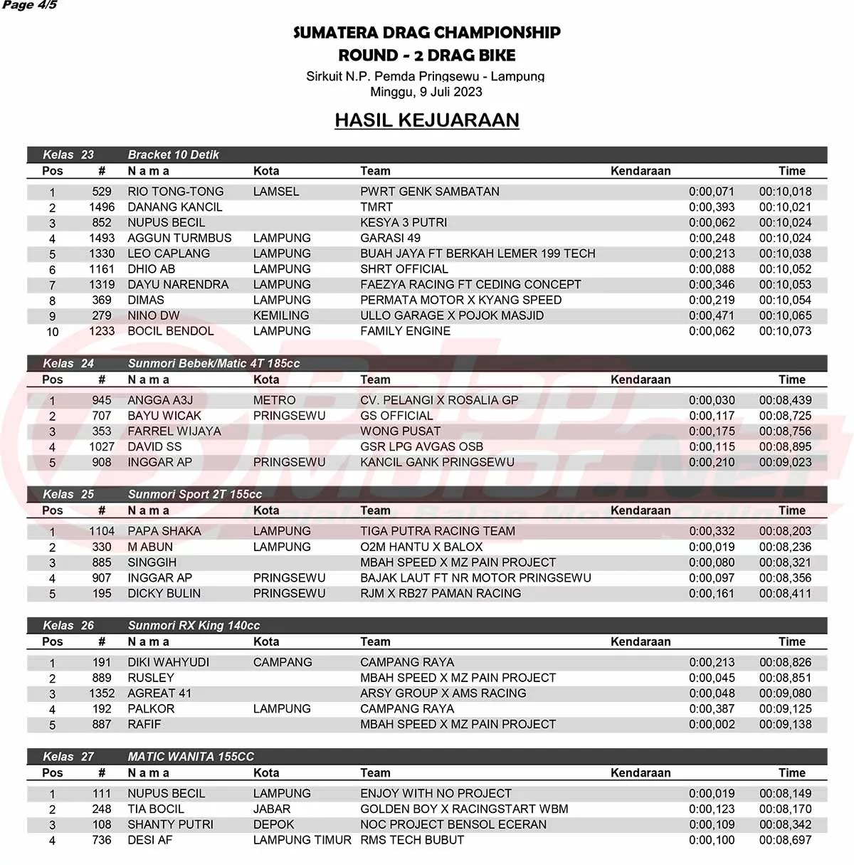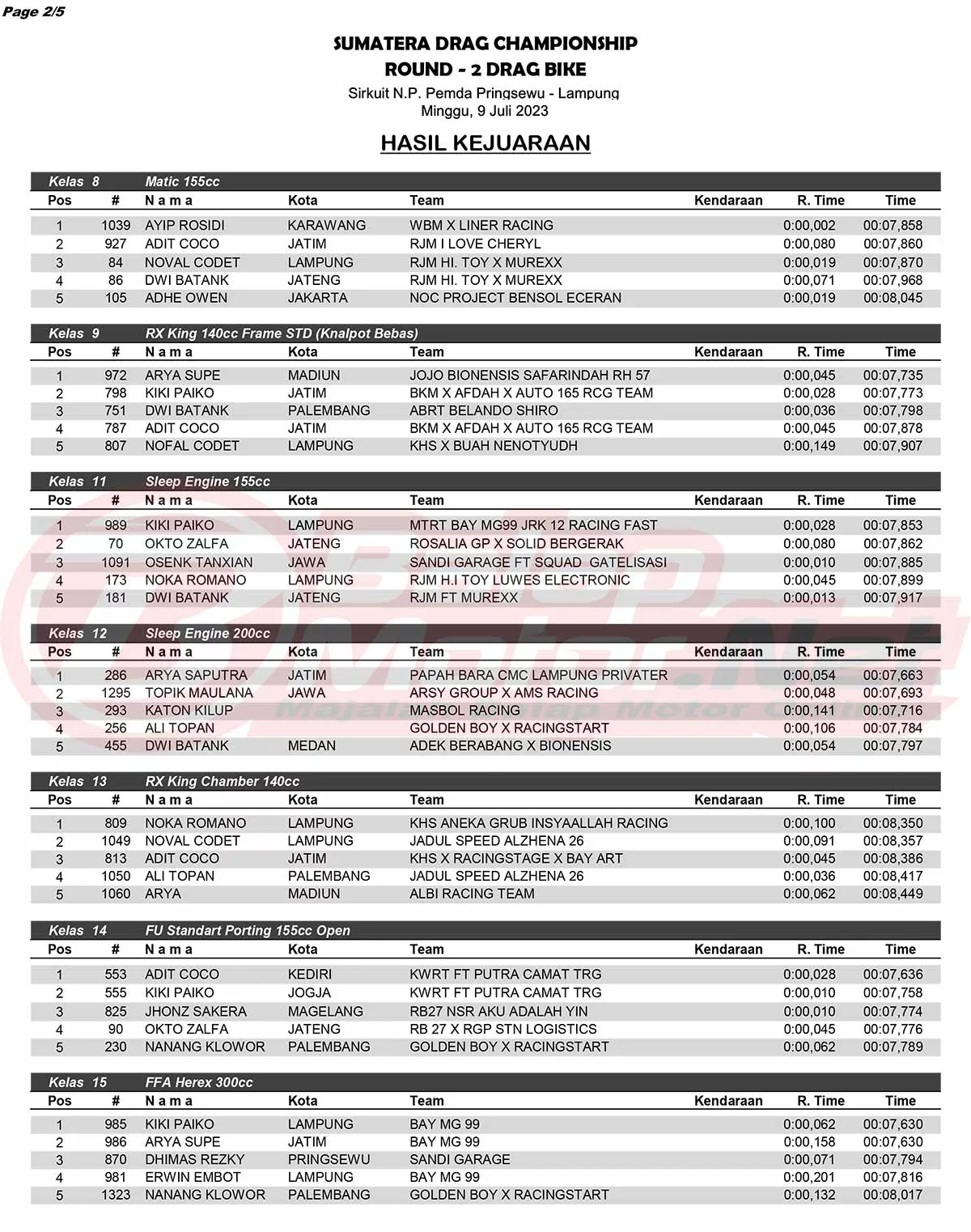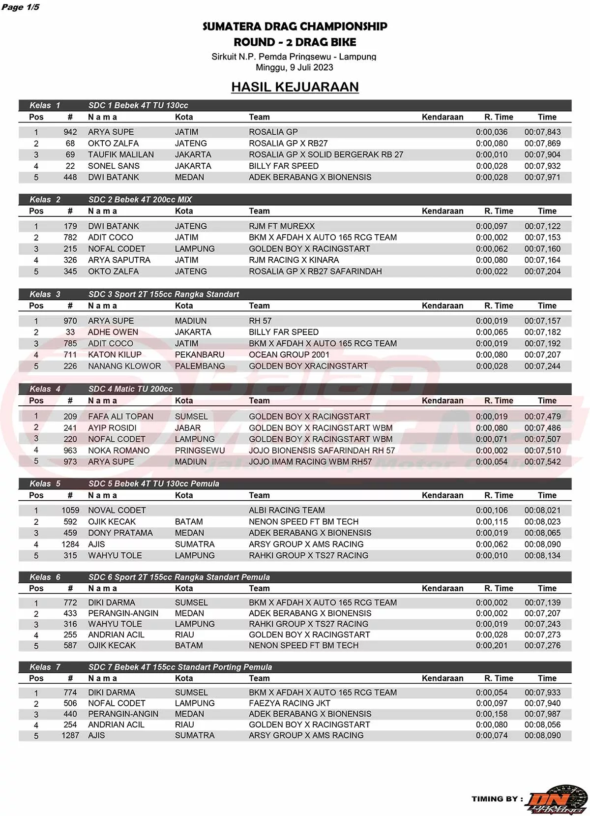 BalapMotor.Net – Sebanyak 1117 starter memanaskan gelaran Sumatera Drag Championship (SDC) ronde 2 di Pringsewu, Lampung (9/7) untuk kategori motor. Ajang ini sendiri digelar di Sirkuit NP Pemda, Kabupaten Pringsewu, Lampung. Berikut merupakan hasil juaranya. (Budy)