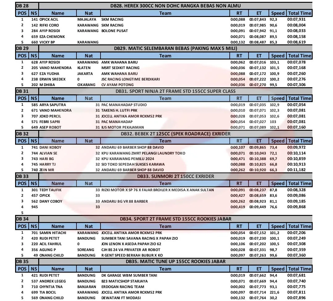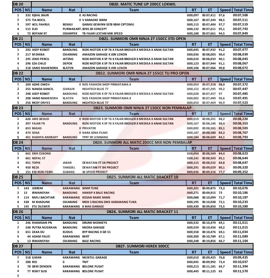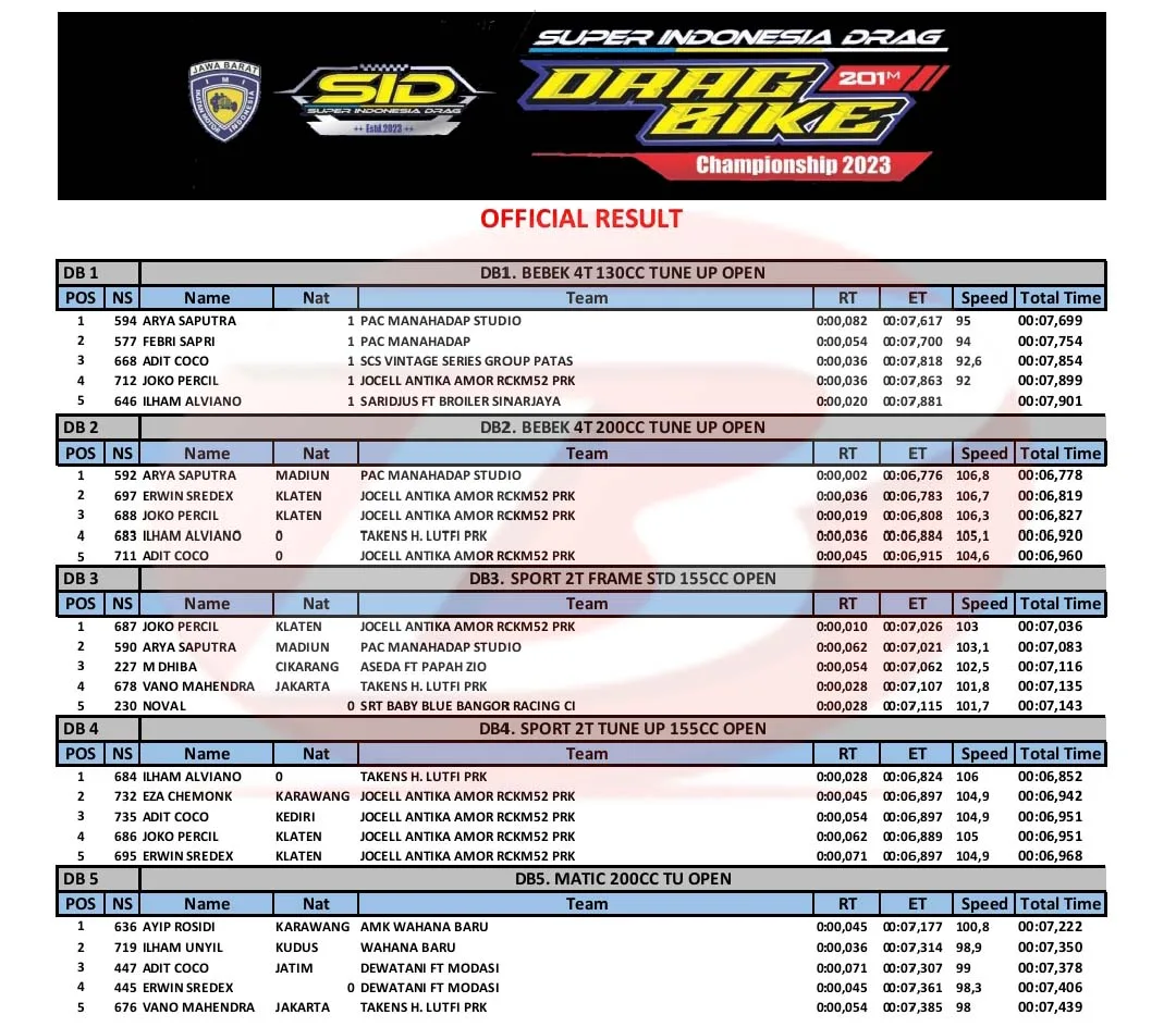 BalapMotor.Net – Berikut merupakan hasil kejuaraan balap lurus Super Indonesia Drag Bike (SID) Championship 2023 yang berlangsung di sirkuit NP. Ex Parkir Timor, Cikampek, Karawang pada 23-24 Desember 2023. (***)