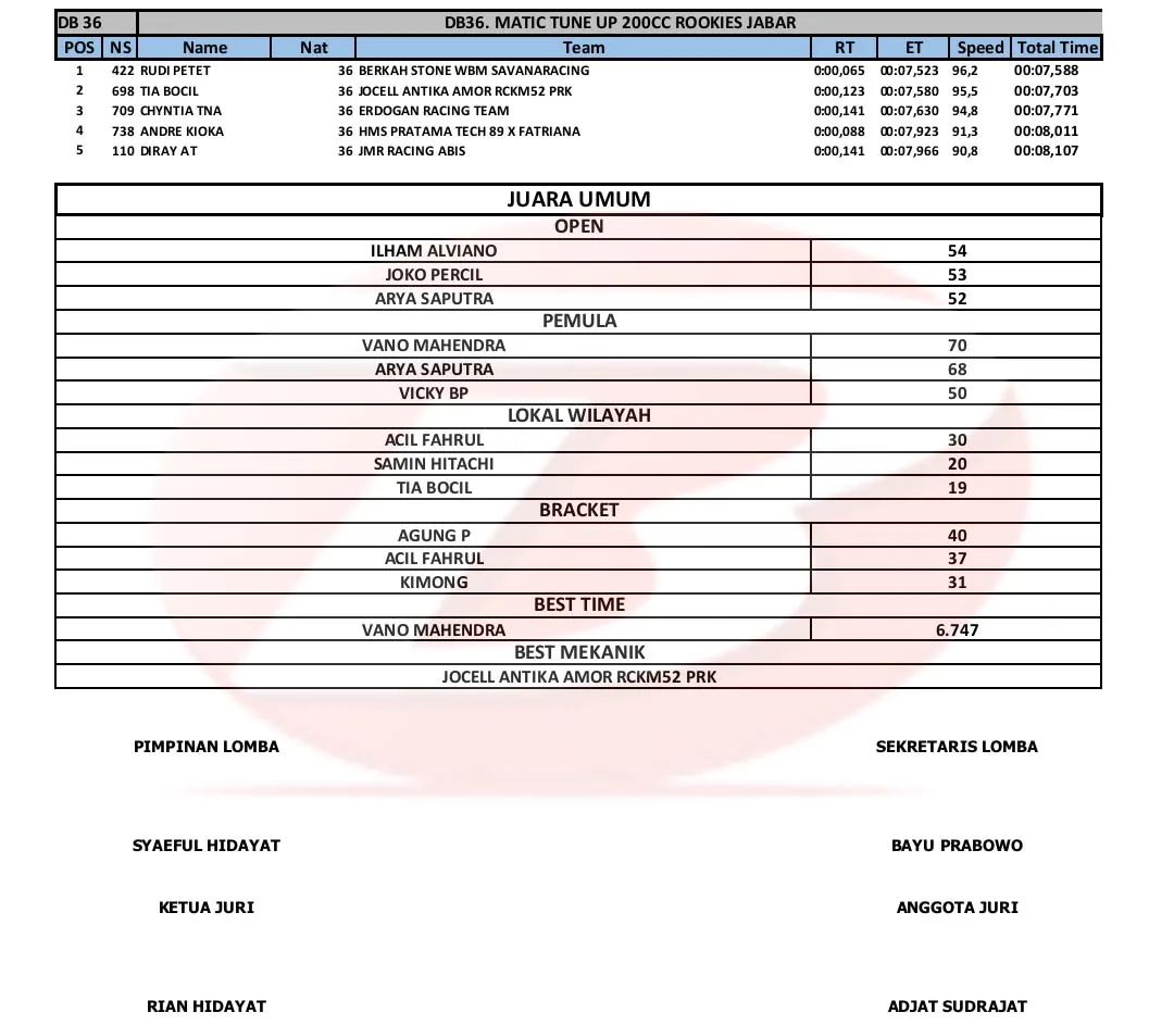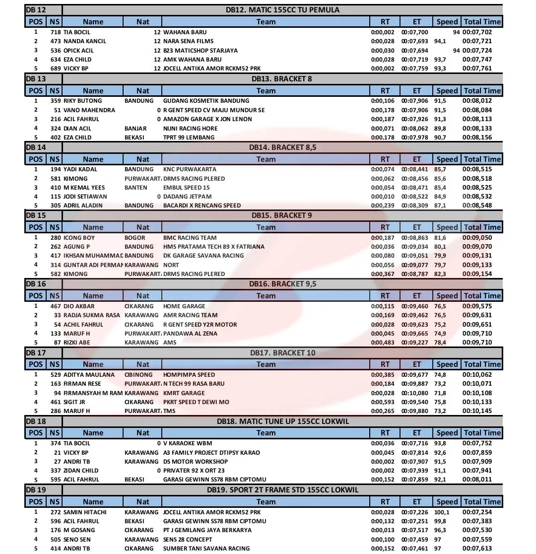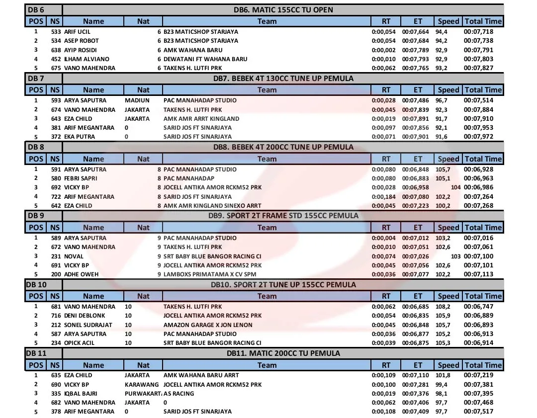 BalapMotor.Net – Berikut merupakan hasil kejuaraan balap lurus Super Indonesia Drag Bike (SID) Championship 2023 yang berlangsung di sirkuit NP. Ex Parkir Timor, Cikampek, Karawang pada 23-24 Desember 2023. (***)