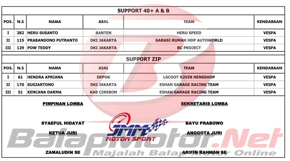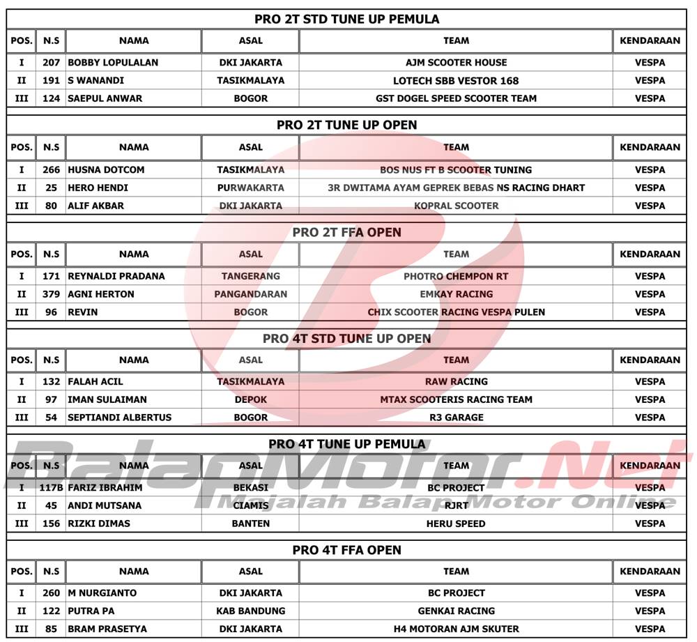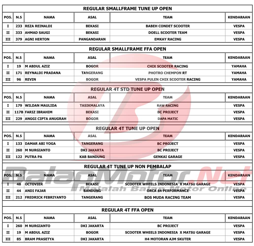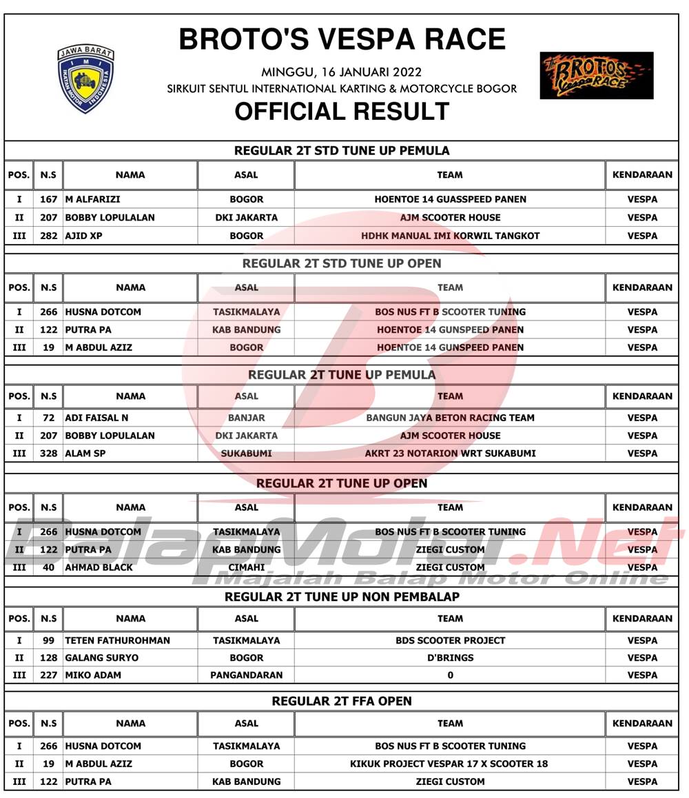 BalapMotor.Net – Berikut merupakan hasil juara dari gelaran The Brotos Vespa Race 2022 yang berlangsung di sirkuit Sentul Karting, Bogor pada 16 Januari 2022.