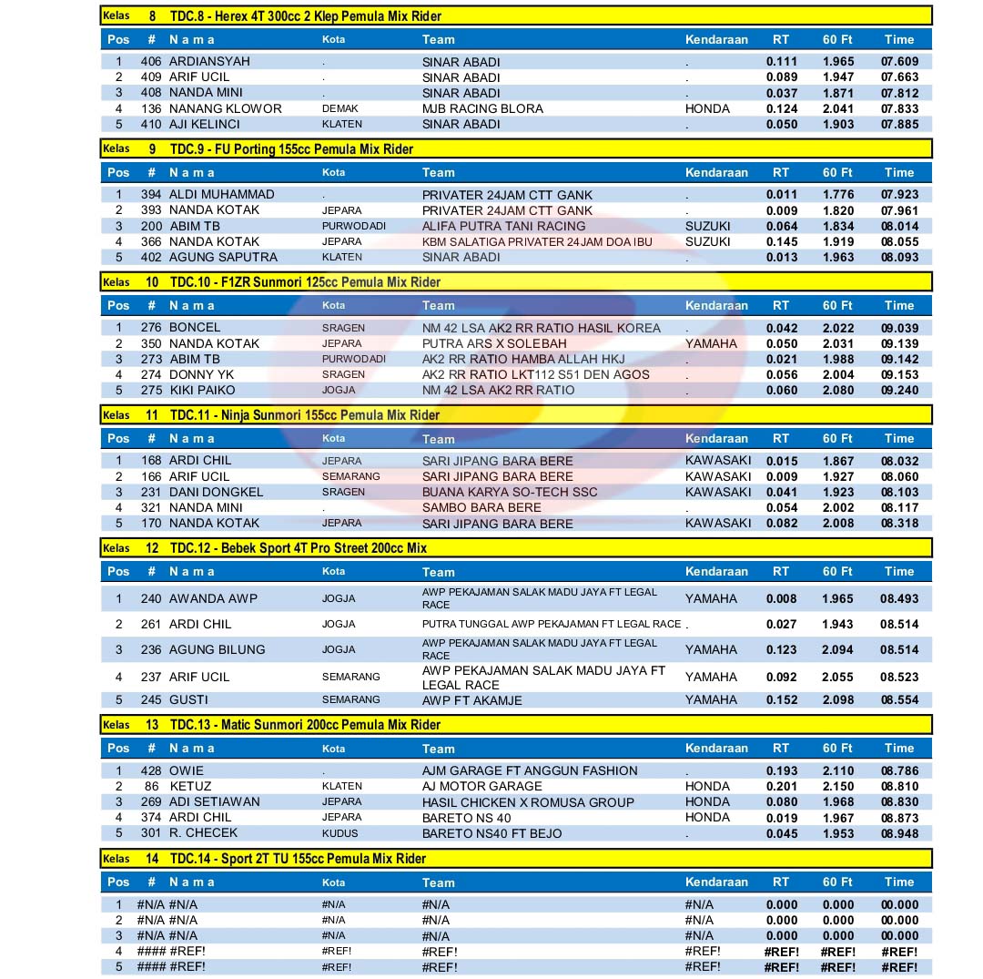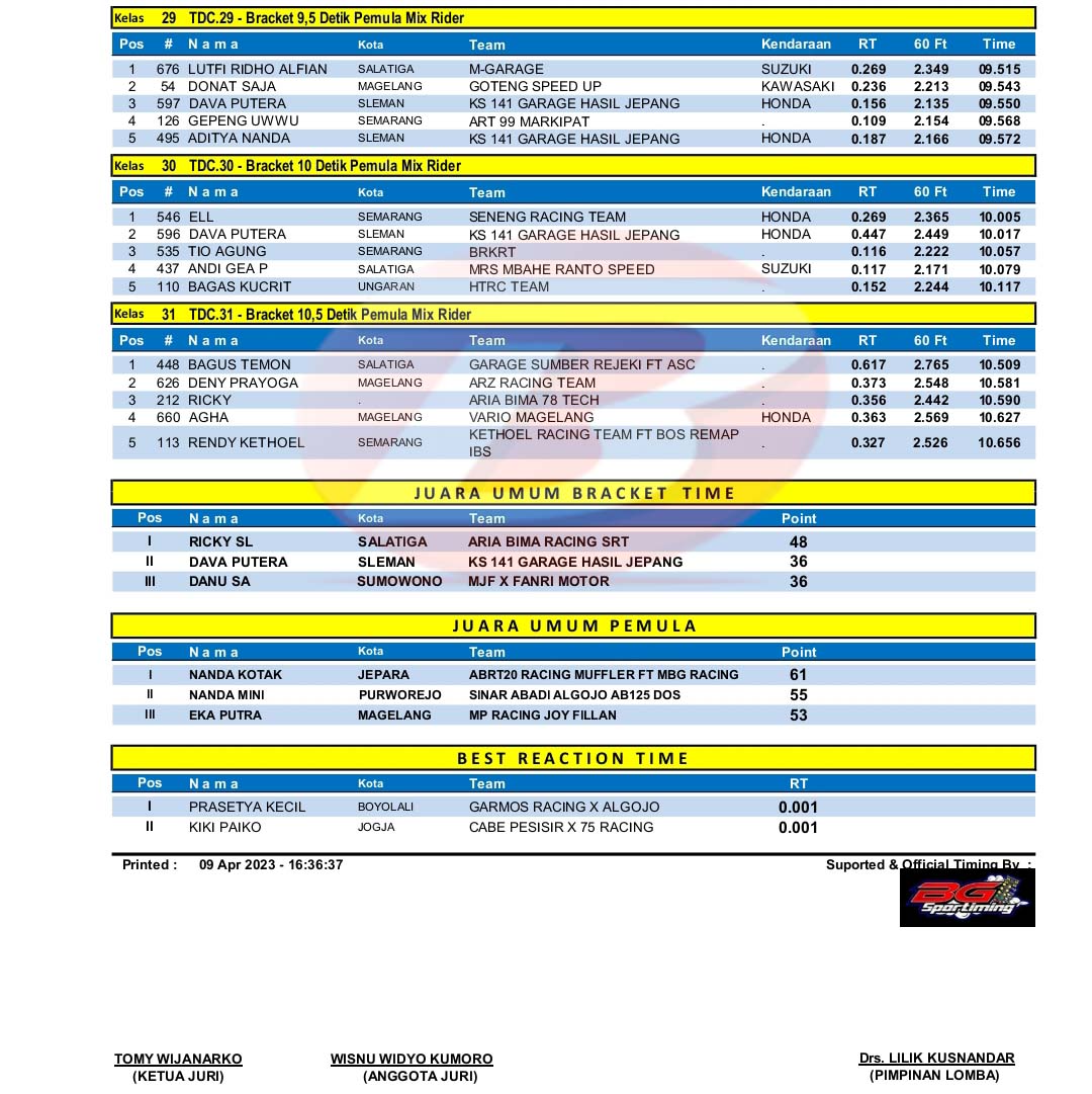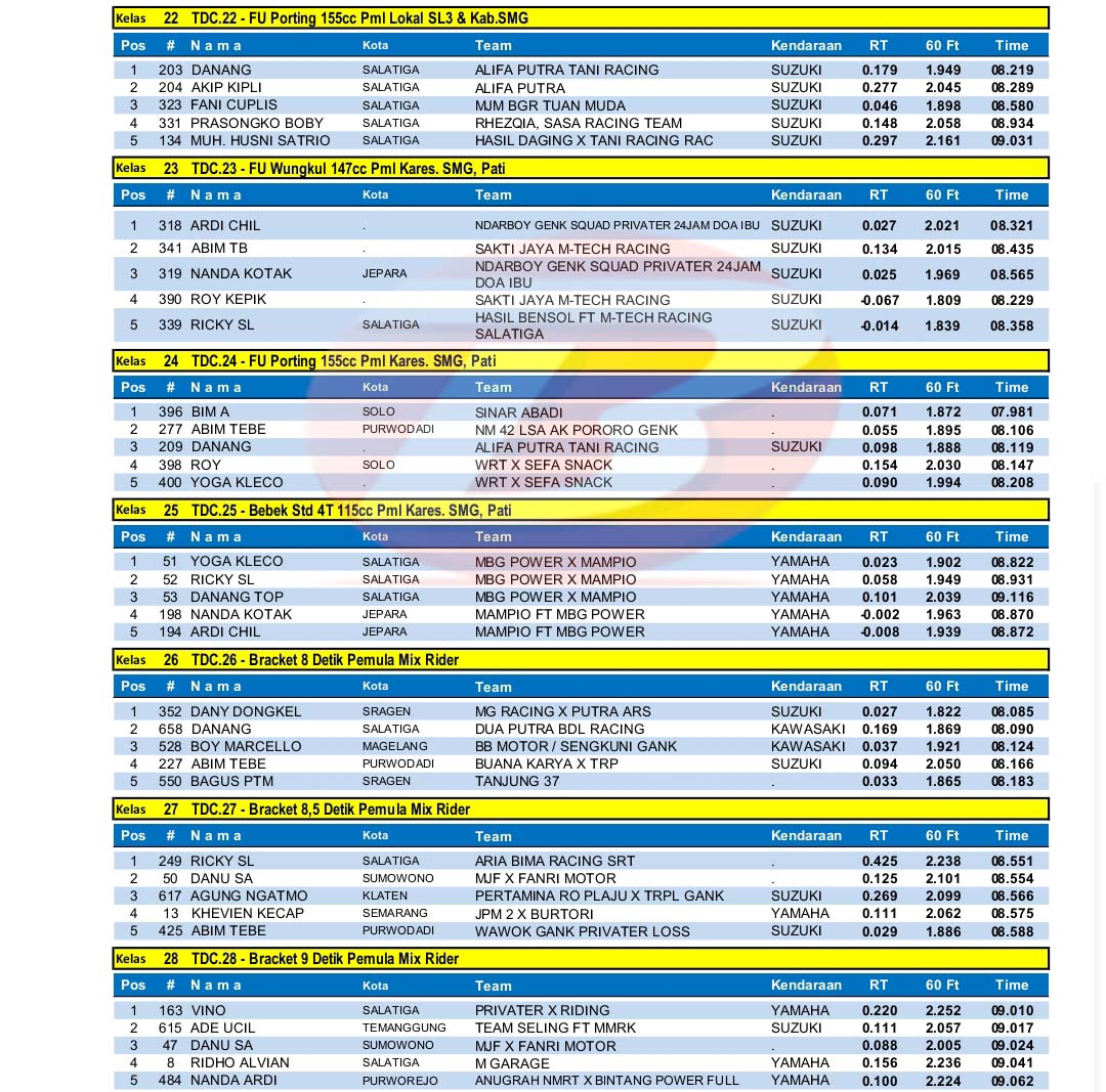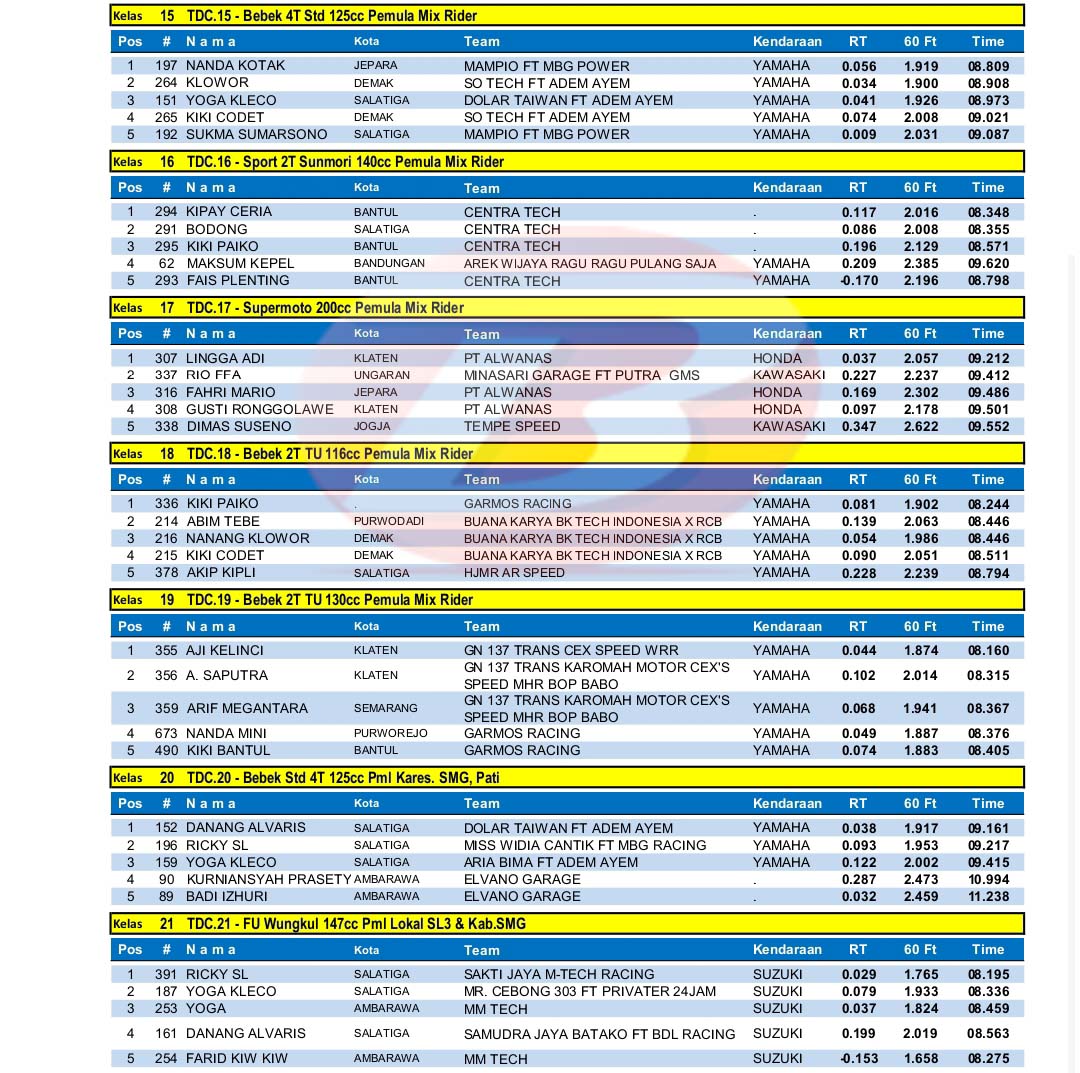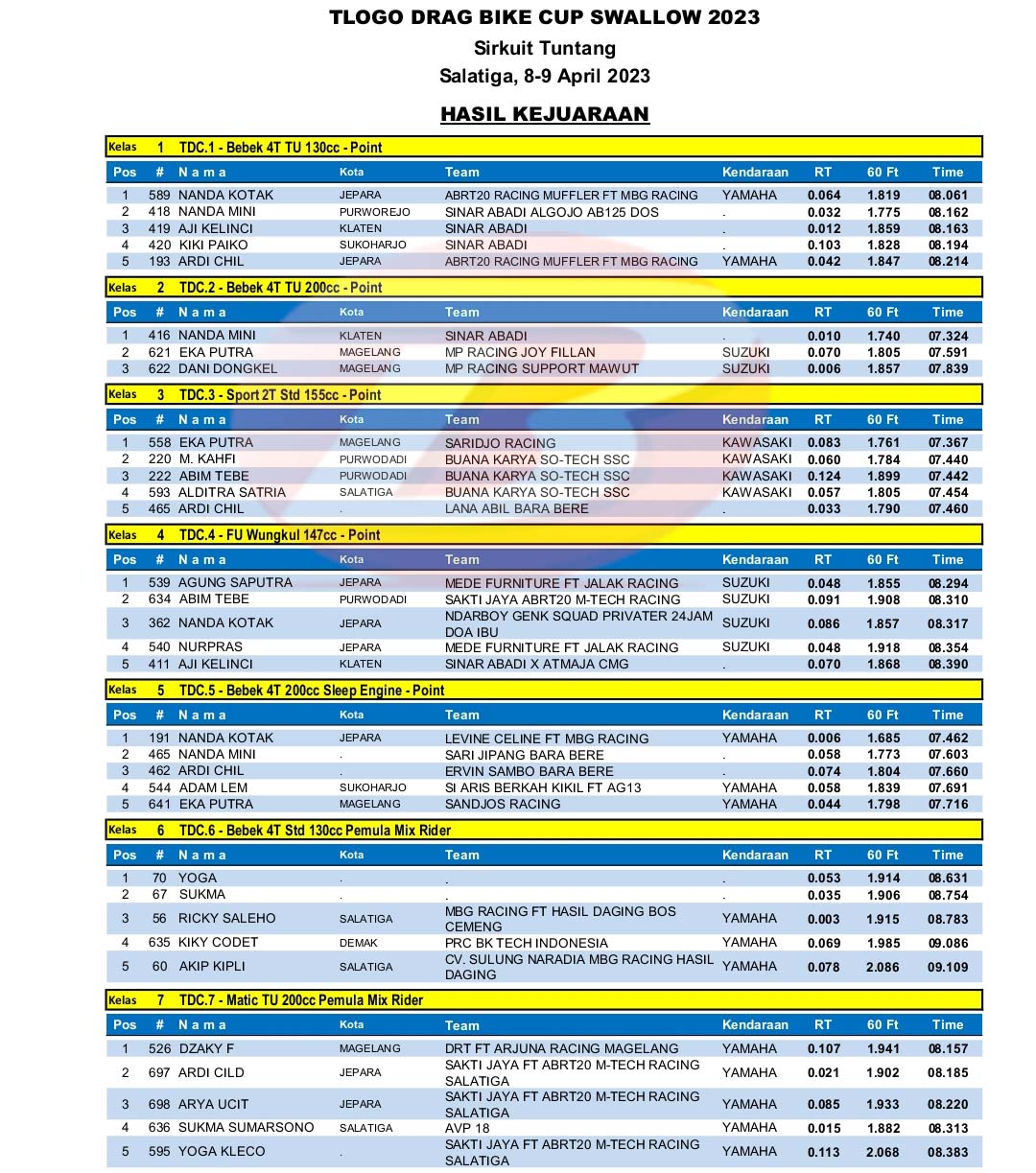 BalapMotor.Net – Berikut merupakan hasil kejuaraan balap lurus 201m bertajuk Tlogo Drag Bike Cup Swallow yang berlangsung di Arena bermain otomotif Kebun Buah Tlogo, Tuntang Kab. Semarang, Jateng pada 8-9 April 2023. (***)