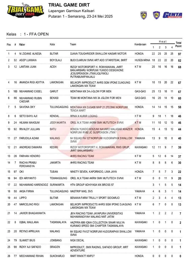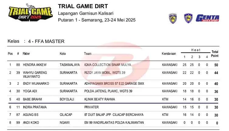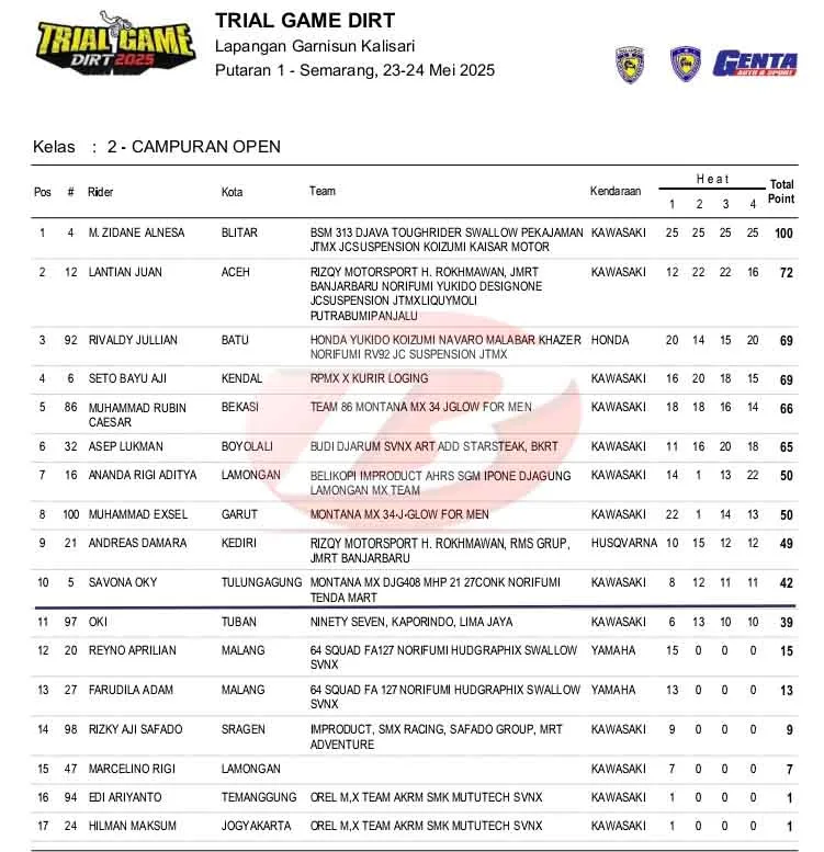 BalapMotor.Net – Berikut merupakan hasil kejuaraan Trial Game Dirt TGD 2025 round 1 yang berlangsung di sirkuit NP. Lapangan Garnisun Kalisari, Semarang, Jawa Tengah pada 23-24 Mei 2025. (**)