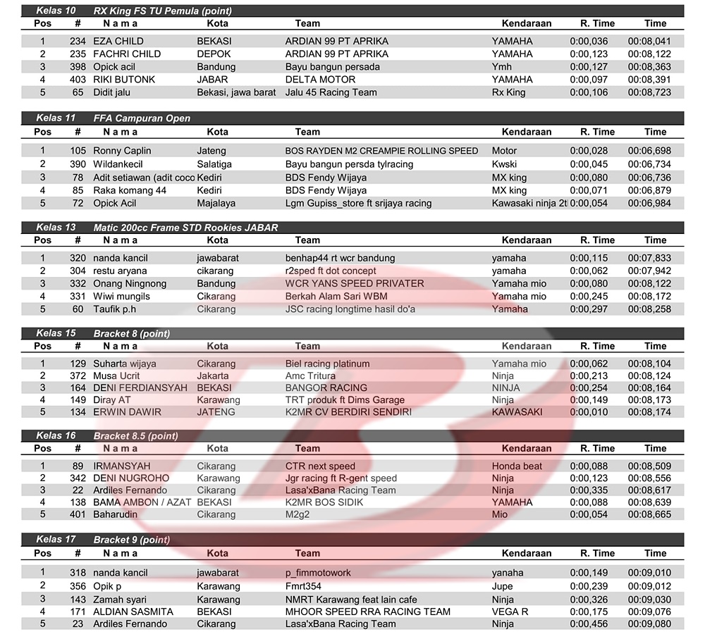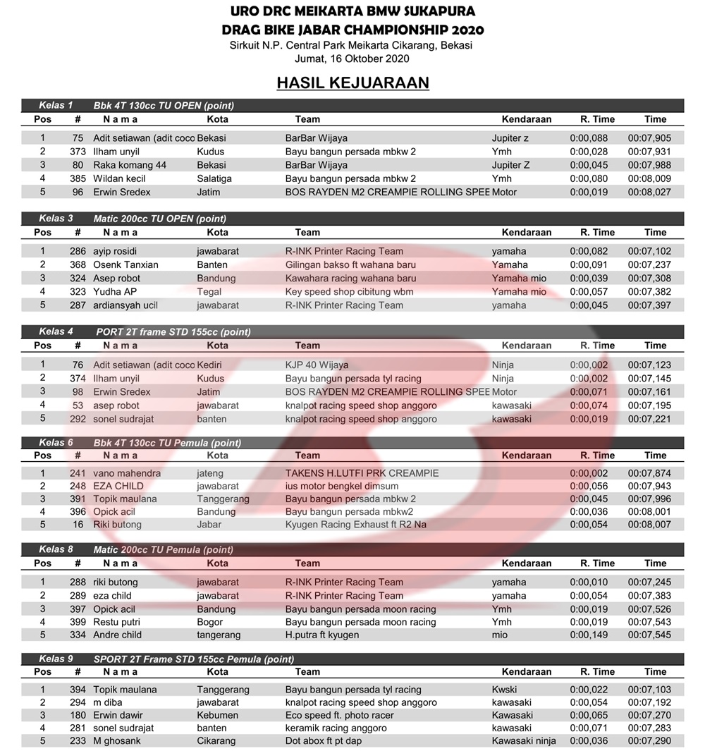 BalapMotor.Net – Berikut merupakan hasil juara dari kejuaraan URO DRC Meikarta BMW Sukapura Drag Bike 2020 yang berlangsung di sirkuit NP. Central Park Meikarta, Cikarang, Bekasi pada Jumat 16 Oktober 2020.