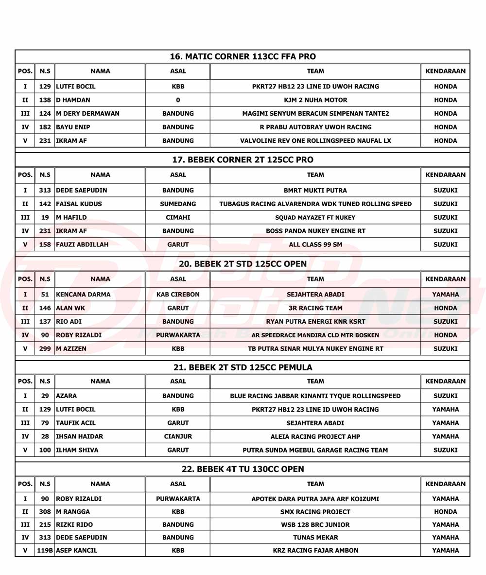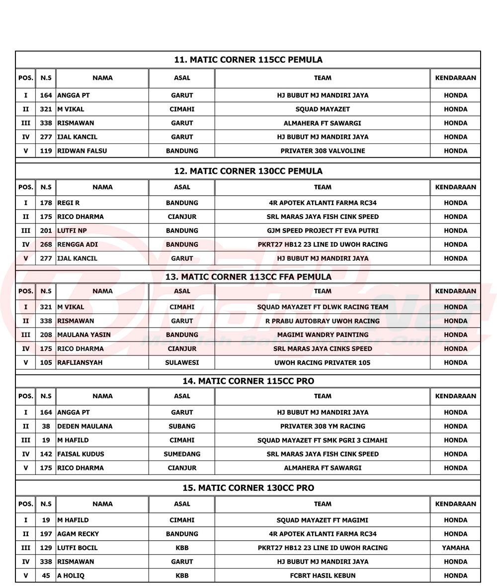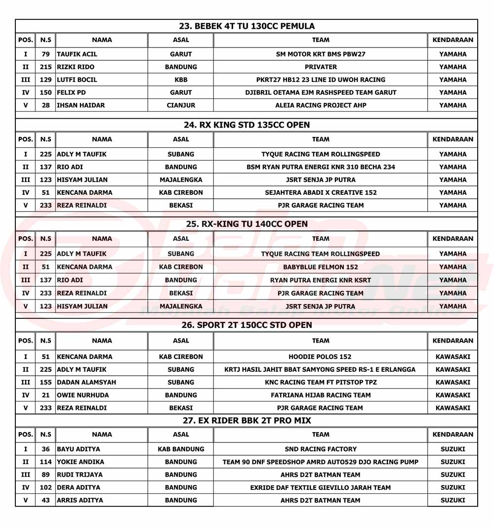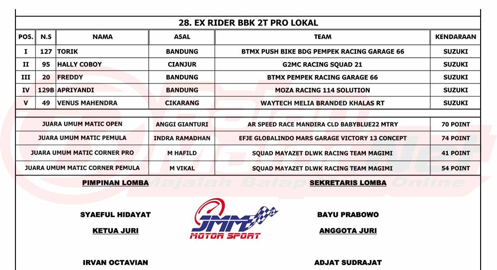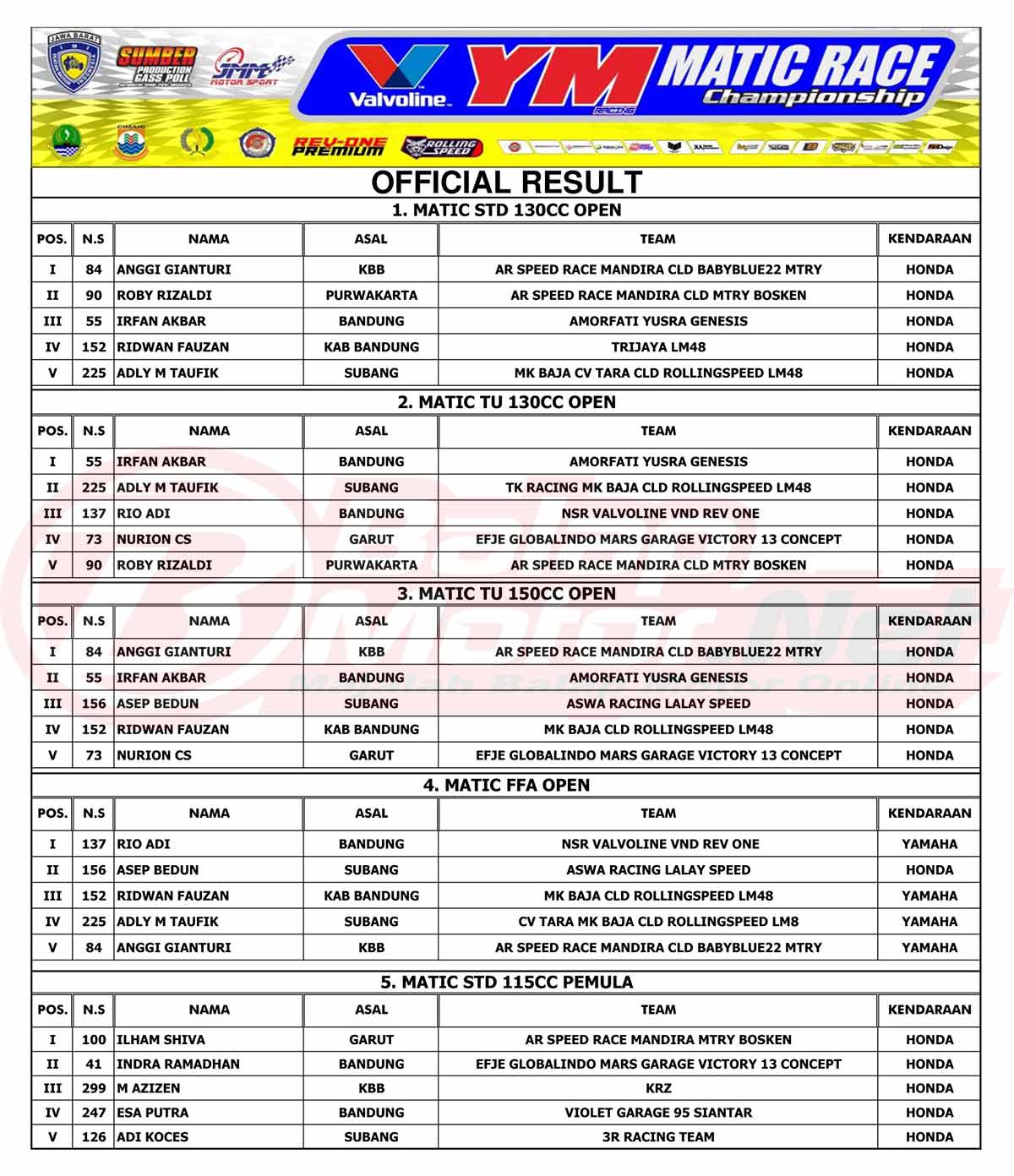 BalapMotor.Net – Berikut merupakan hasil juara dari gelaran Valvoline YM Matic Race Championship 2023 yang digelar di sirkuit NP Brigif 15 Kujang II Cimahi, Jawa Barat pada 25 Februari 2023. (**)