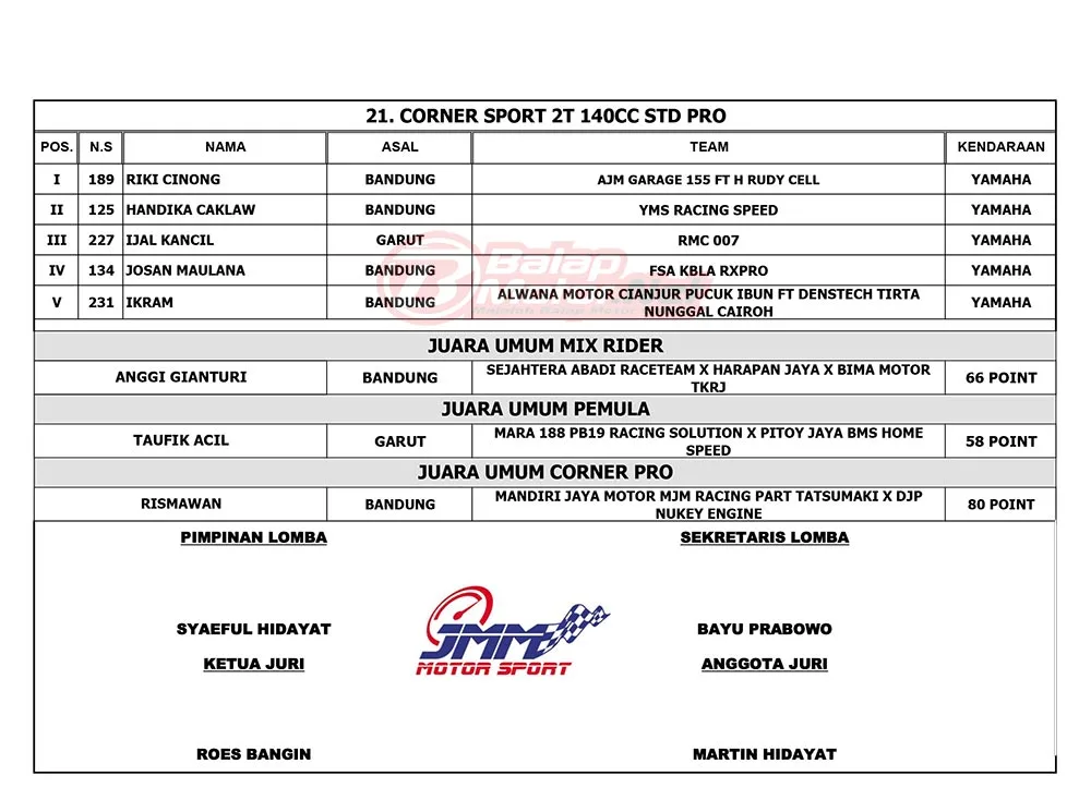 BalapMotor.Net – Berikut merupakan hasil juara dari gelaran West Java Road Race Championship 2024 yang berlangsung di sirkuit NP Brigif Cimahi, Jawa Barat pada hari Sabtu 23 November 2024.