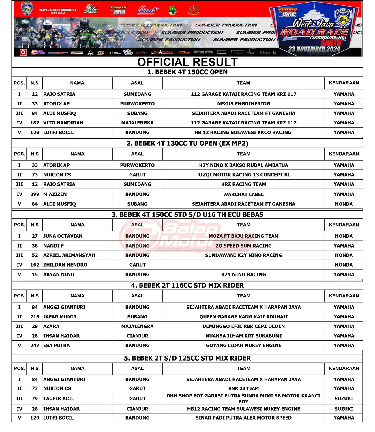 BalapMotor.Net – Berikut merupakan hasil juara dari gelaran West Java Road Race Championship 2024 yang berlangsung di sirkuit NP Brigif Cimahi, Jawa Barat pada hari Sabtu 23 November 2024.