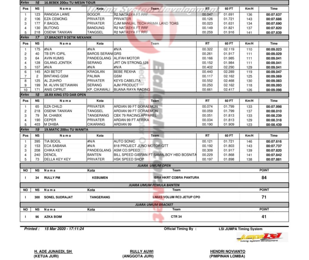 BalapMotor.Net – Berikut kami paparkan hasil kejuaraan PBS Drag Bike Open 2020 yang berlangsung di sirkuit NP. Boru Jl. Raya Syeh Nawawi Al Bantani, Serang – Banten pada 14-15 Maret 2020. | Yugo