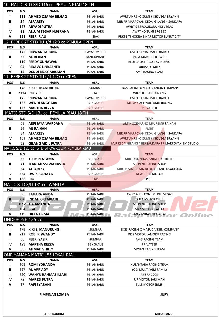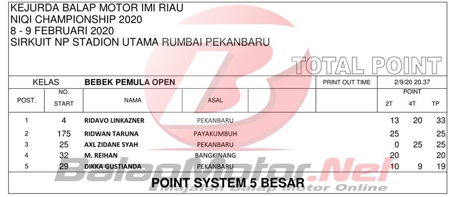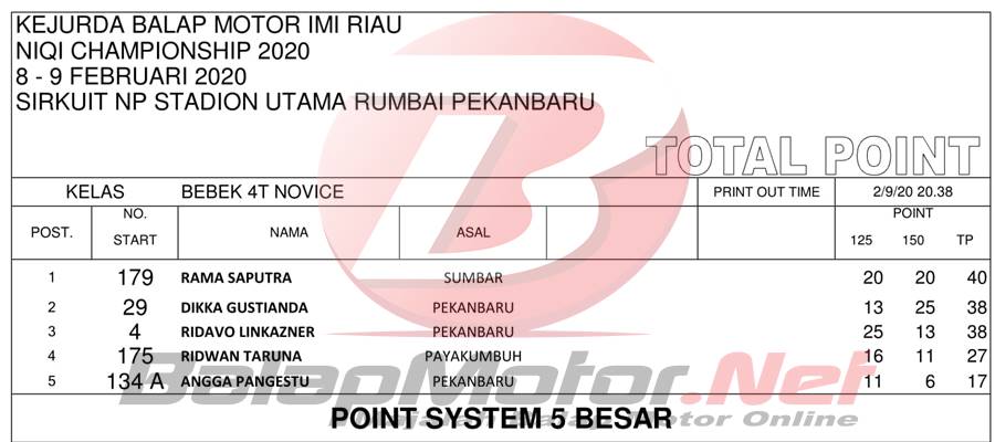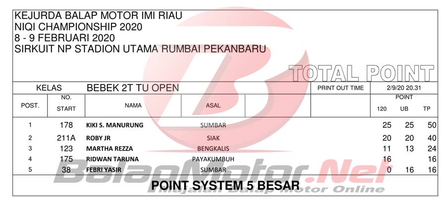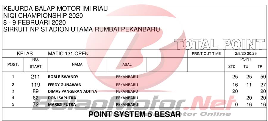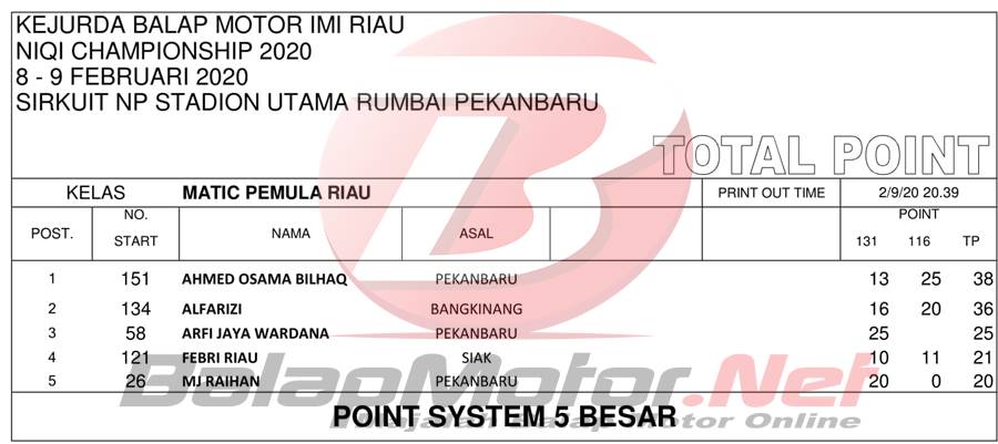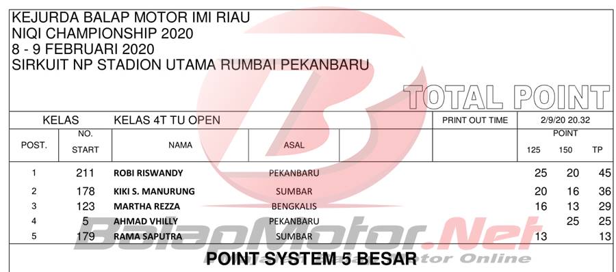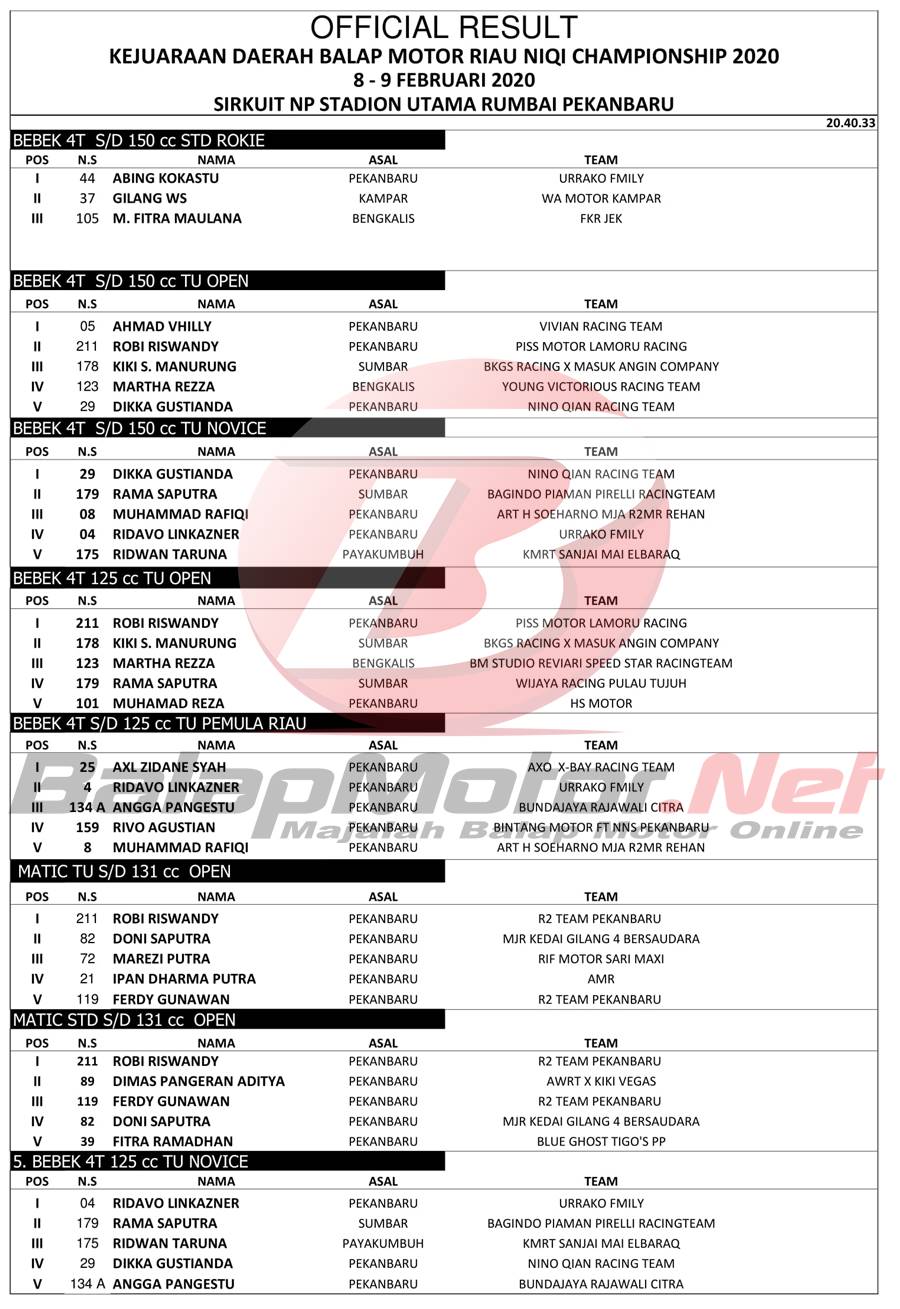 BalapMotor.Net – Berikut merupakan hasil official result dari gelaran Kejuaraan Daerah Balap Motor Riau Niqi Championship 2020 yang berlangsung di sirkuit NP Stadion Utama Rumbai, Pekanbaru, Riau pada 8-9 Februari 2020. | Halim