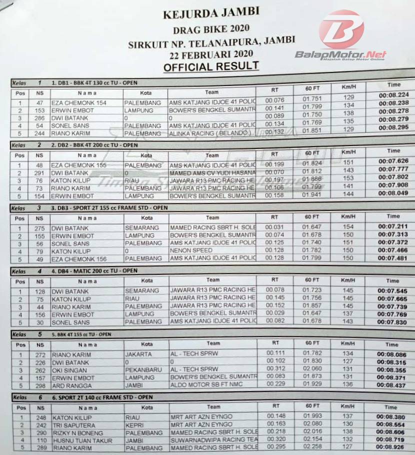 BalapMotor.Net – Berikut merupakan hasil resmi dari gelaran Kejurda Jambi Drag Bike 2020 putaran 1 yang berlangsung di sirkuit NP. Telanaipura, Jambi pada 22 Februari 2020. Yuk pantengin gaes. | Budy