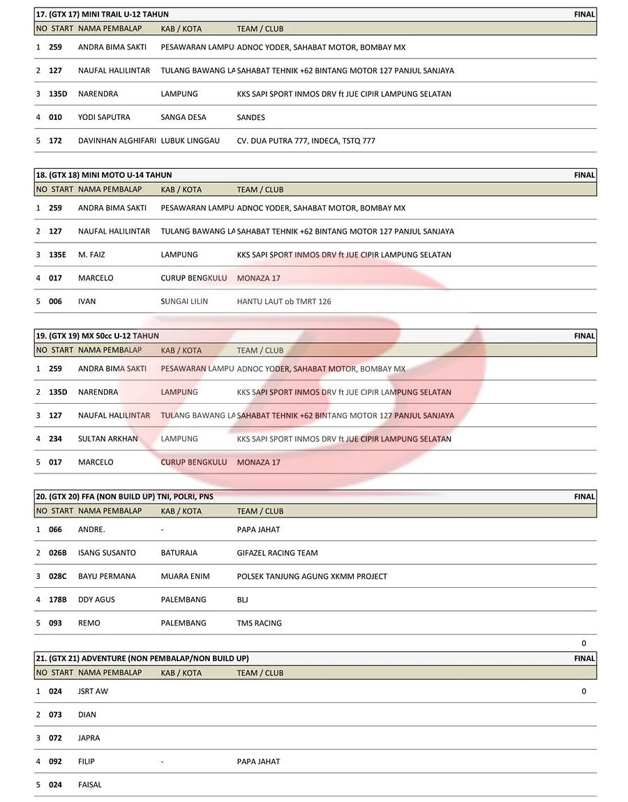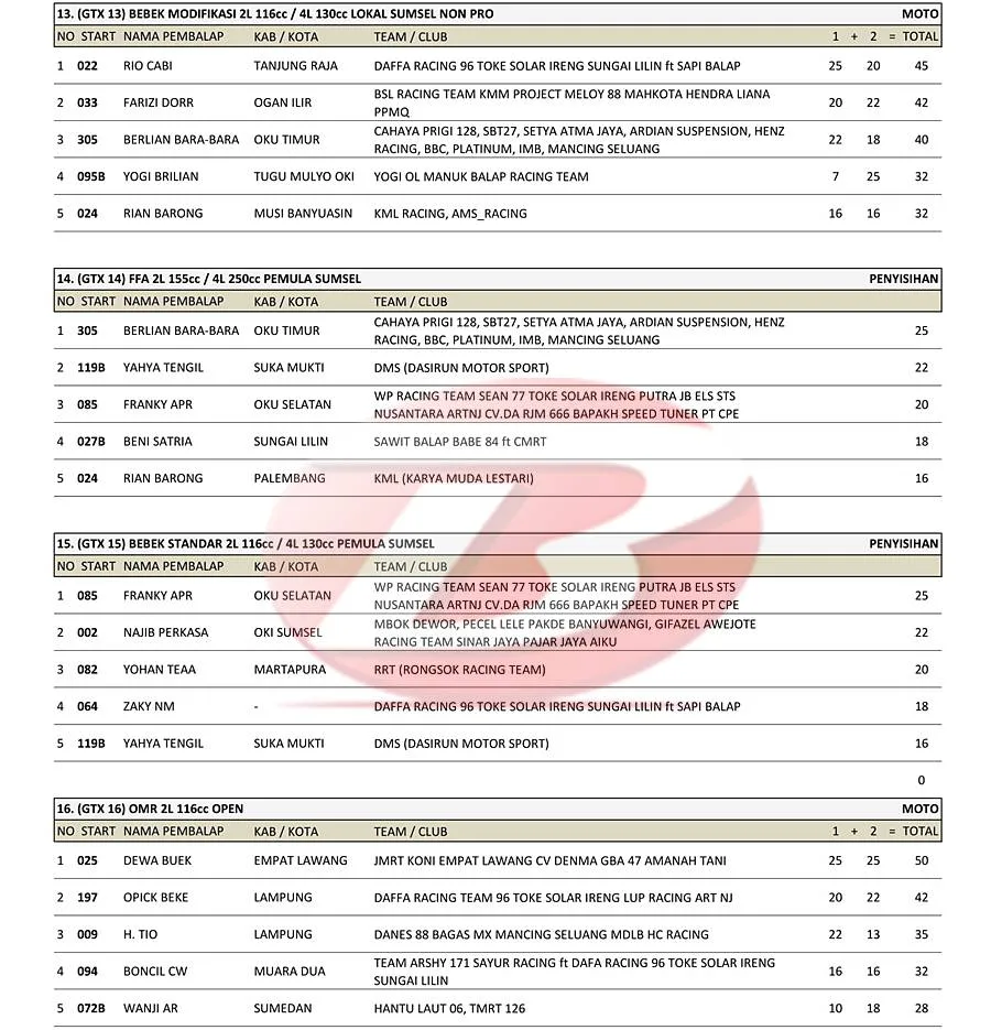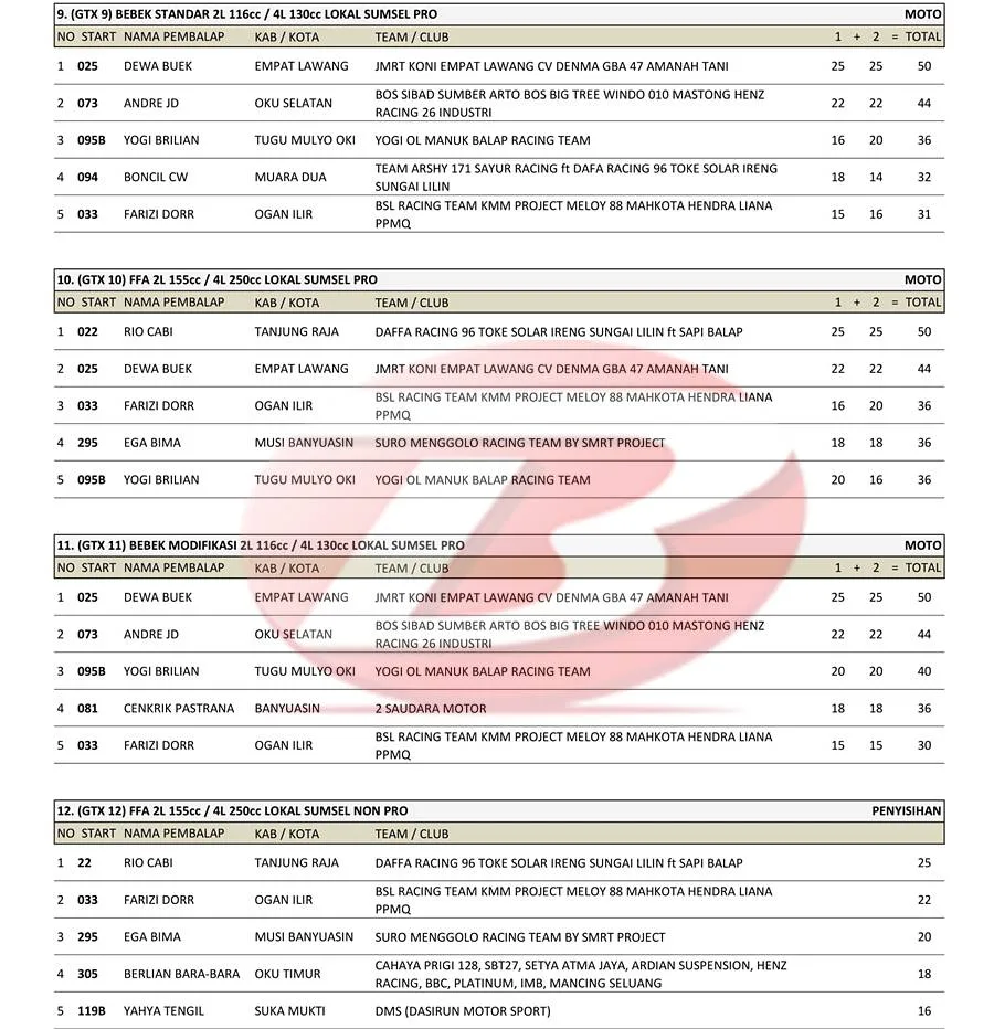 BalapMotor.Net – Berikut merupakan hasil Kejuaraan Nasional Grasstrack Round 2 Region 1B Palembang yang berlangsung di sirkuit Jakabaring Sport Center Palembang, Sematera Selatan pada 16-17 Agustus 2025. (**)