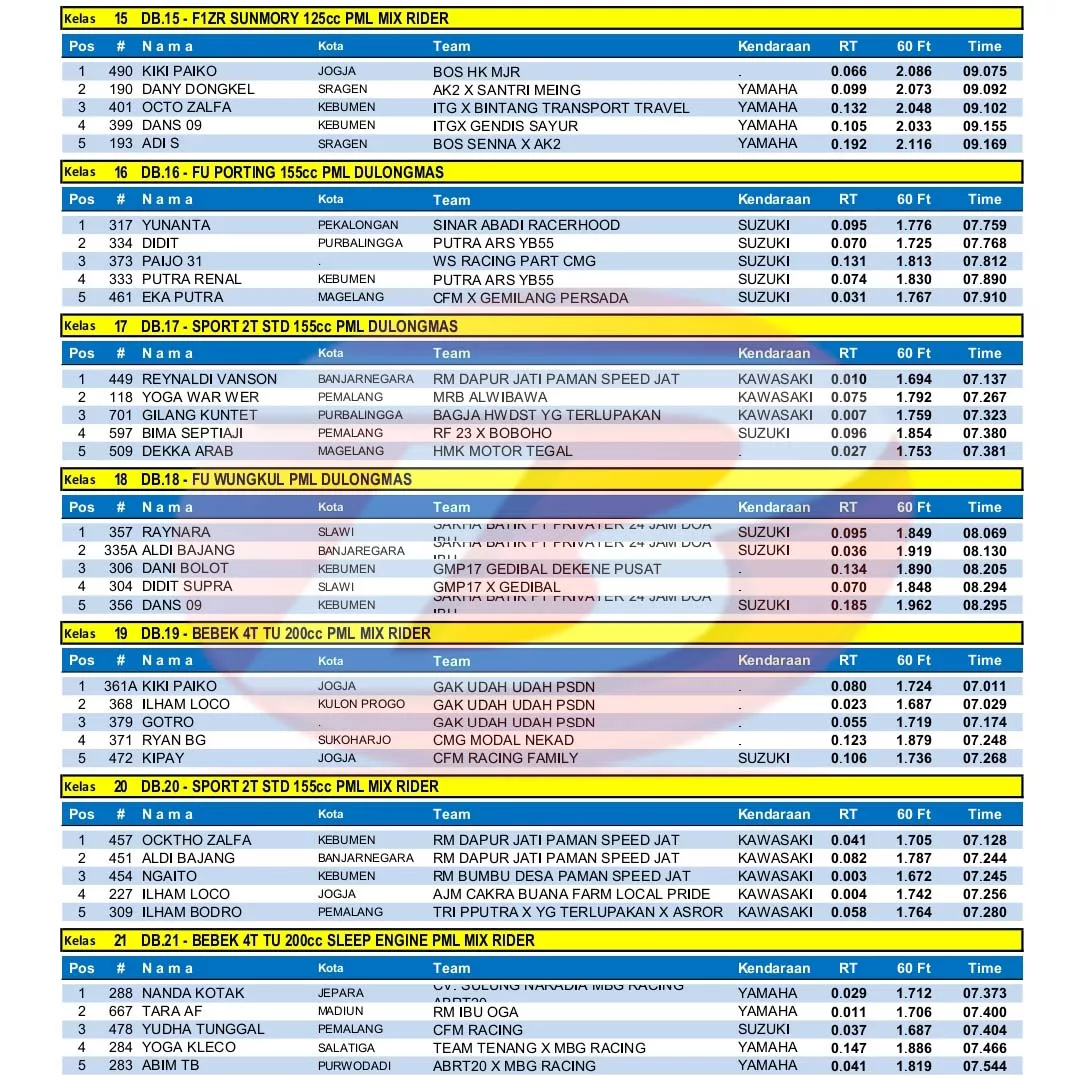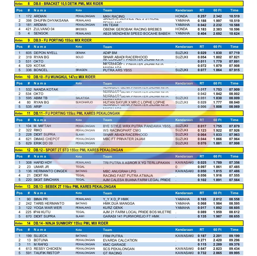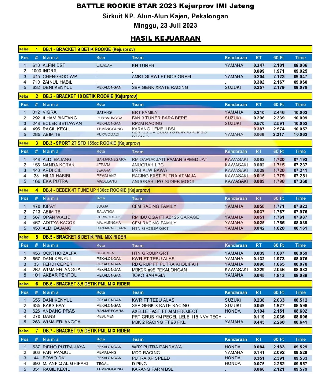 BalapMotor.Net – Berikut merupakan hasil juara Kejurprov IMI Jateng Drag Bike Battle Rookie Star putaran keempat yang berlangsung di sirkuit NP. Alun-alun Kajen , Pekalongan pada 23 Juli 2023. (***)