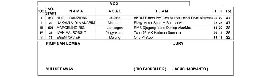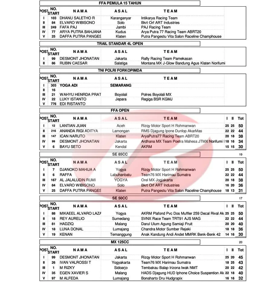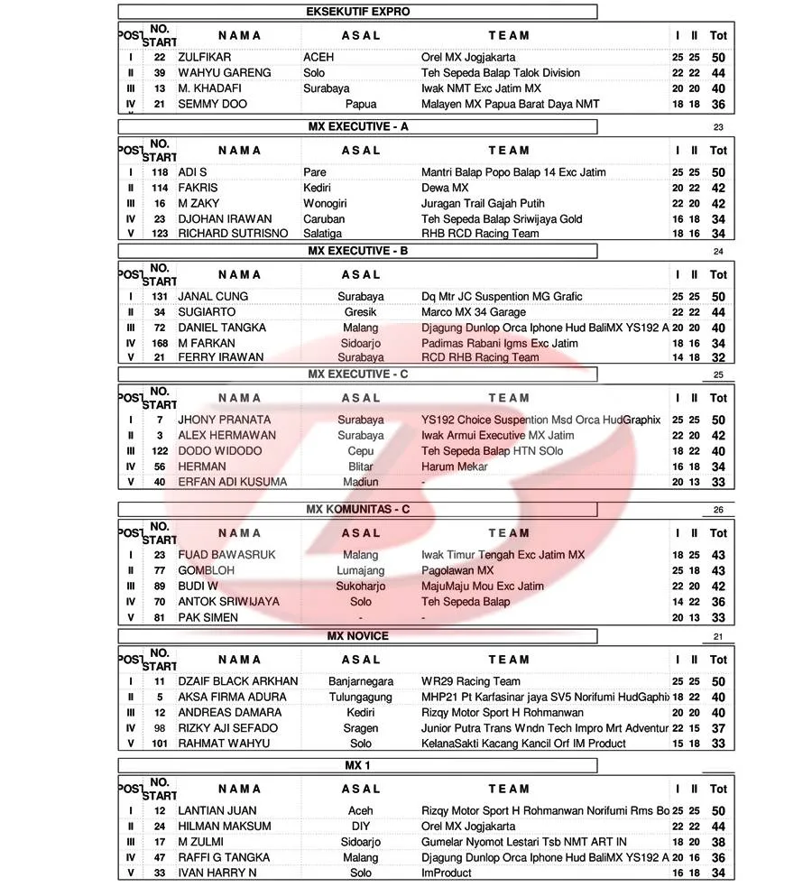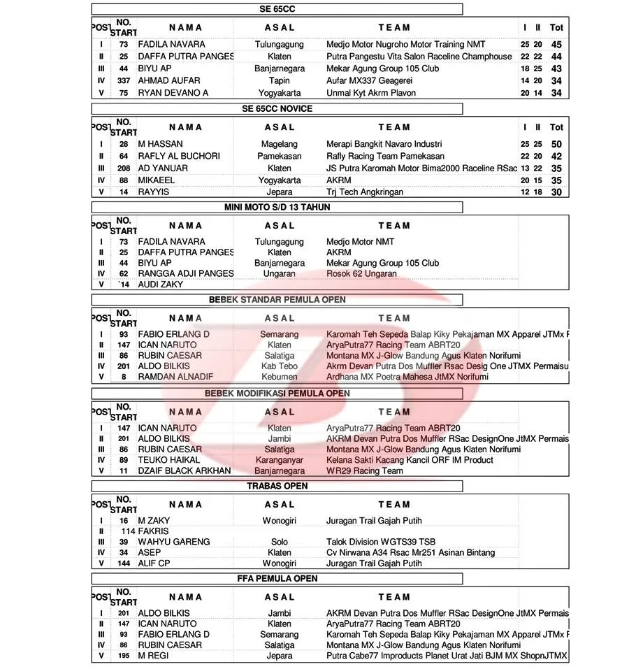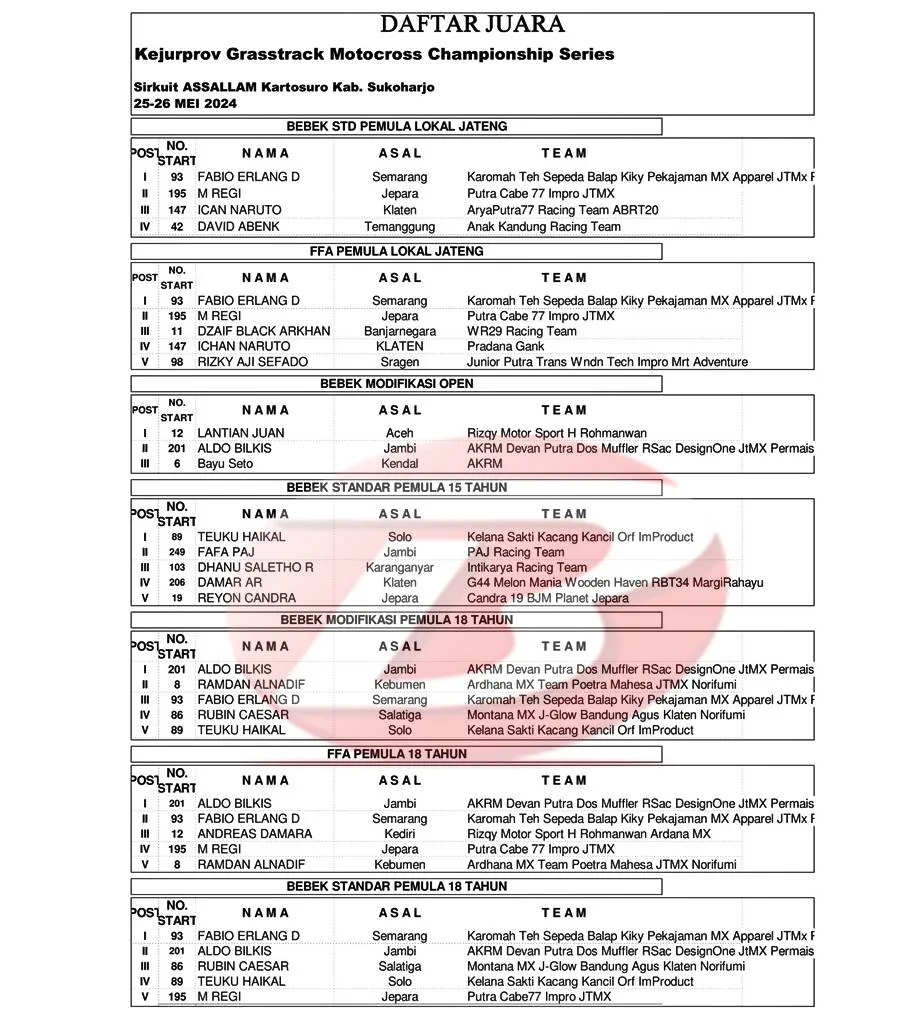 BalapMotor.Net – Berikut merupakan hasil kejuaraan garuk tanah Kejurprov Grasstrack & Motocross Championship Series 2024 yang berlangsung di sirkuit Assallam, Kartasura, Sukoharjo, Jawa Tengah pada 25-26 Mei 2024. (***)