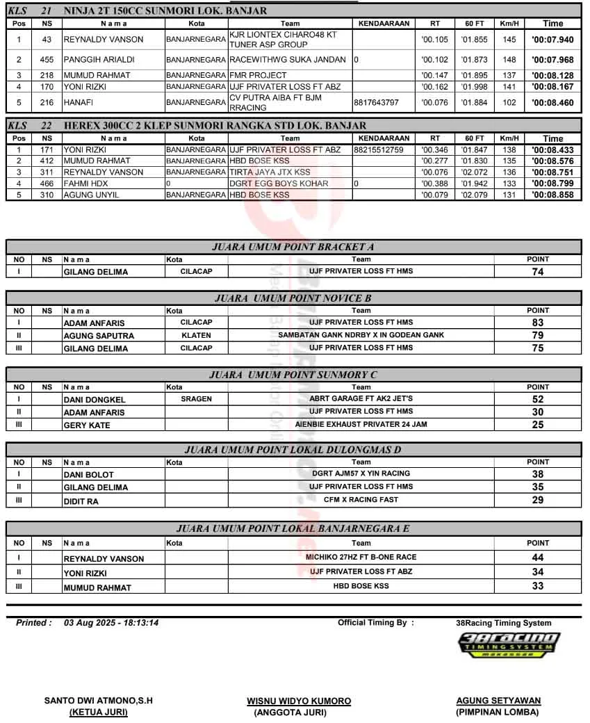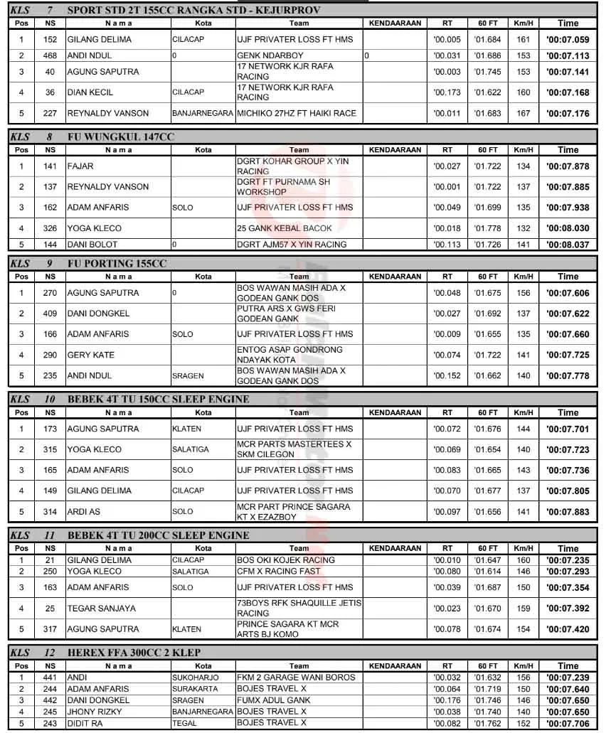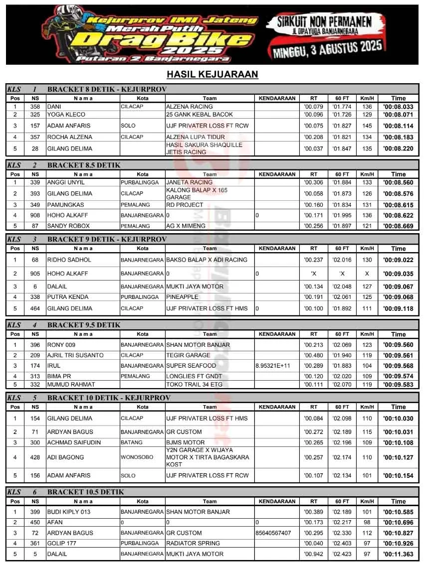 BalapMotor.Net – Berikut merupakan hasil Putaran 2 Kejurprov IMI Jateng Merah Putih Drag Bike yang berlangsung di sirkuit NP. Jl. Dipayuda, Banjarnegara, Jawa Tengah pada Minggu 3 Agustus 2025. (**)