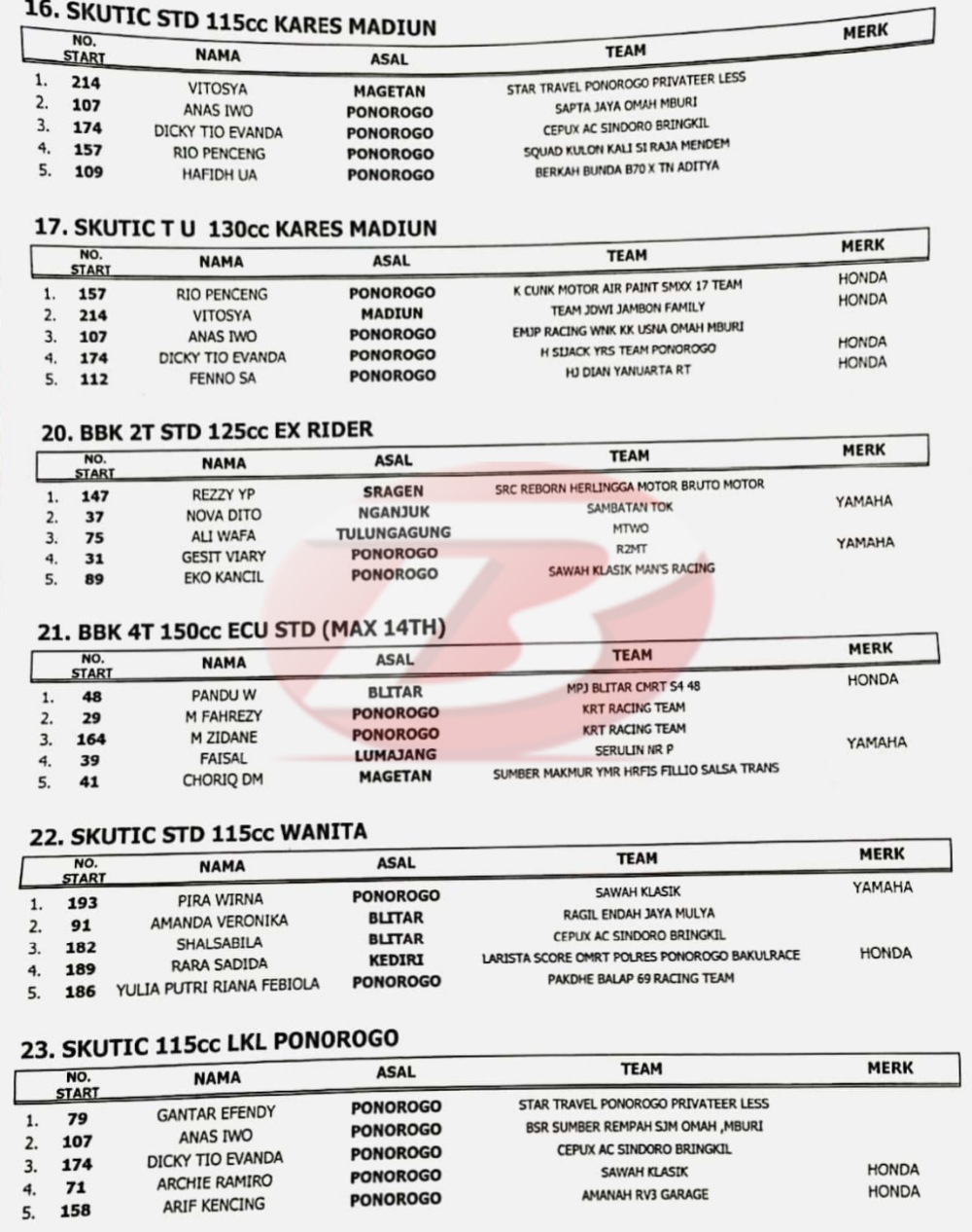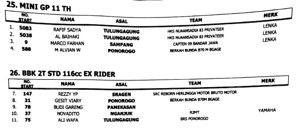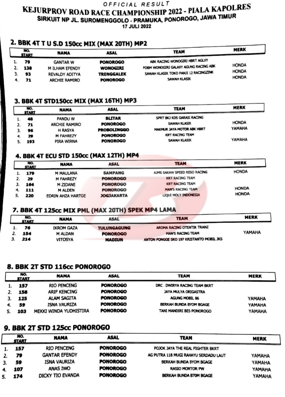 Hasil Kejurprov Road Race Ponorogo – Jatim 17 Juli 2022Penulis Yugo Aol - 17/07/2022 BalapMotor.Net – Berikut kami paparkan hasil kejuaraan balap motor bertajuk Kejurprov Road Race Championship 2022 – Piala Kapolres yang digelar di Jl. Suromenggolo, Ponorogo, Jawa Timur pada Minggu 17 Juli 2022.