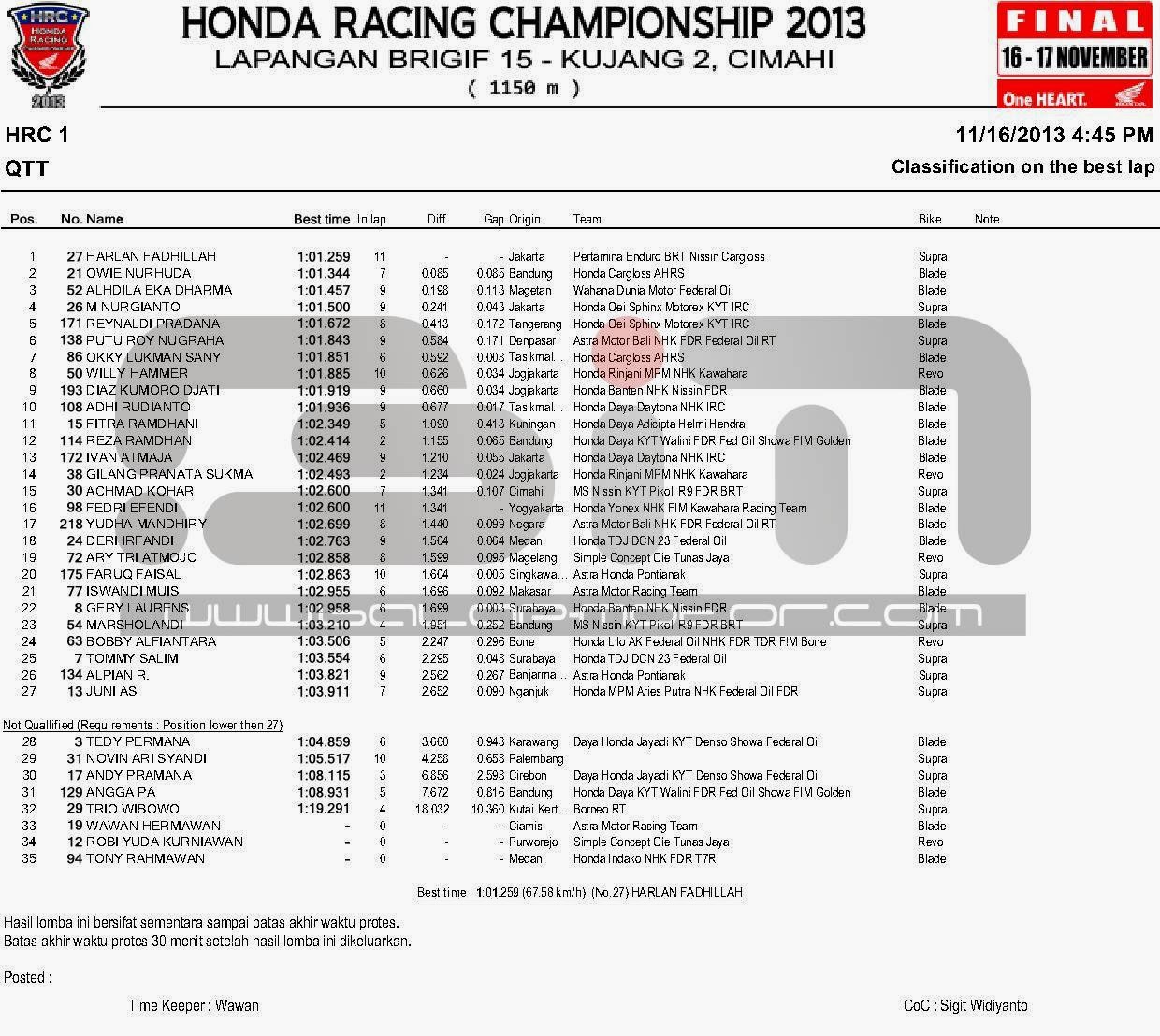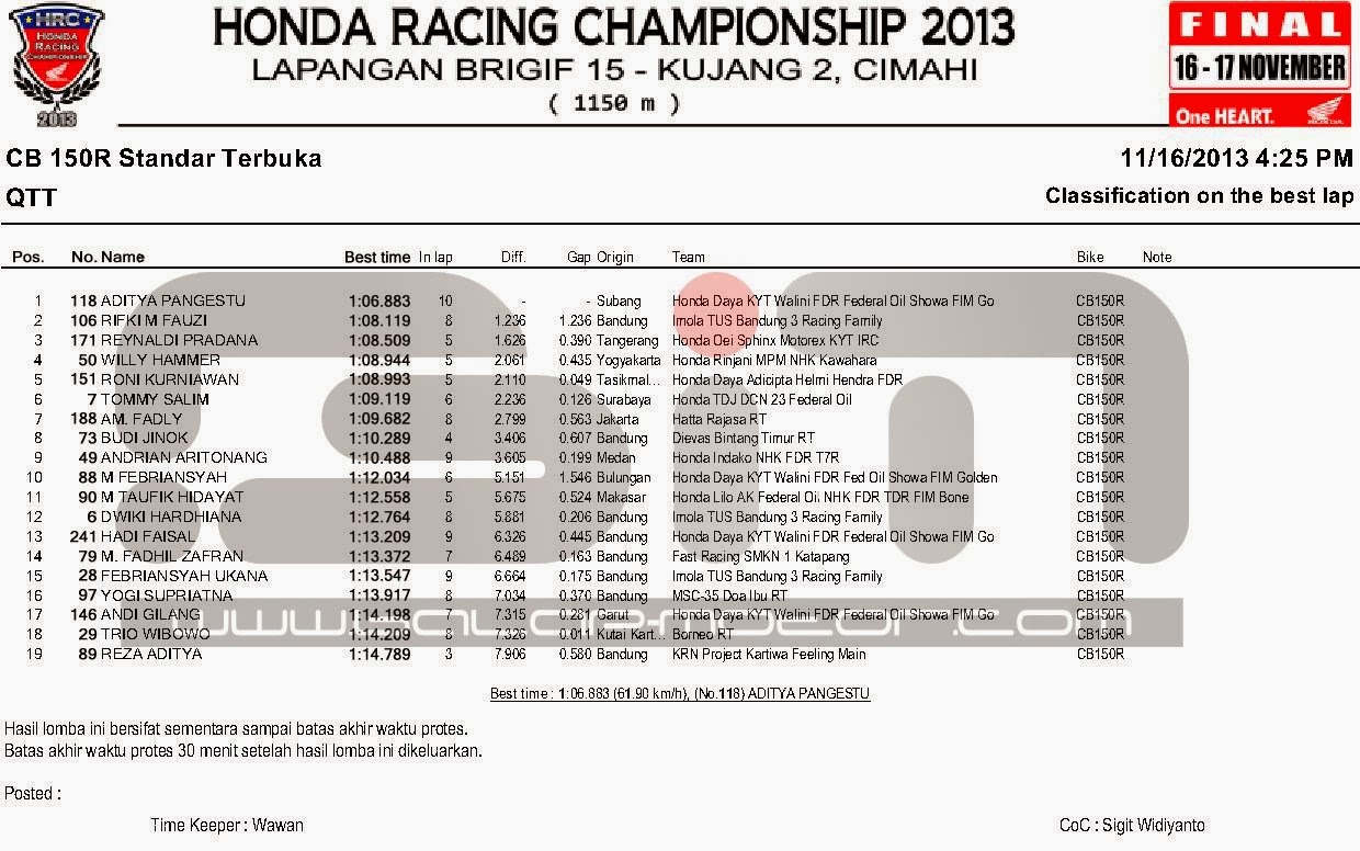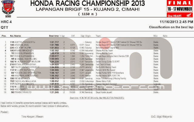 HASIL KOMPLIT QTT FINAL HONDA RACING CHAMPIONSHIP CIMAHI 16 NOVEMBER 2013Penulis Balapmotor.net - 16/11/2013