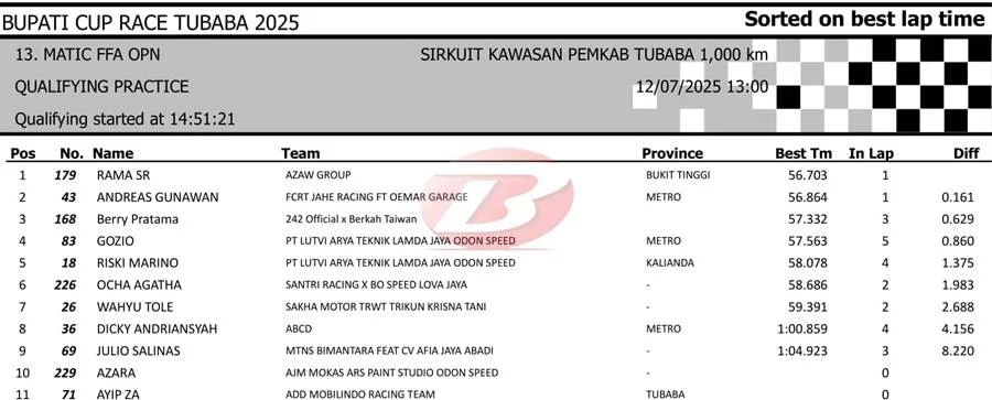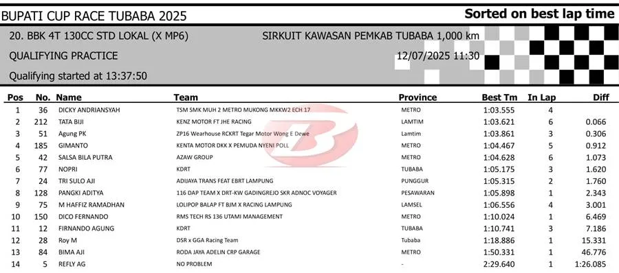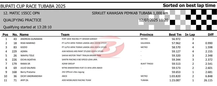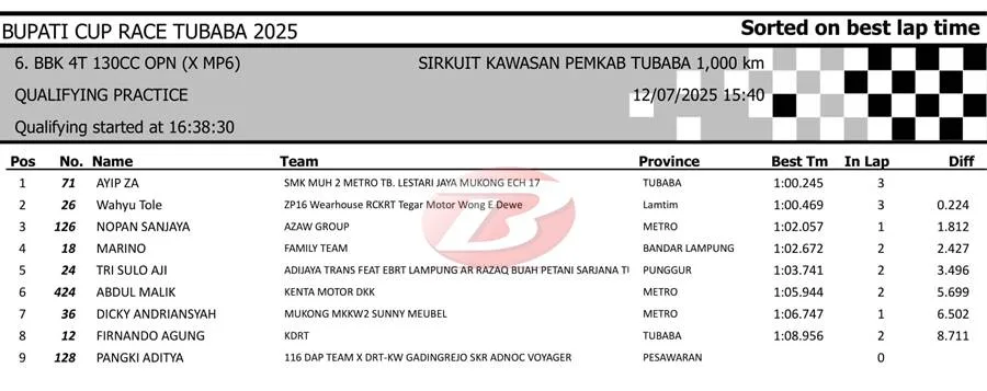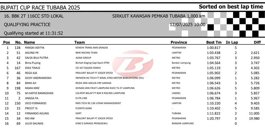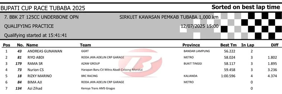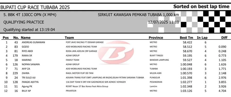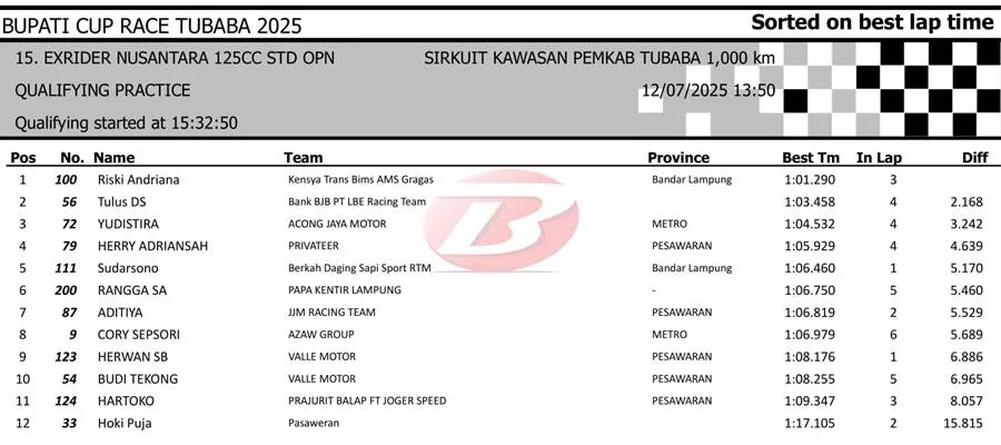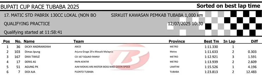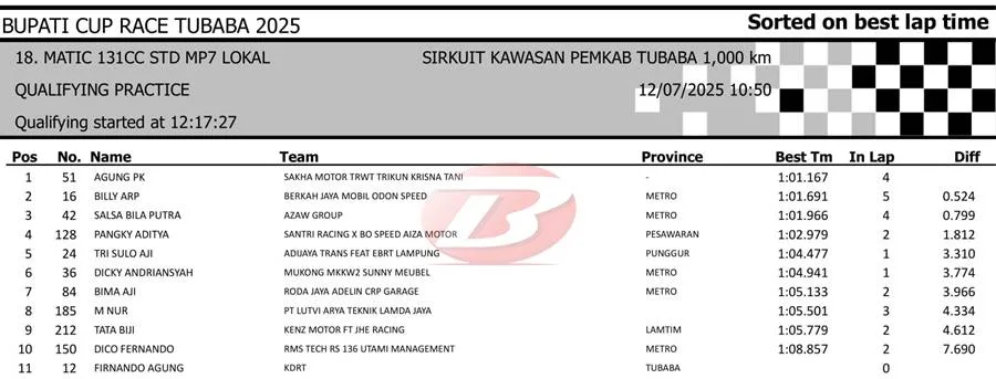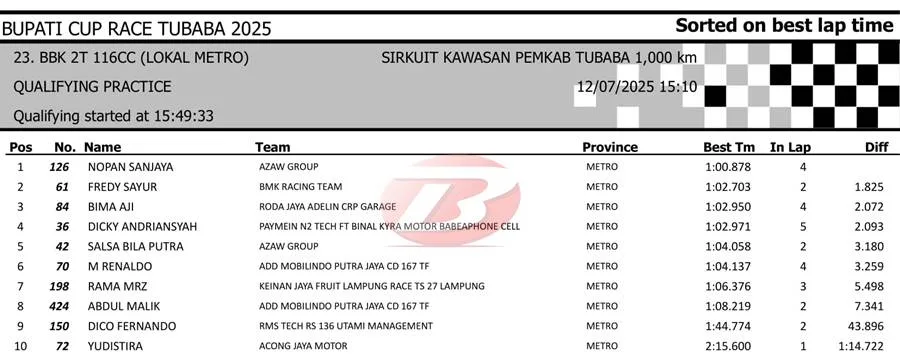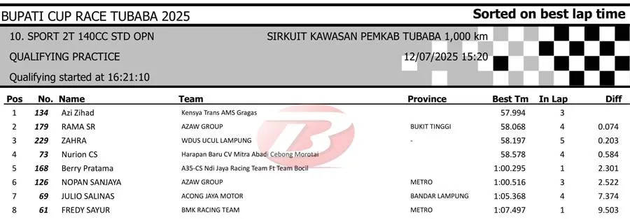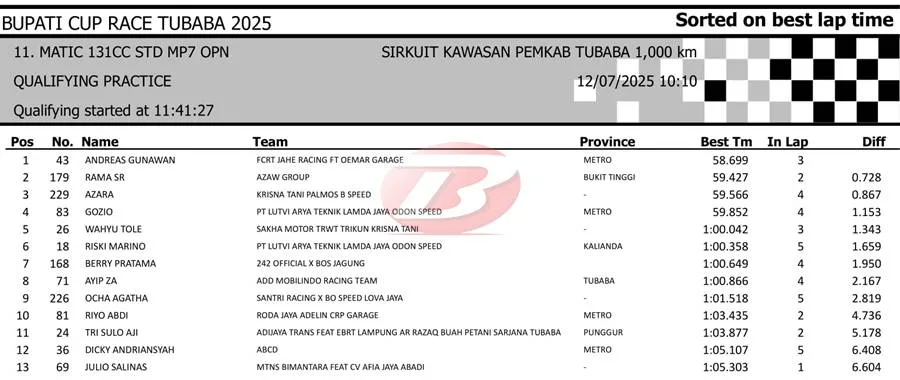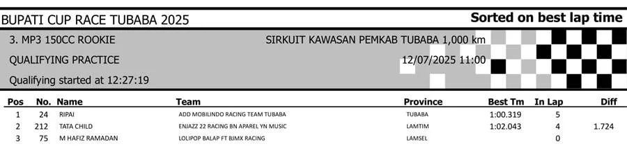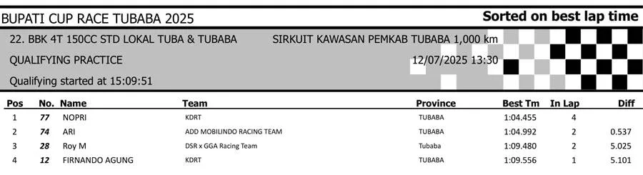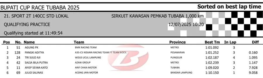 BalapMotor.Net – Berikut merupakan hasil sesi kualifikasi kejuaraan Bupati Cup Race Tulang Bawang Barat Road Race Championship 2025 yang berlangsung di sirkuit NP. Area Komplek Perkantoran Pemerintahan Kabupaten TUBABA pada Sabtu 12 Juli 2025. (**)