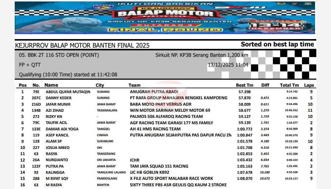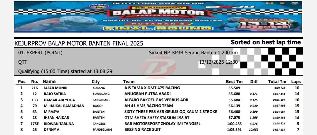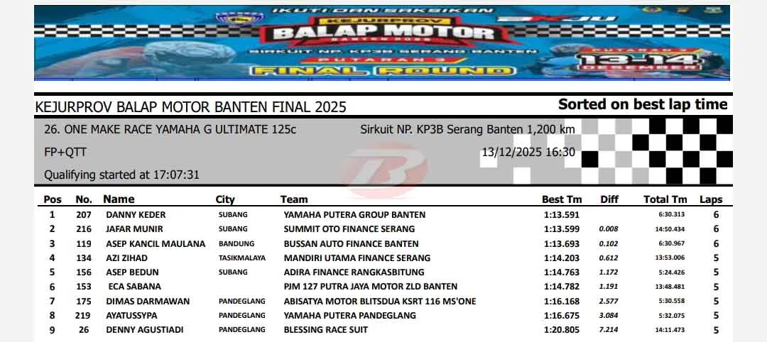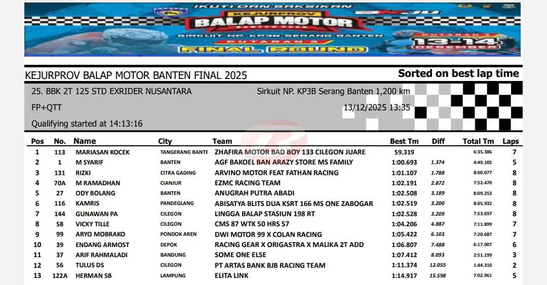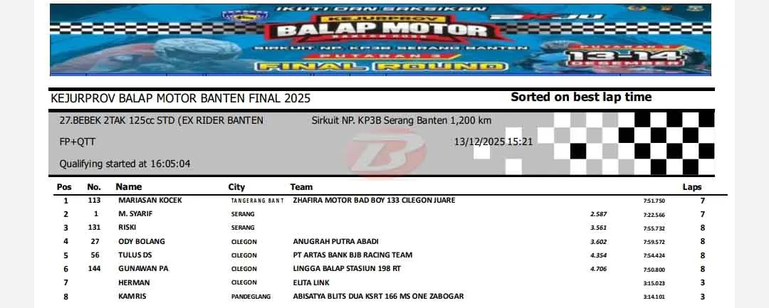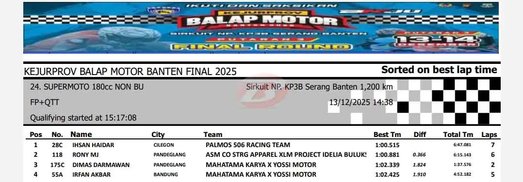 BalapMotor.Net – Berikut merupakan hasil lengkap sesi kualifikasi Kejuaraan Provinsi Balap Motor Banten Seri 3 atau putaran final yang berlangsung di sirkuit NP. KP3B Serang pada Sabtu 13 Desember 2025. (**)